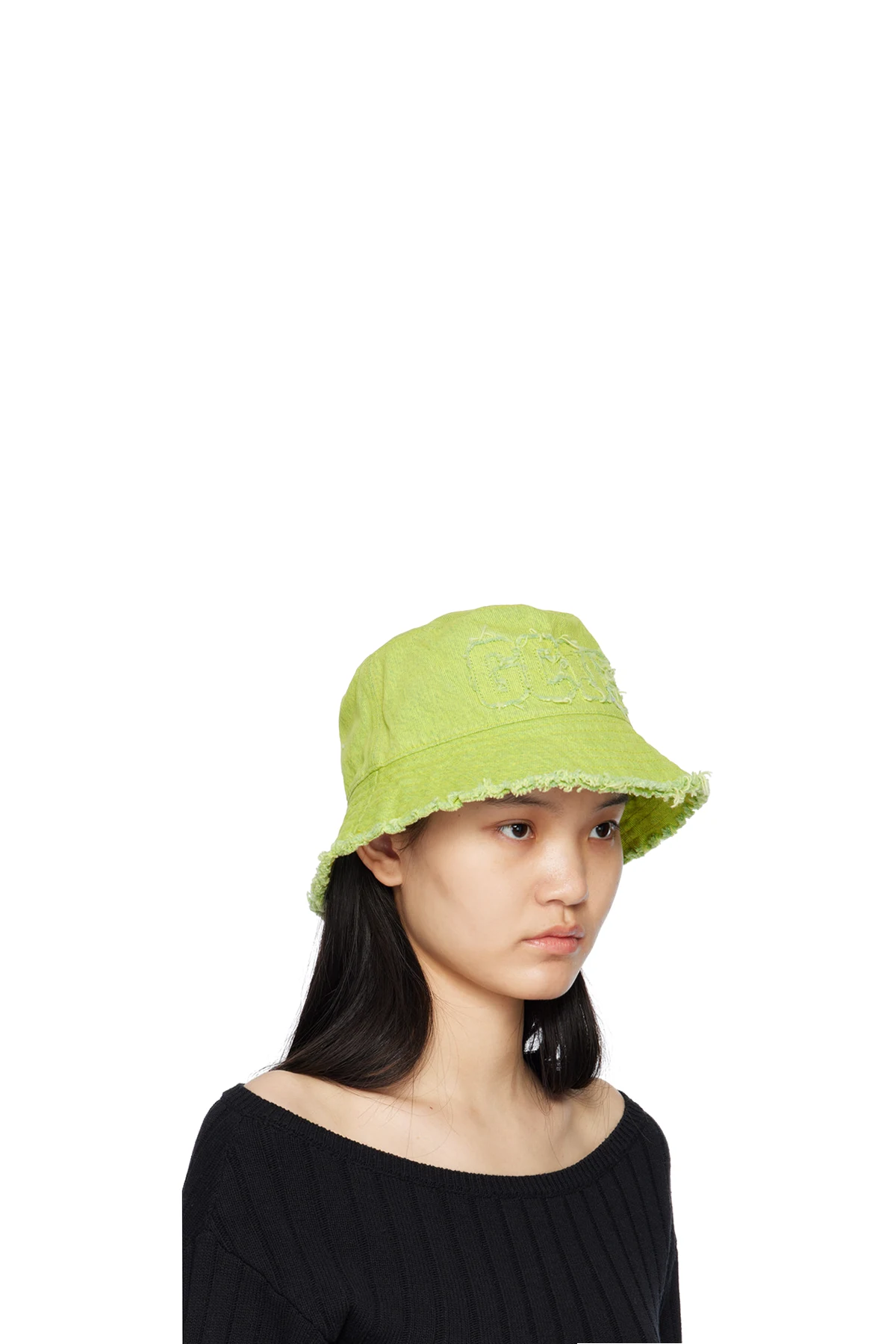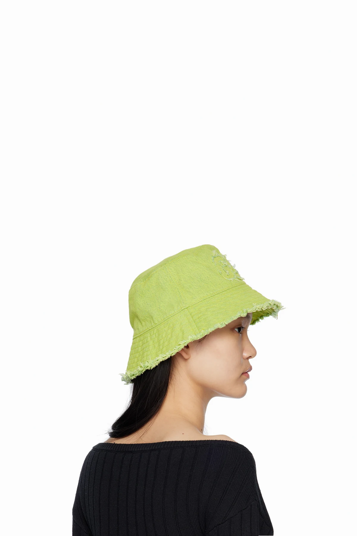 Overdyed non-stretch denim bucket hat in green. Distressing throughout.