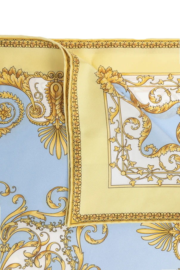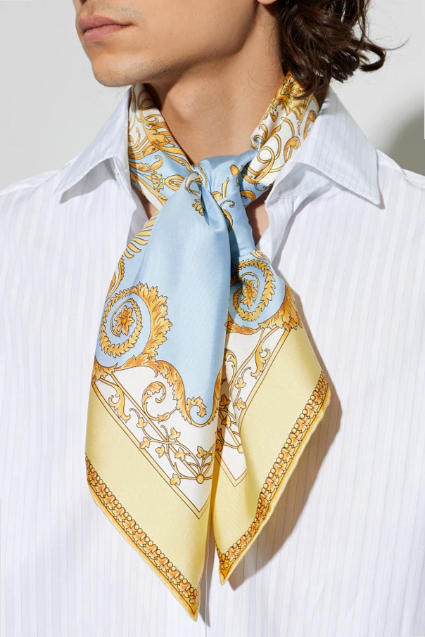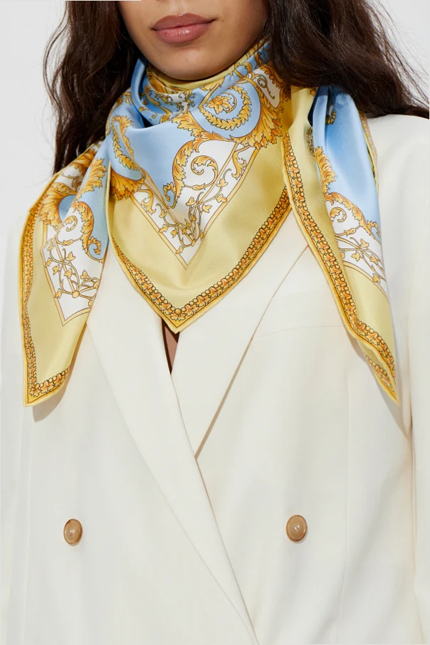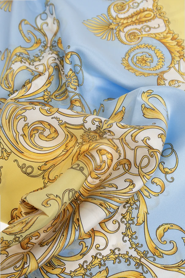 Experience refined sophistication with the Spring Barocco Silk Scarf by Versace. This classic square accessory showcases the exquisite luster and effortless drape of pure silk, delicately hand-finished with precise, elegant stitching along the edges. The design draws inspiration from rich Baroque heritage, featuring an intricate interplay of golden acanthus leaves, swirling ornamentation, and florid motifs—all meticulously arranged upon a serene blue backdrop, enhanced by hints of pastel yellow and crisp white. The absence of overt branding allows the opulent, harmonious pattern to truly shine, making this scarf an embodiment of timeless luxury.