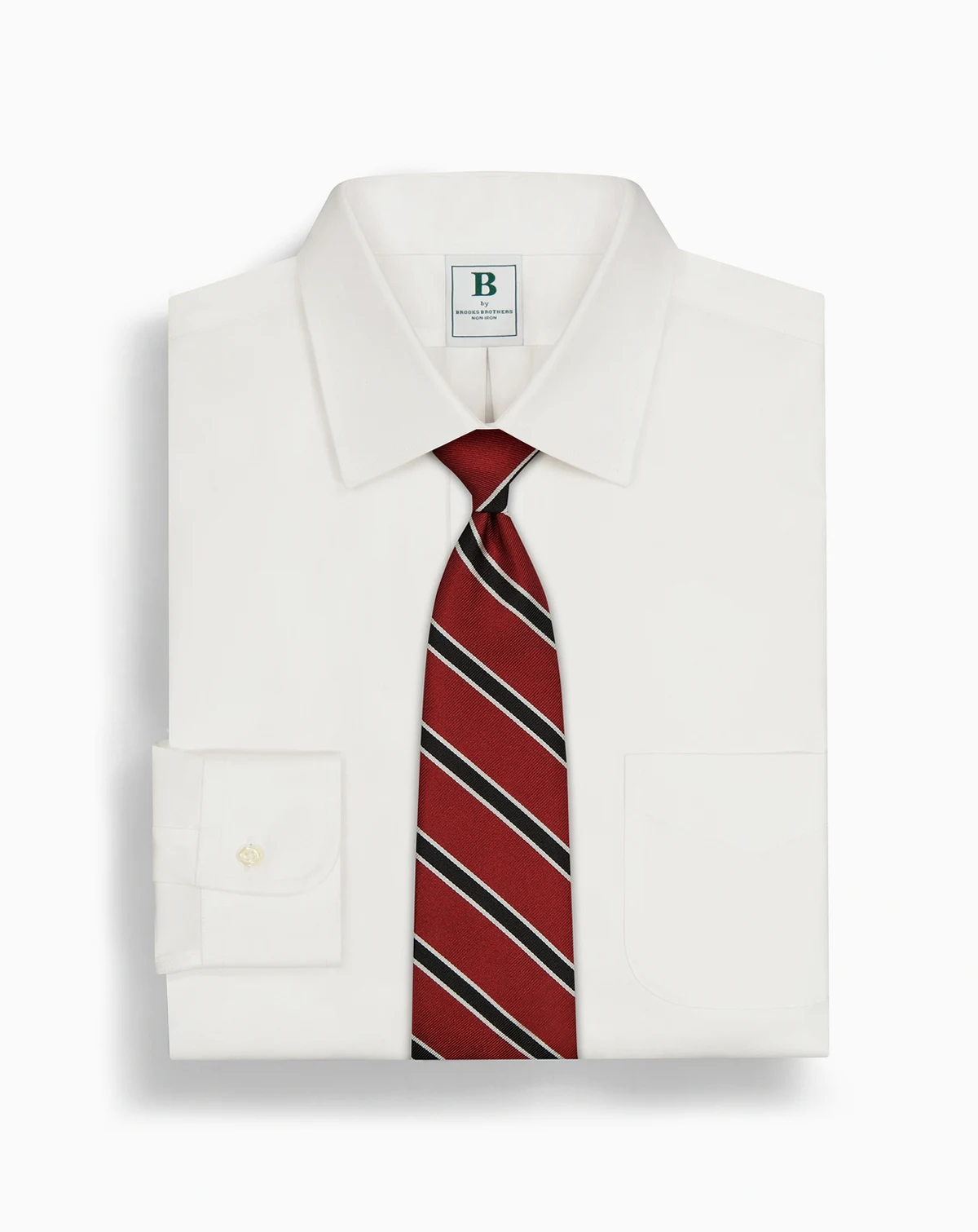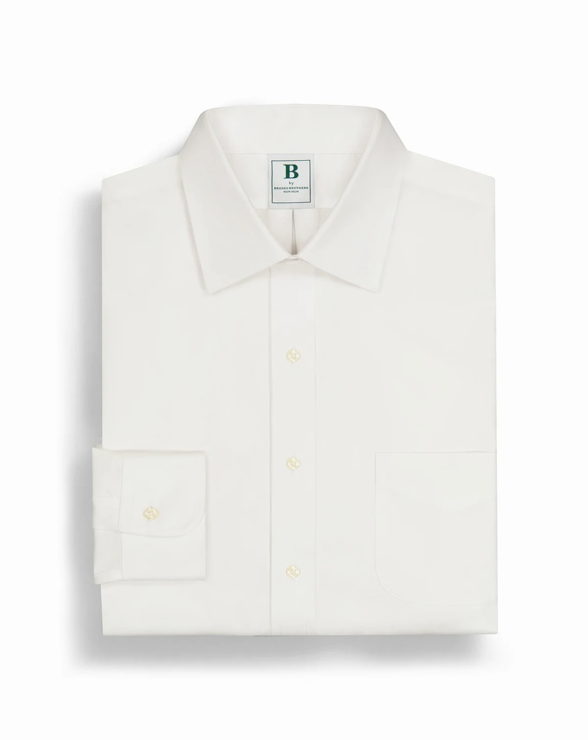 B by Brooks Brothers styles a non-iron cotton shirt with a versatile spread collar, which looks great with or without a necktie.