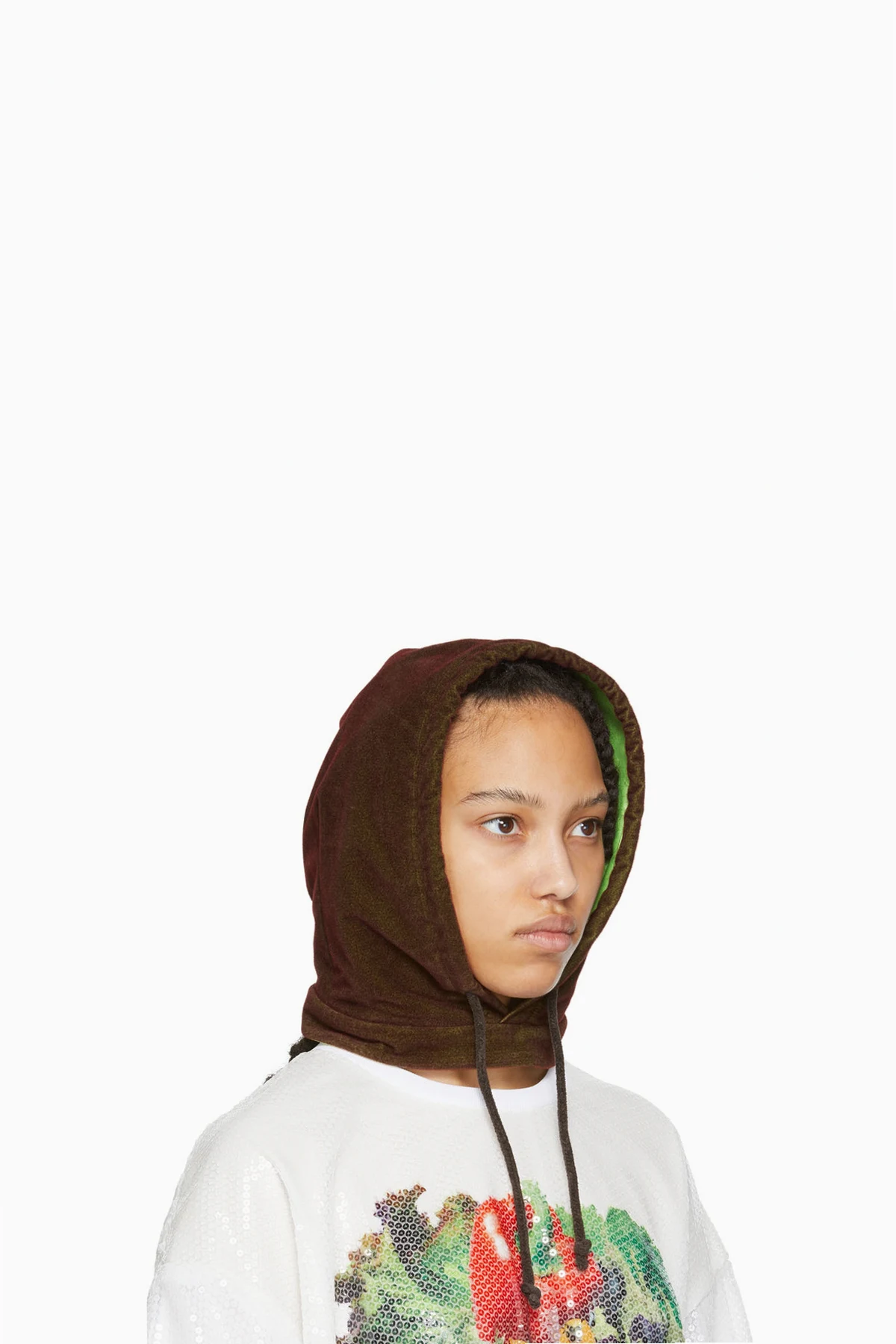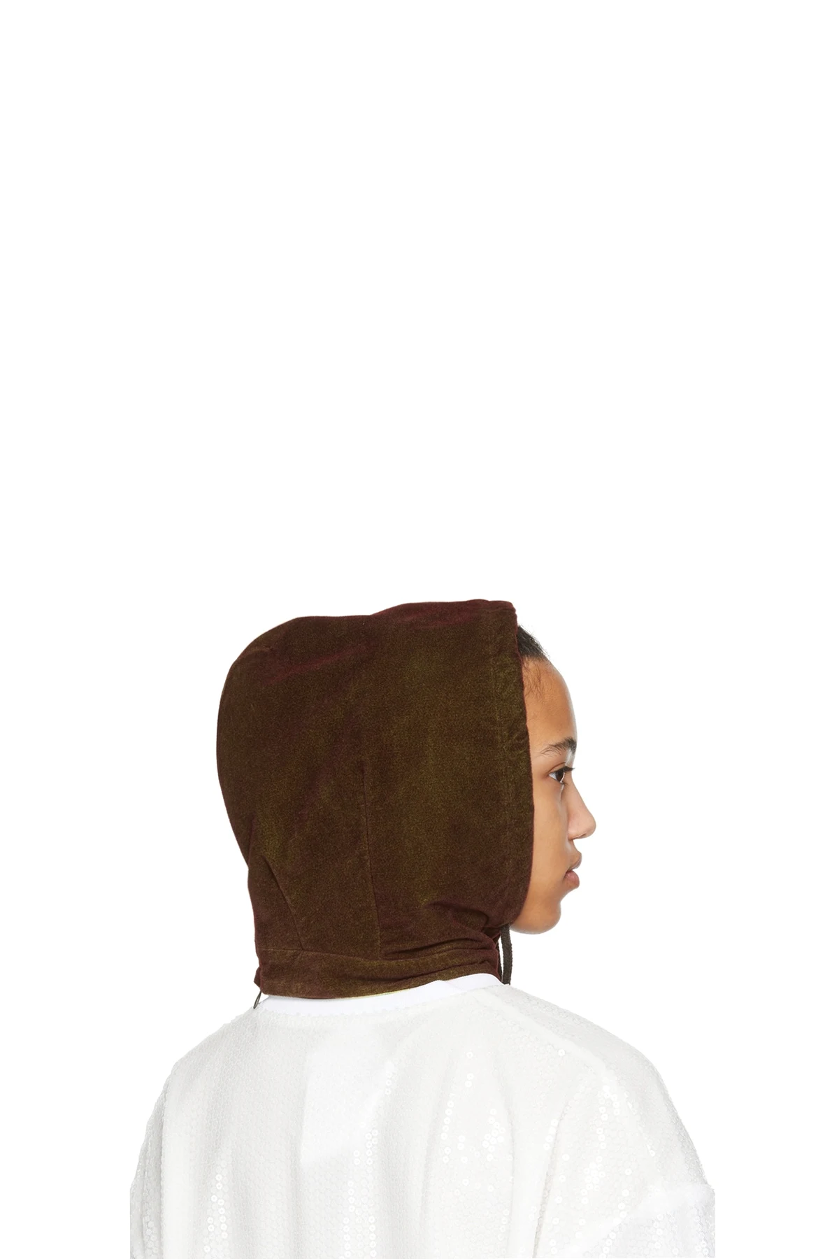 Polyurethane-coated velvet hood-style beanie in brown and green featuring embroidered logo patch in green, red, and white at face.
