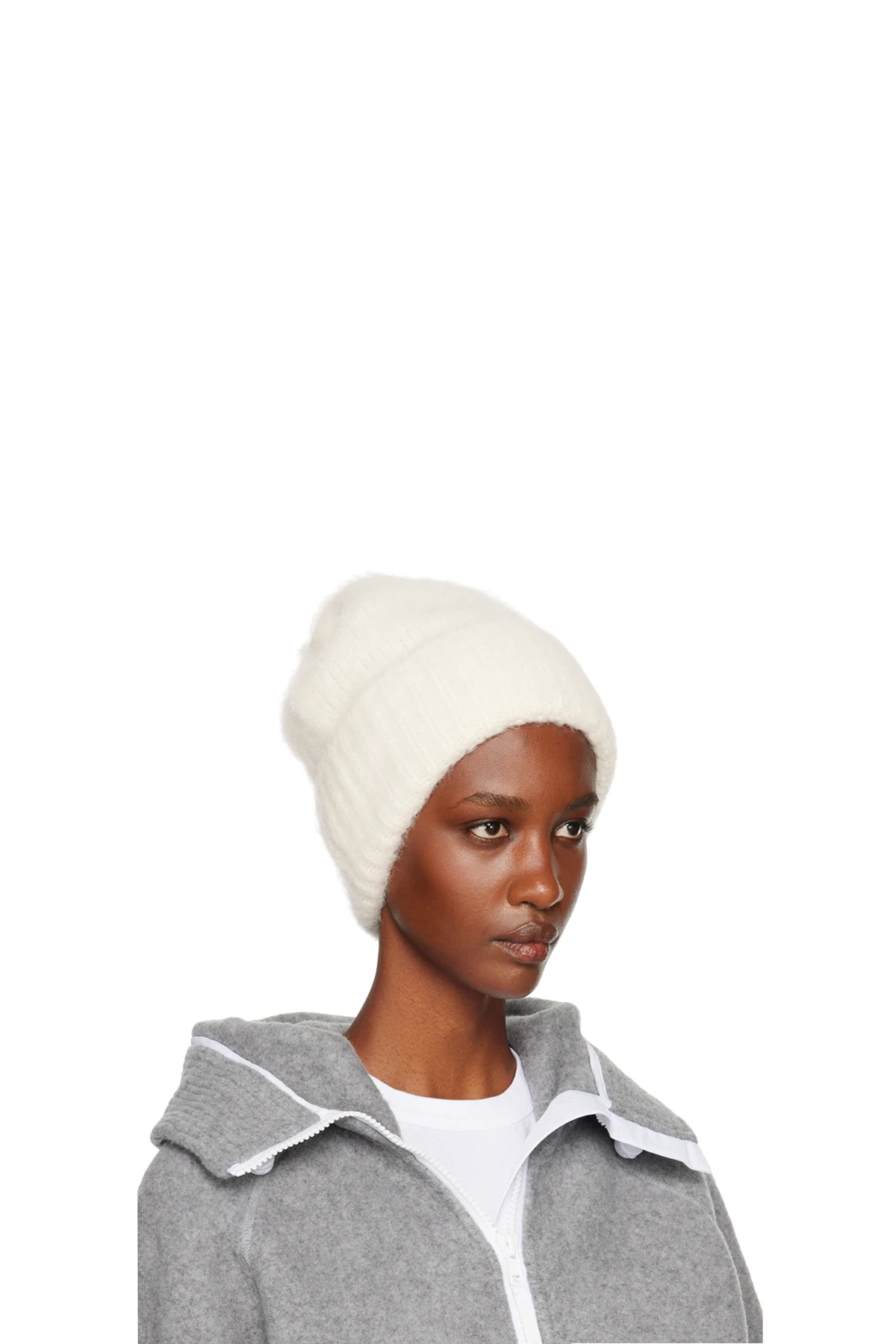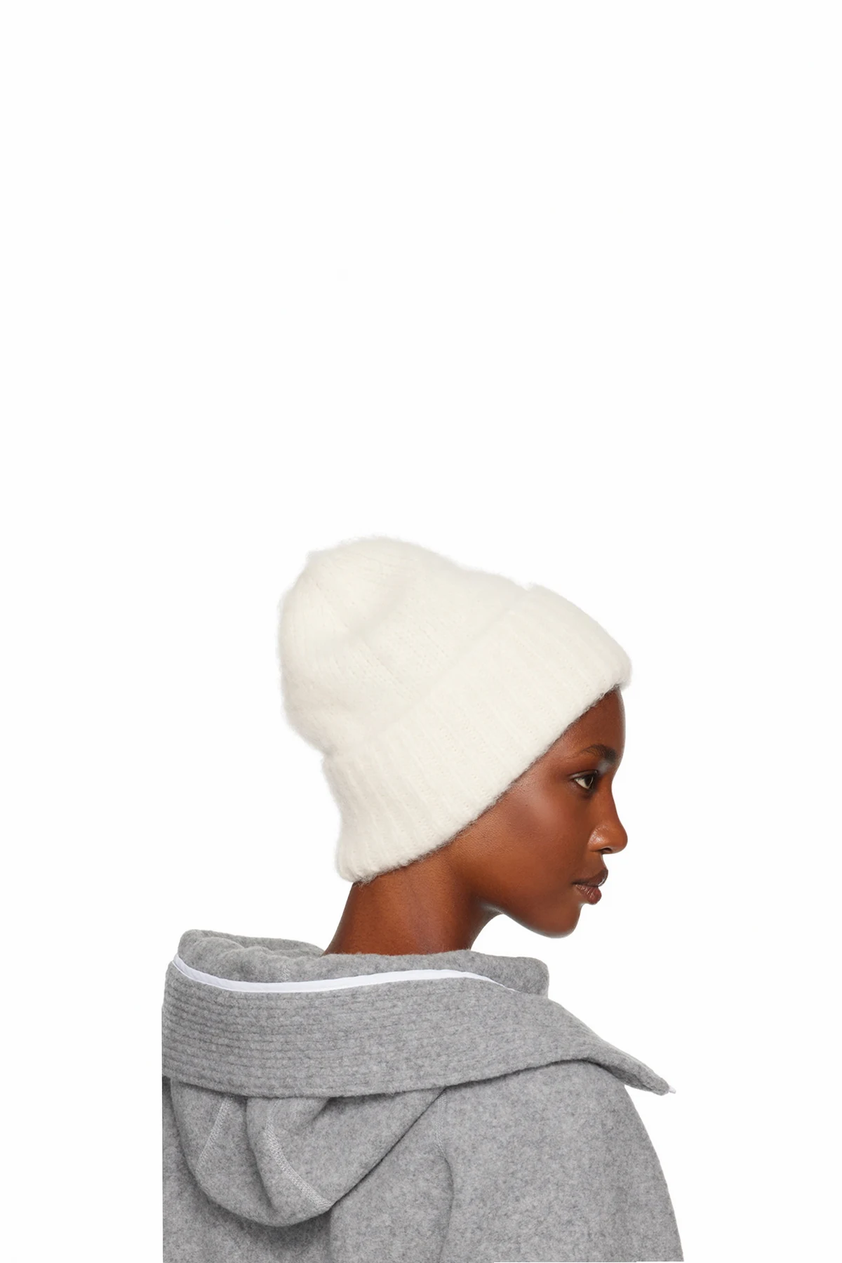 Brushed knit alpaca-blend beanie in off-white. Logo hardware at rib knit rolled brim.