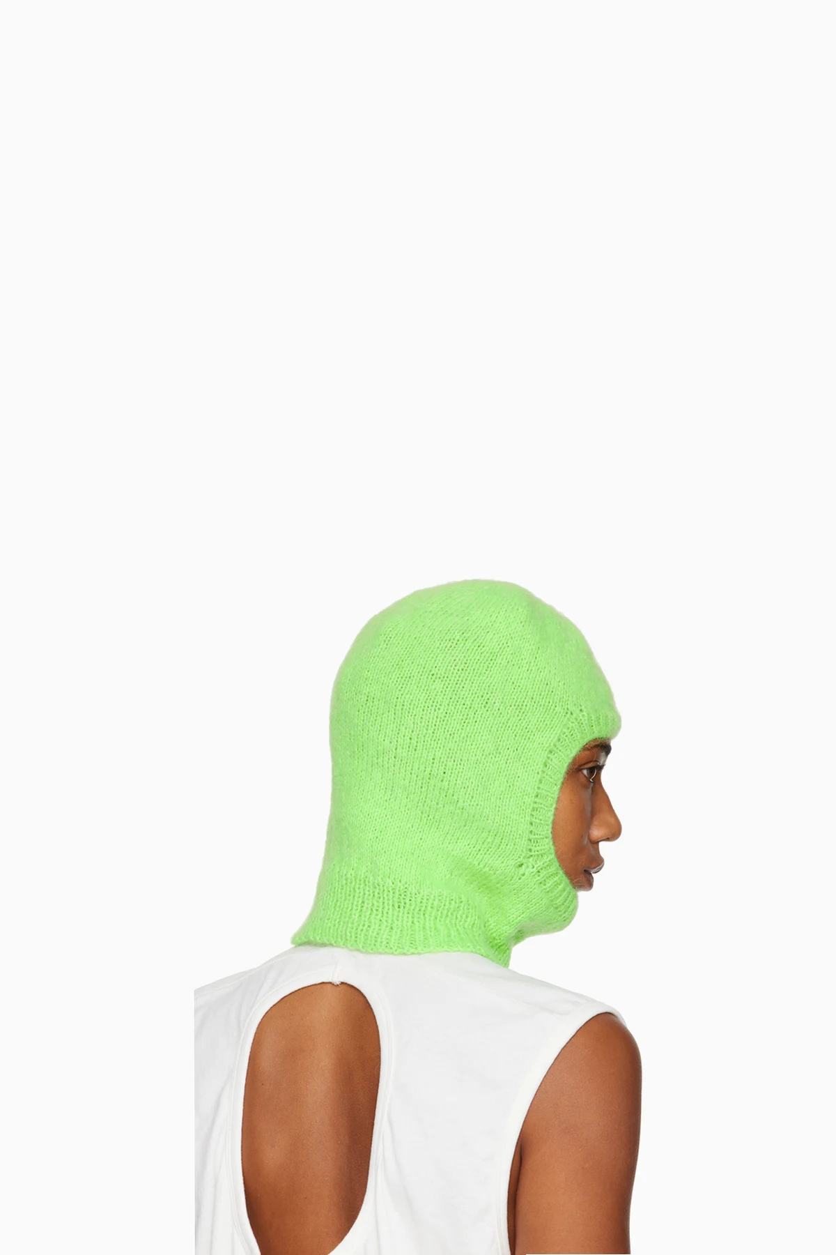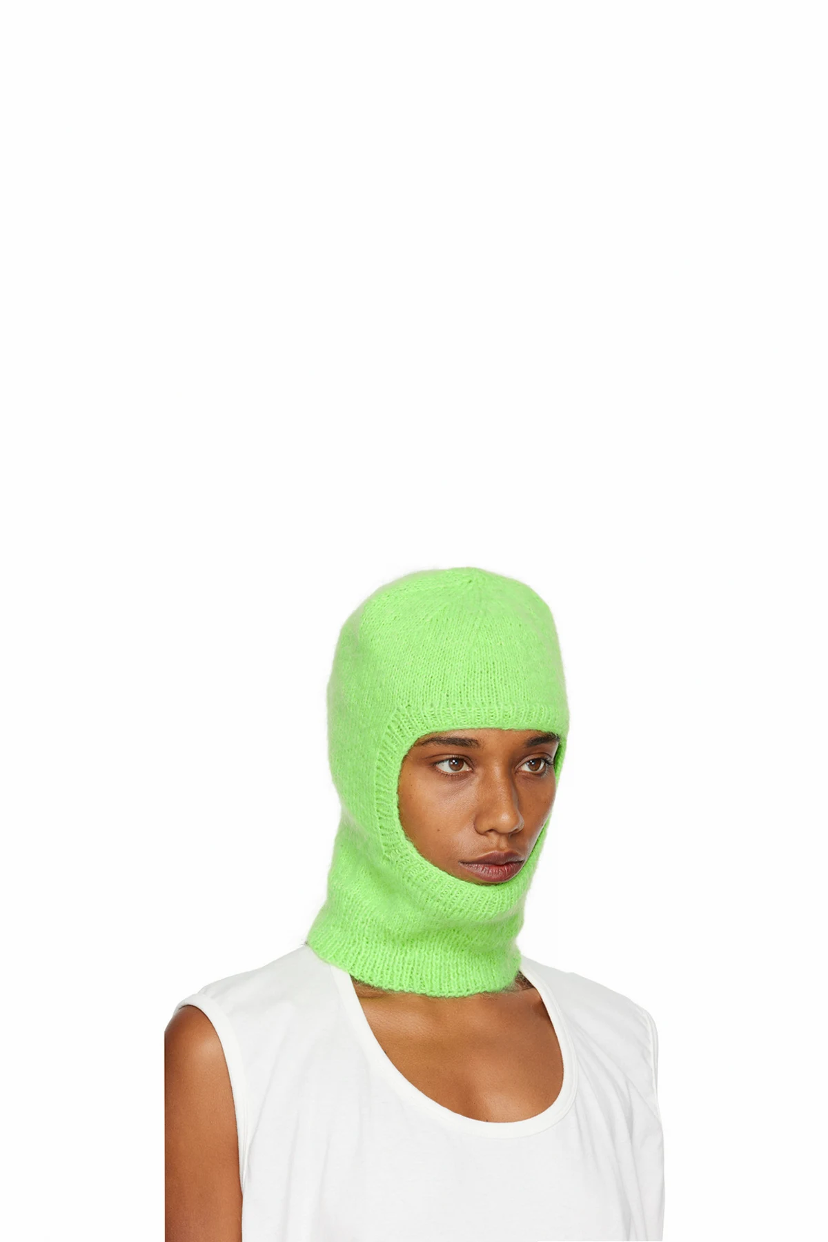 Knit mohair-blend balaclava in green. Rib knit trim at opening.