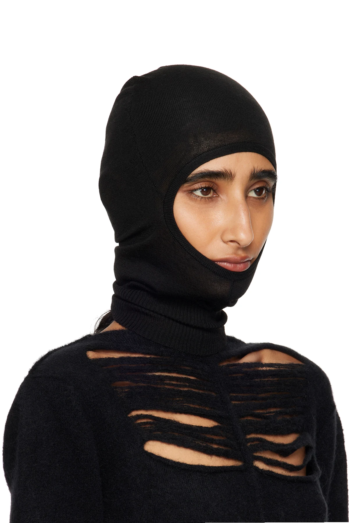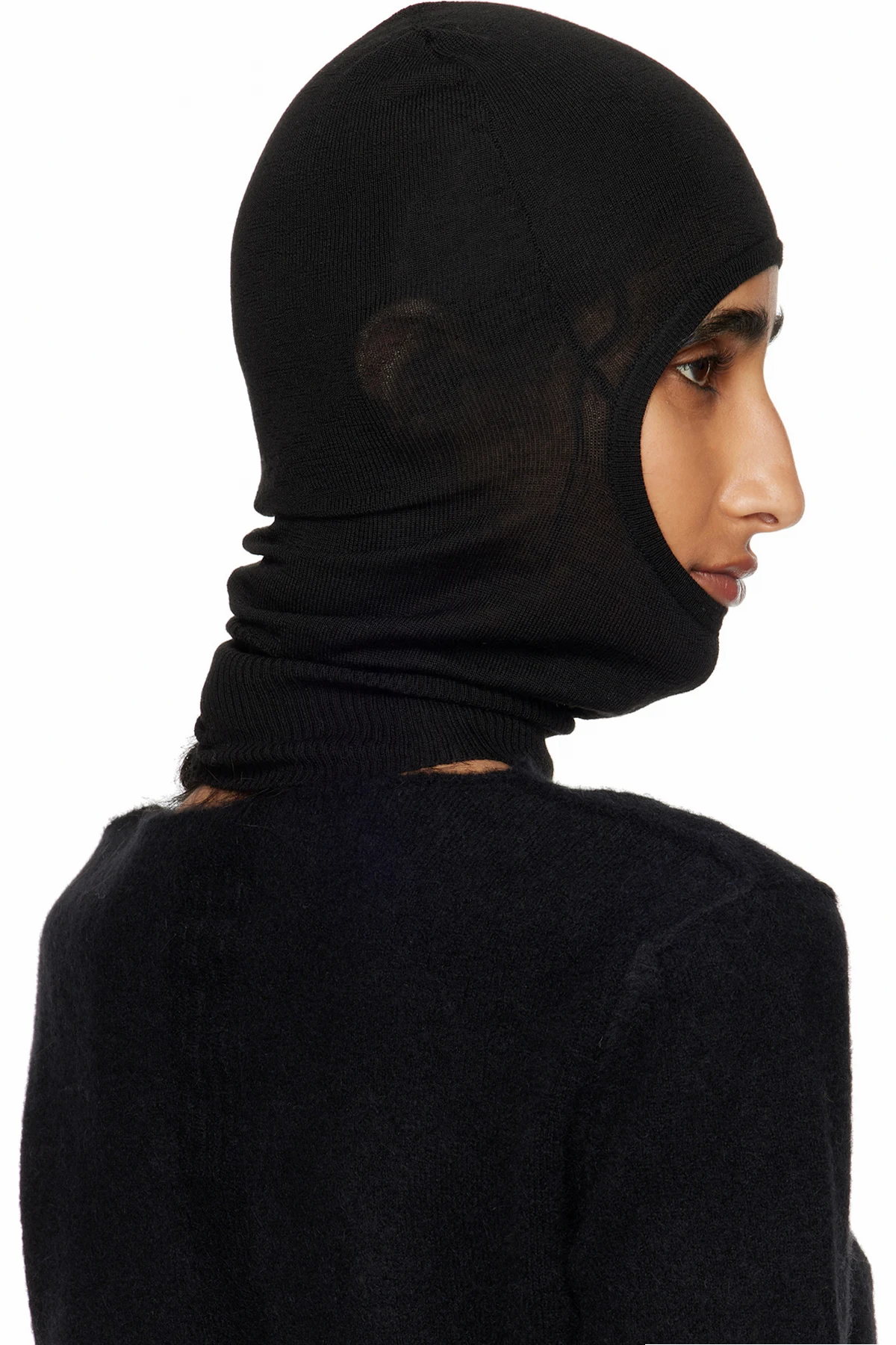 Semi-sheer knit virgin wool balaclava. Rib knit collar.