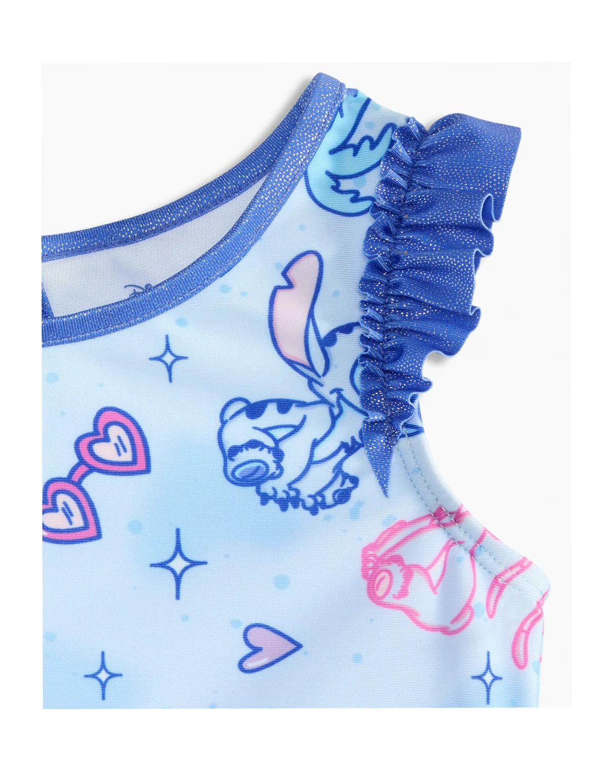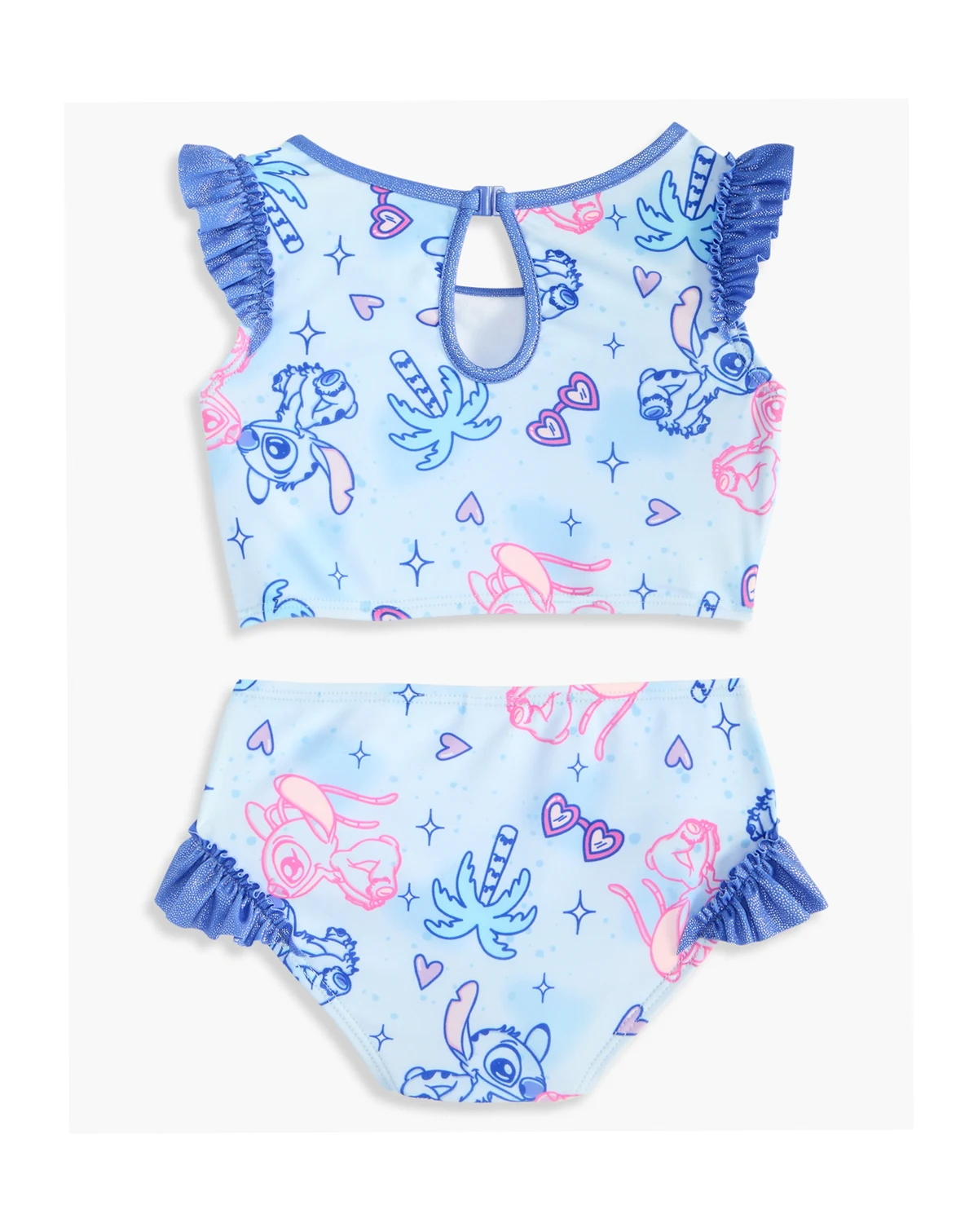 She'll catch a wave in this cute Dreamwave Stitch two-piece swimsuit featuring sparkle trims and fun ruffle details. This stretchy, fully-lined suit provides comfort and excellent UV sun protection for all-day play.