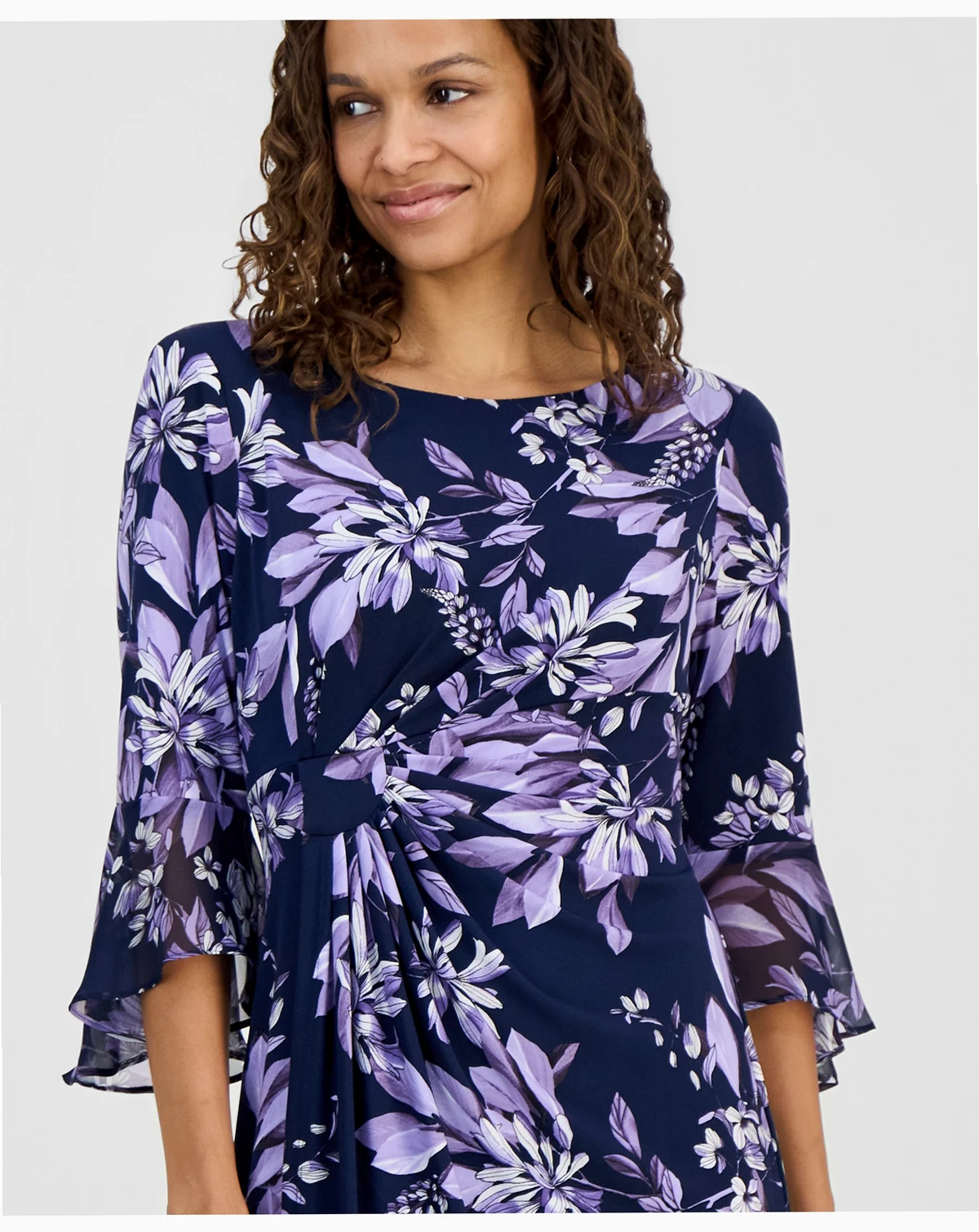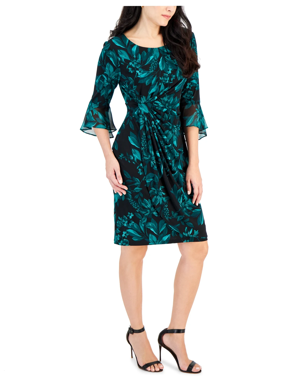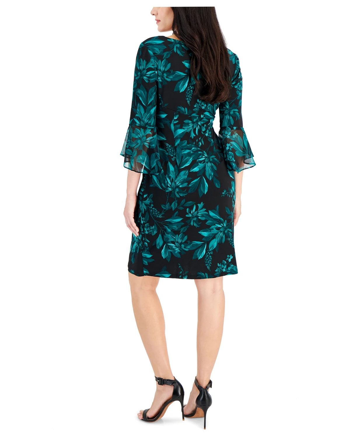 Shell: polyester, spandex; sleeve flounce: polyester; lining: polyester