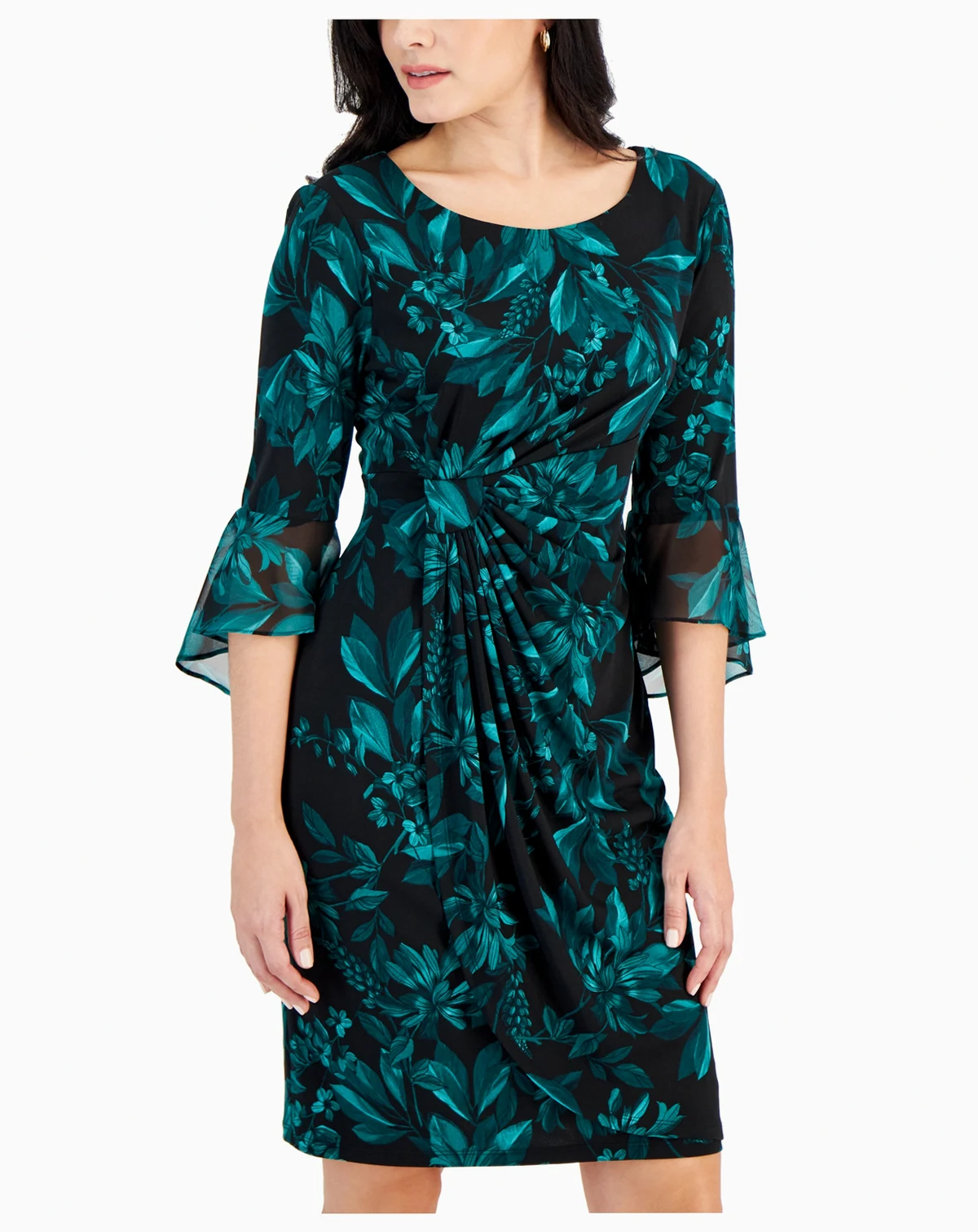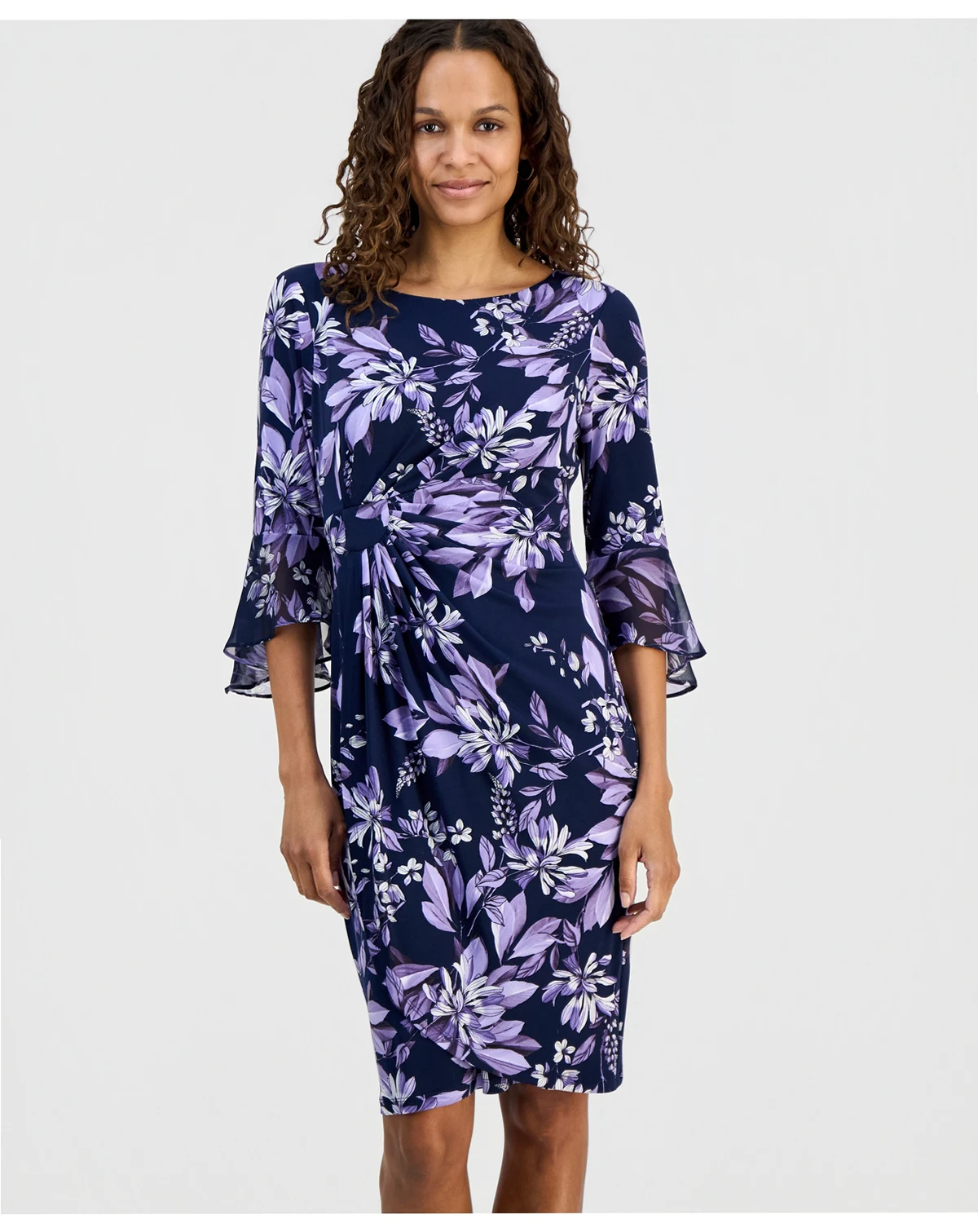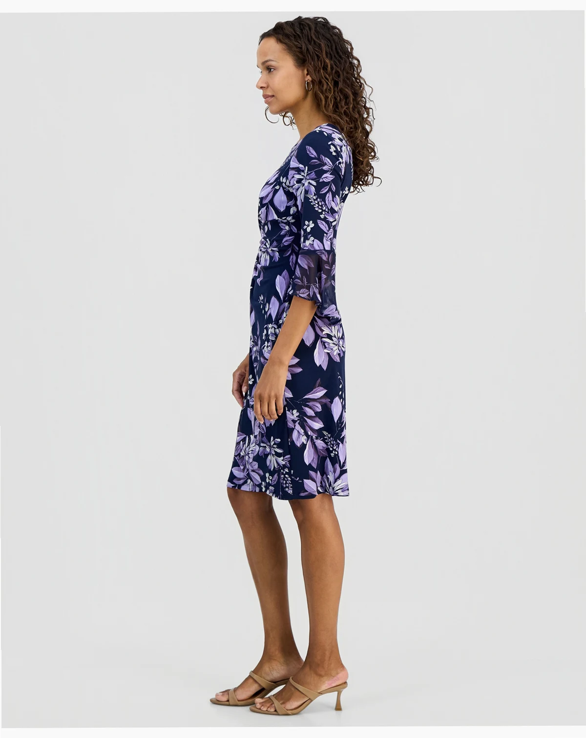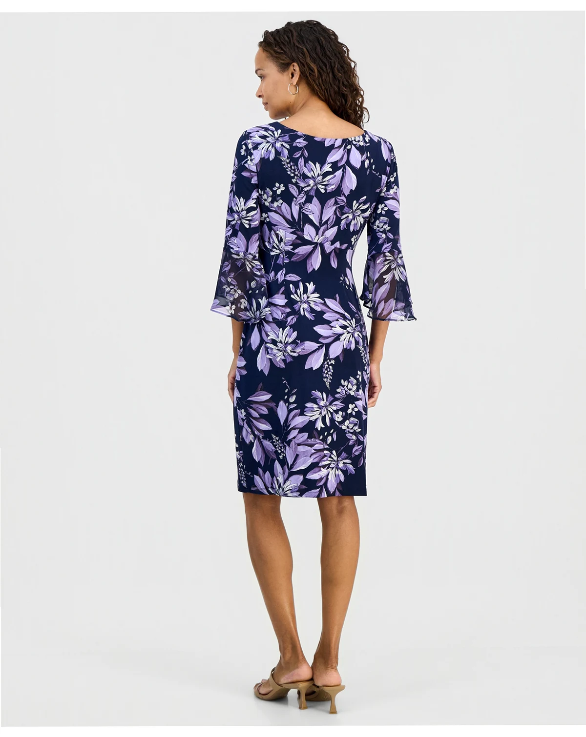 Shell: polyester, spandex; sleeve flounce: polyester; lining: polyester