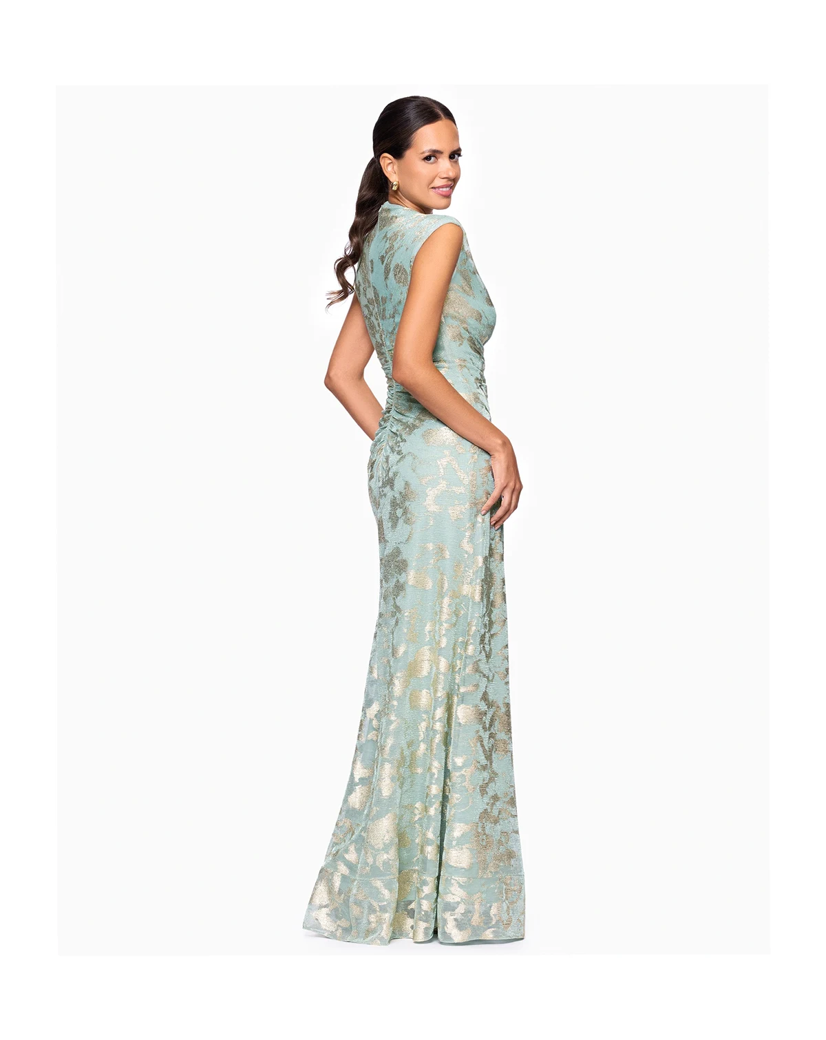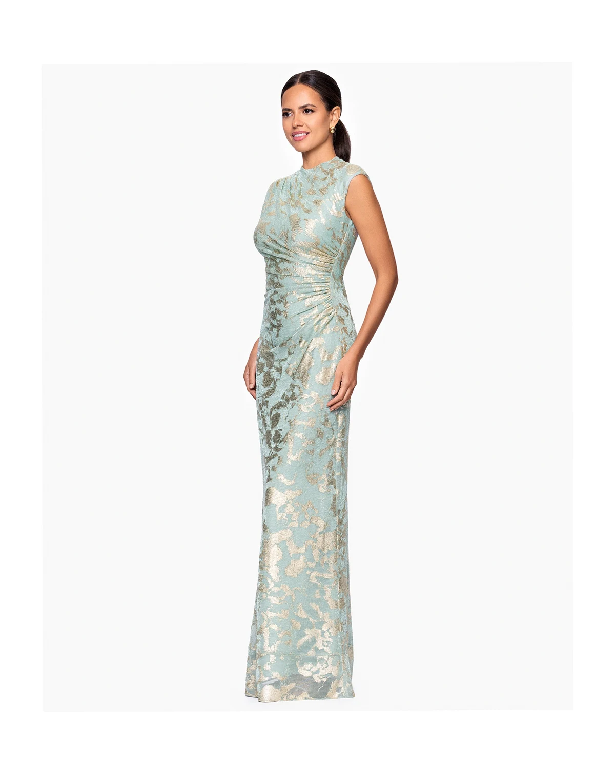 Chic ruching accents the mock neck of this Betsy & Adam dress, adding texture and visual interest. Side slit and sleeveless styling enhance comfort and movement while maintaining a modern, striking look.