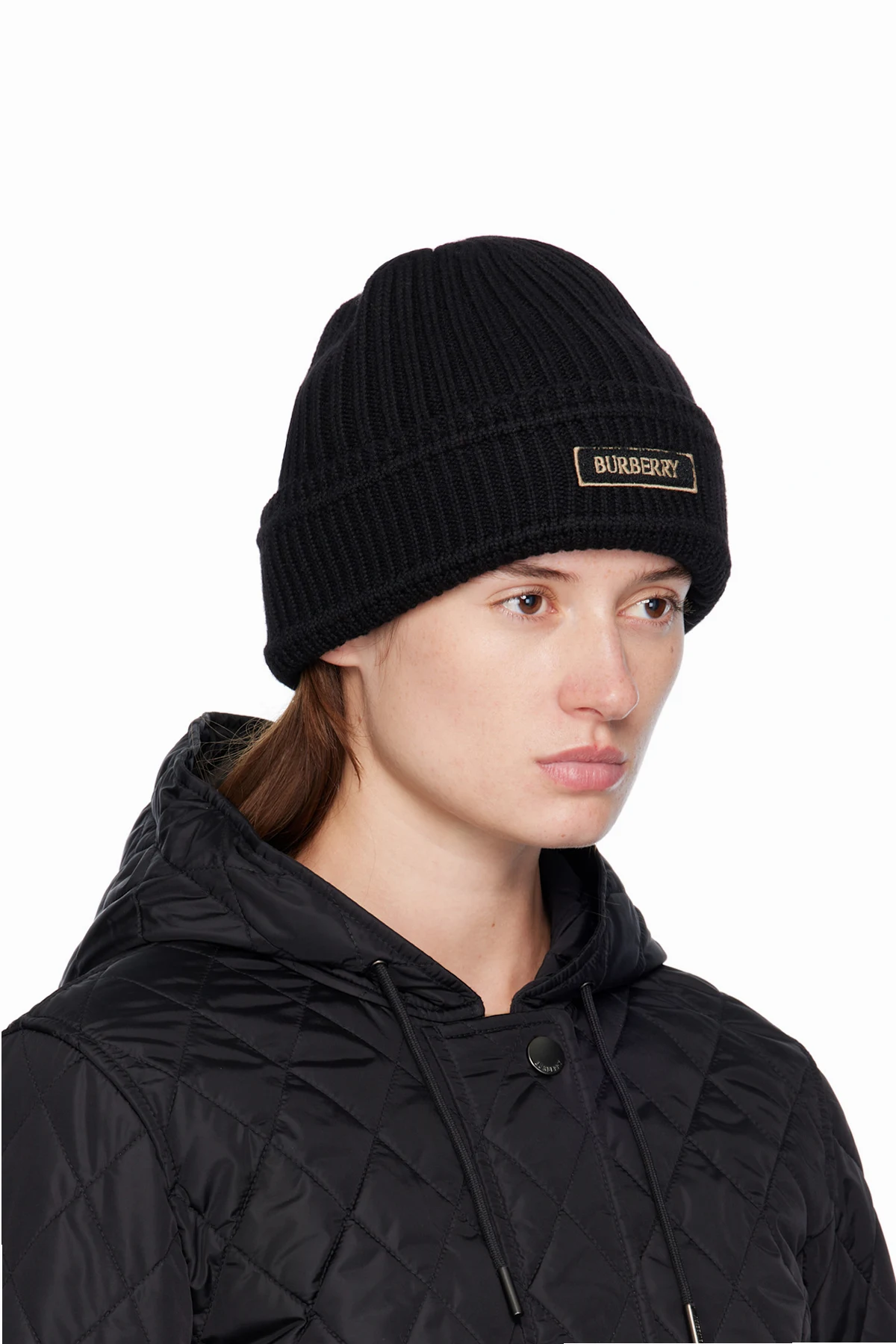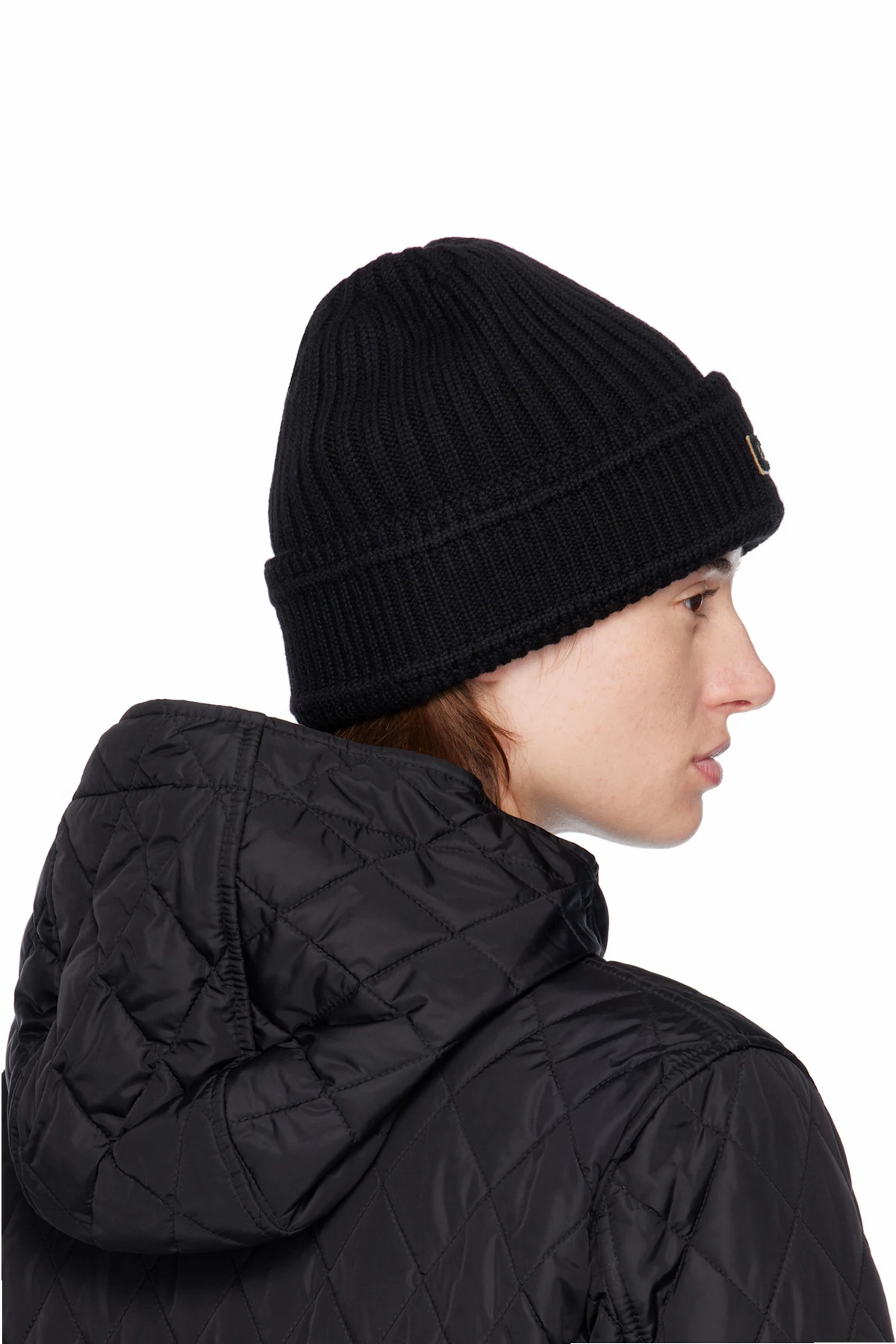Rib-knit wool beanie. Bouclé logo patch at rolled brim.