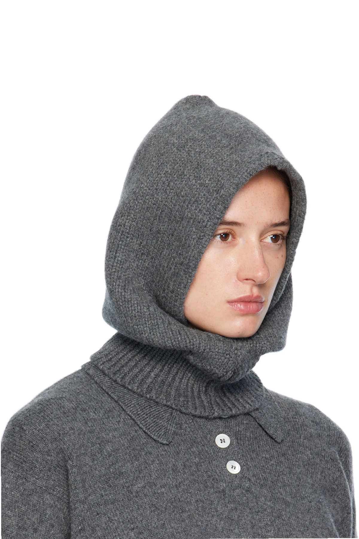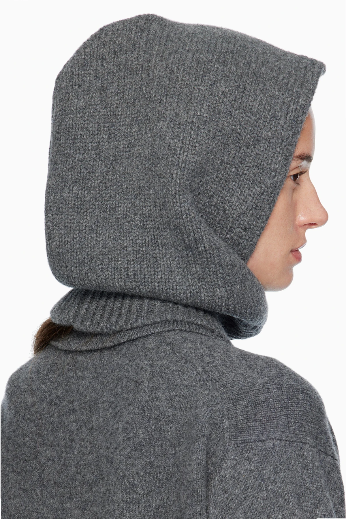 Hand-knit Geelong lambswool hood. Rib-knit collar.