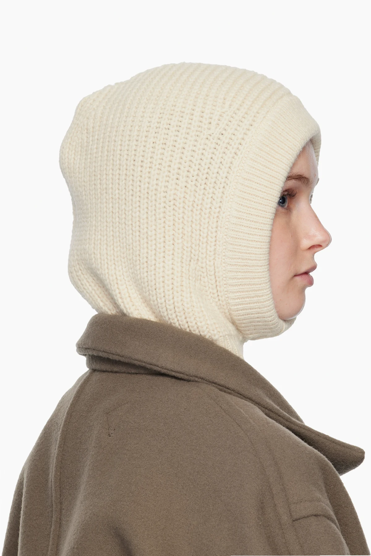 Knit alpaca- and wool-blend balaclava. Rib-knit trim at face and collar.