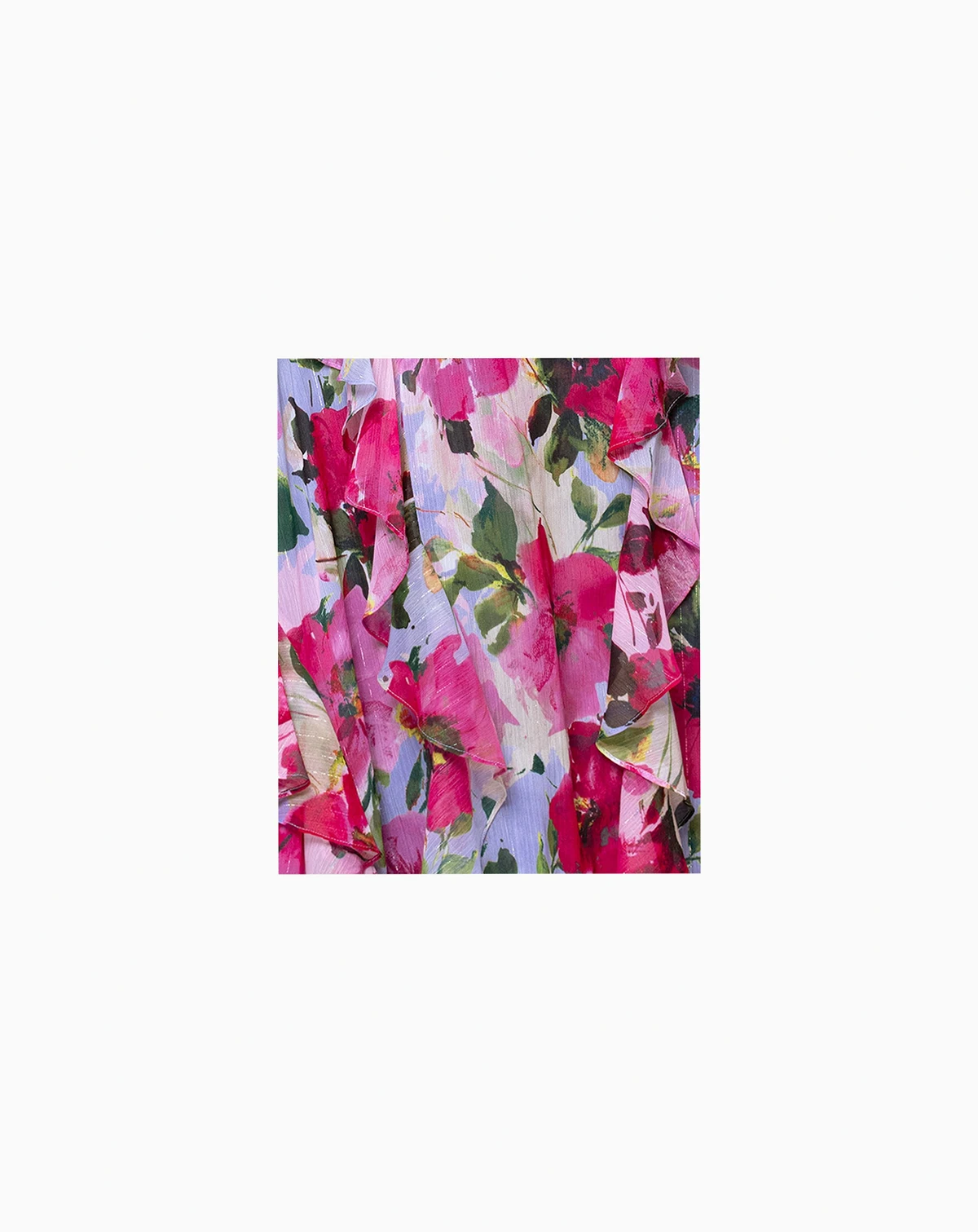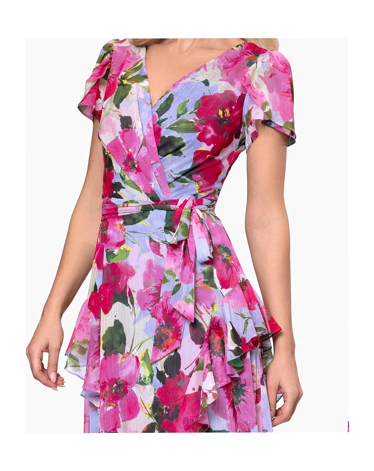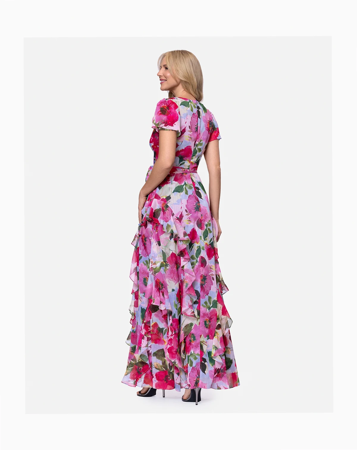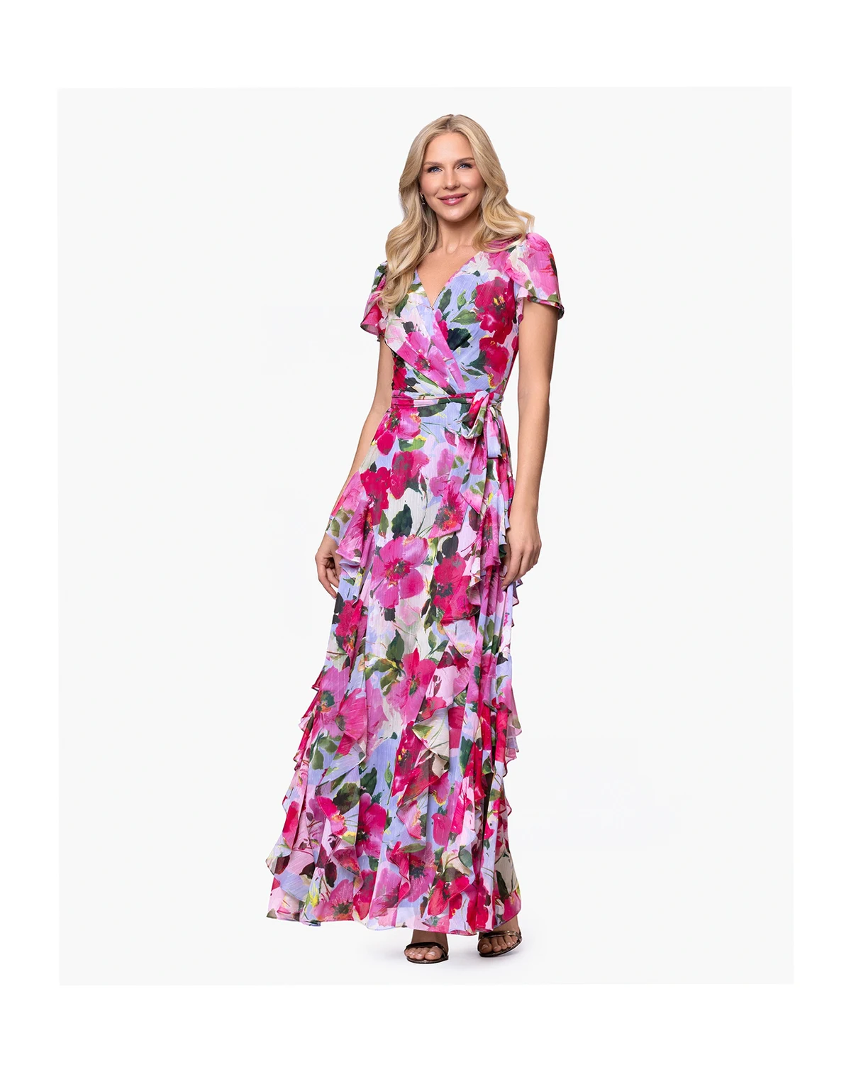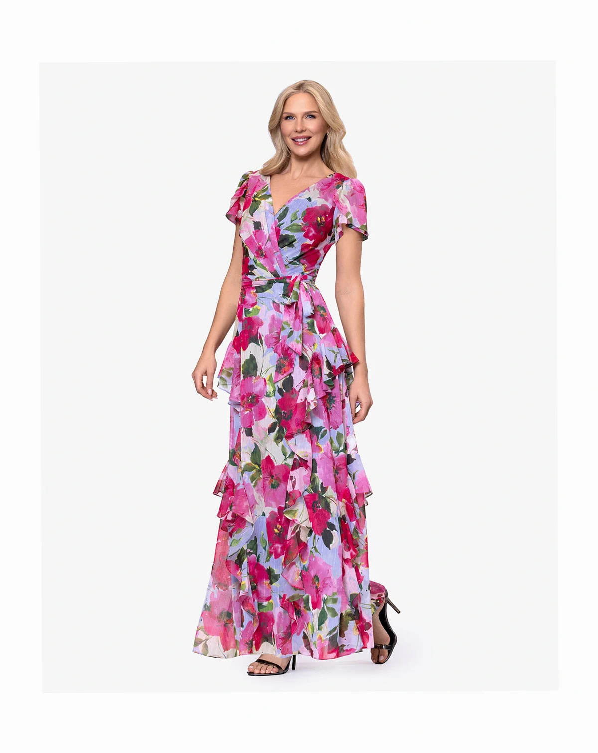 Chic and vibrant, this Betsy & Adam ball gown features a V-neckline and short sleeves for a flattering, elegant silhouette. Stretchy fabric ensures ease of movement, while a center back zipper provides a smooth fit, and a lively floral print adds festive charm, suited for celebrations or parties.