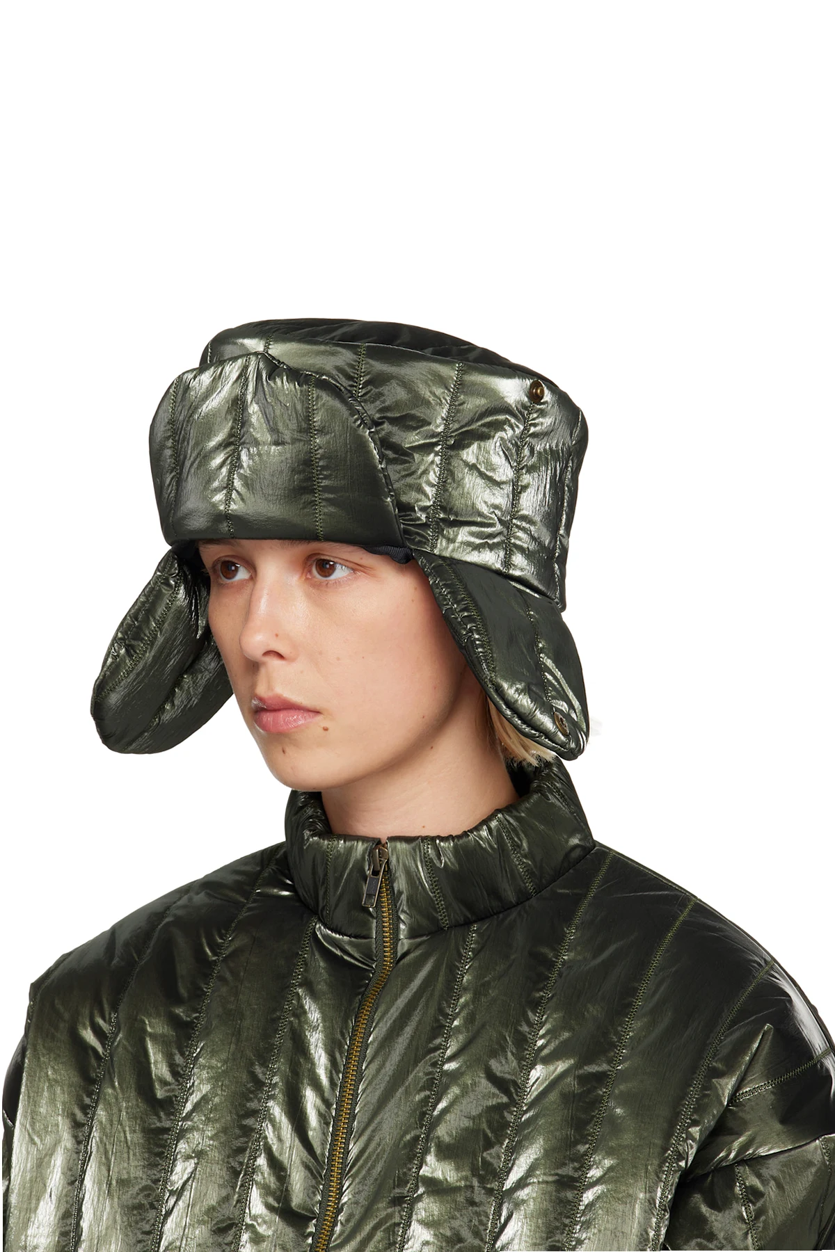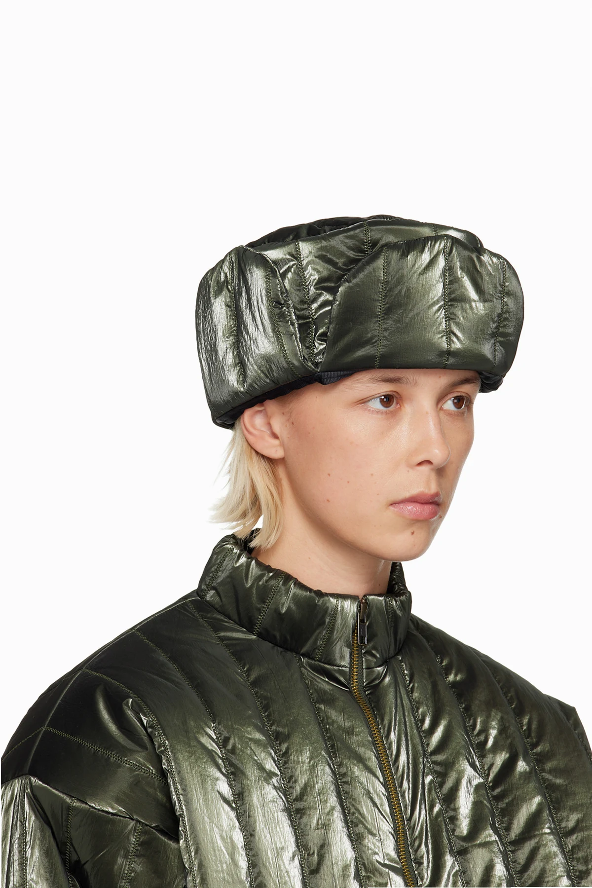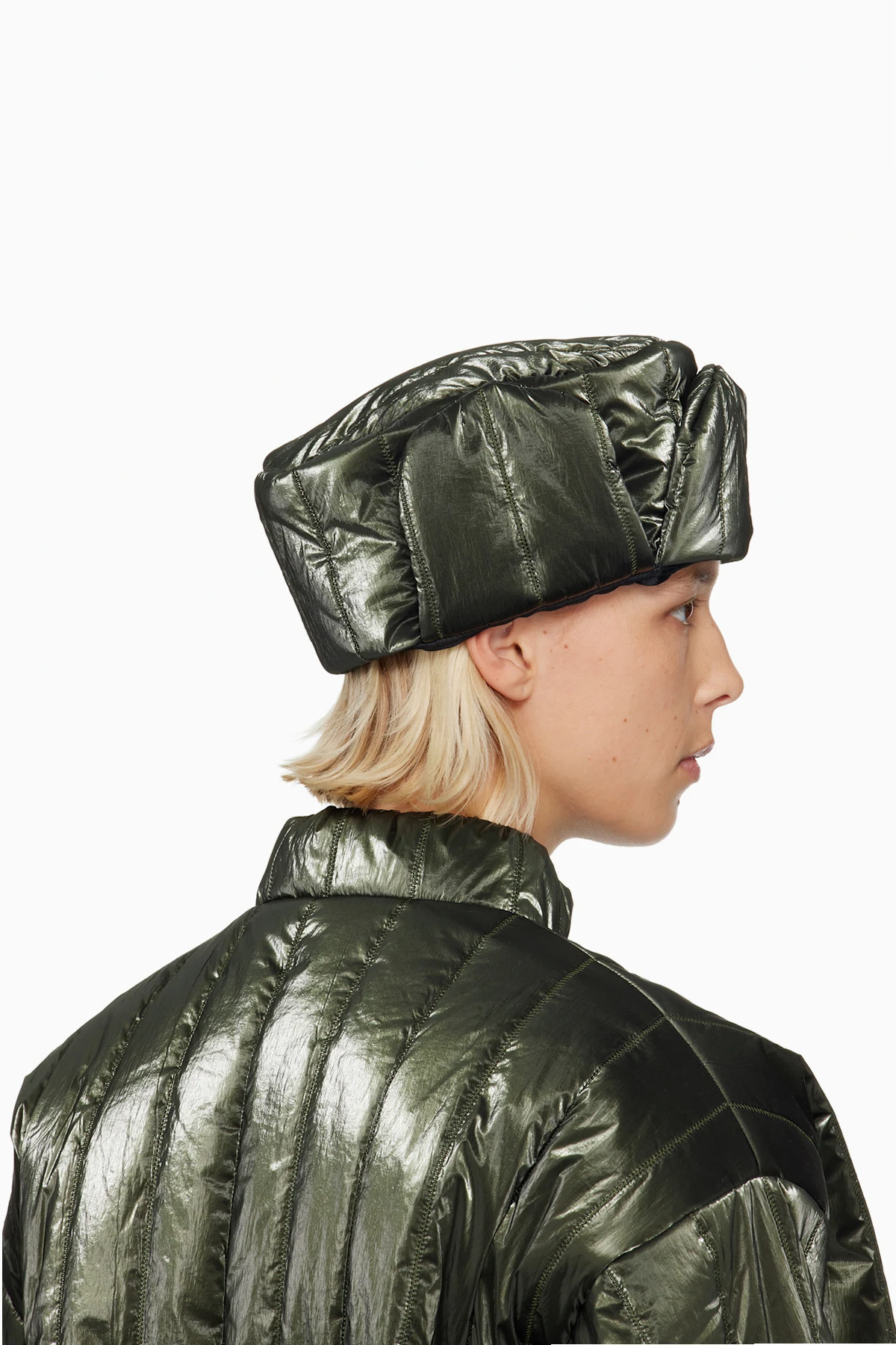 Quilted and crinkled taffeta aviator-style hat.