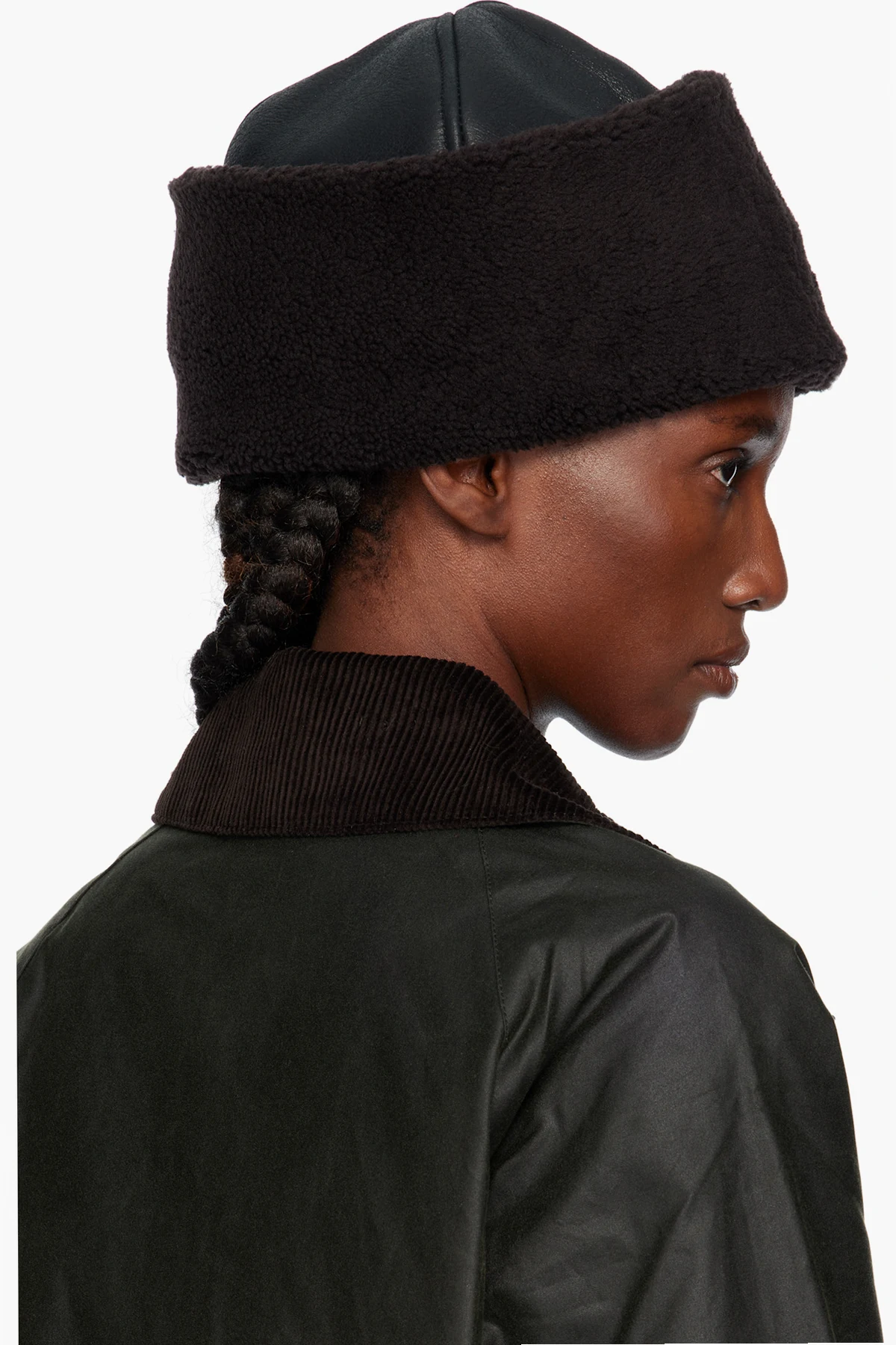 Grained lambskin hat. Shearling rolled brim and interior.