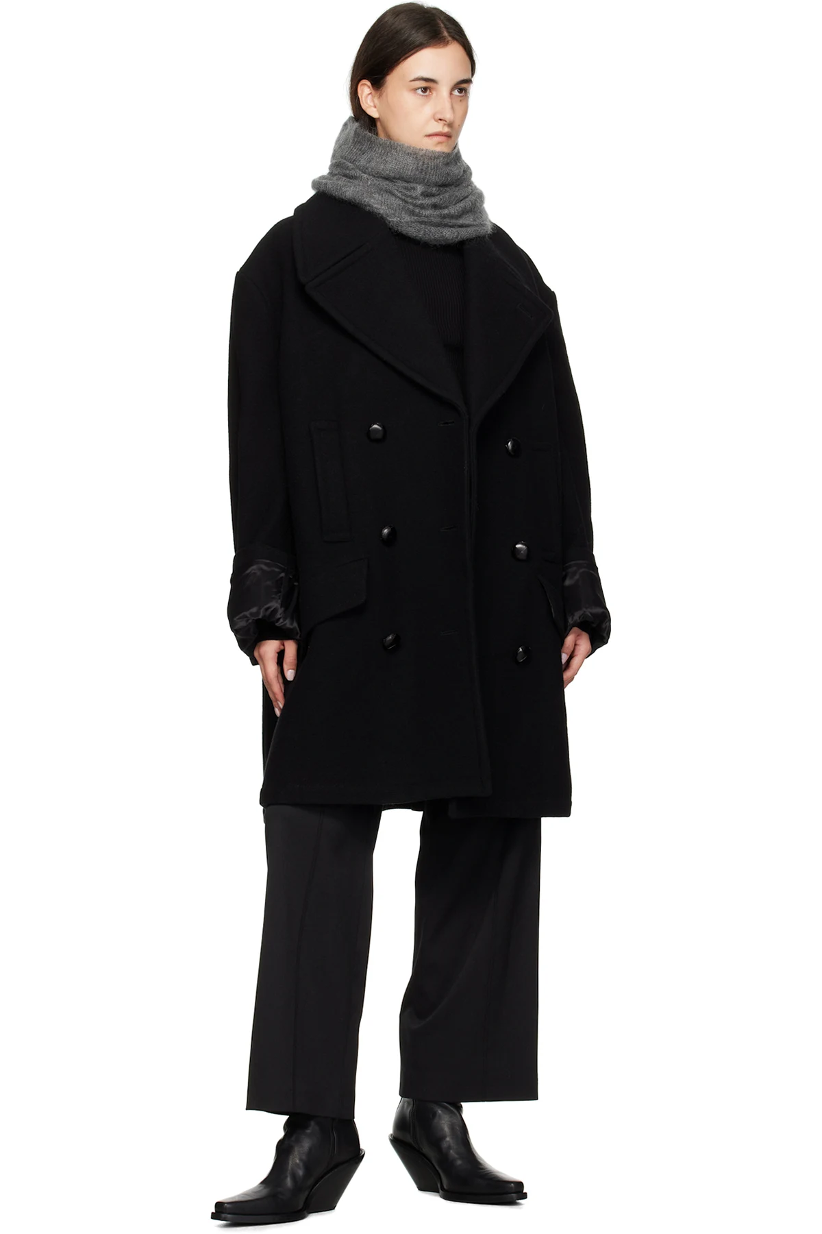 Brushed knit mohair- and silk-blend collar.