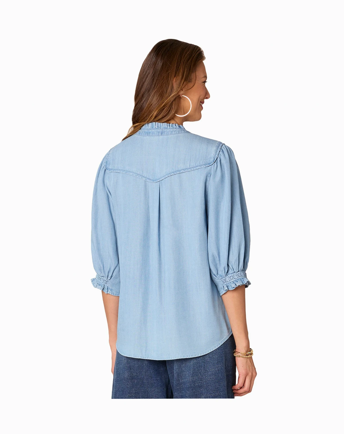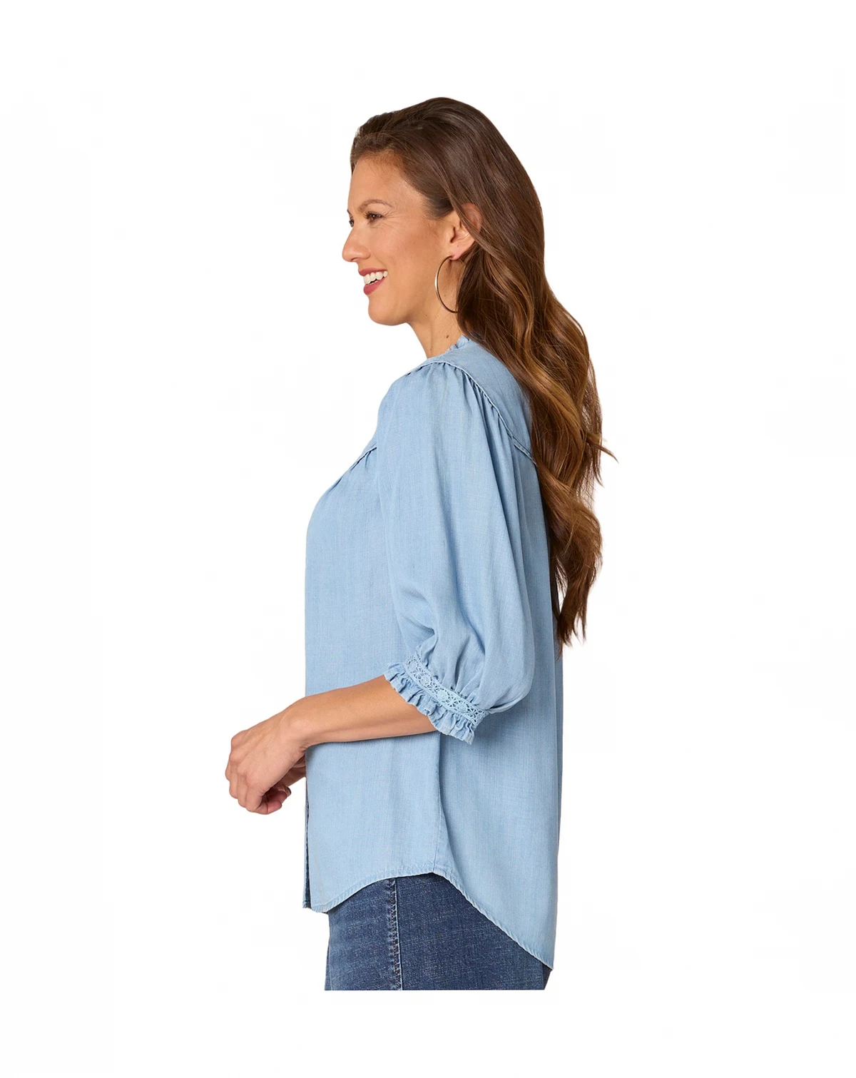 Soft chambray fabric brings a relaxed touch to Democracy's petite button-front shirt, pairing perfectly with crochet trim and elbow-length blouson sleeves for a beautiful look.