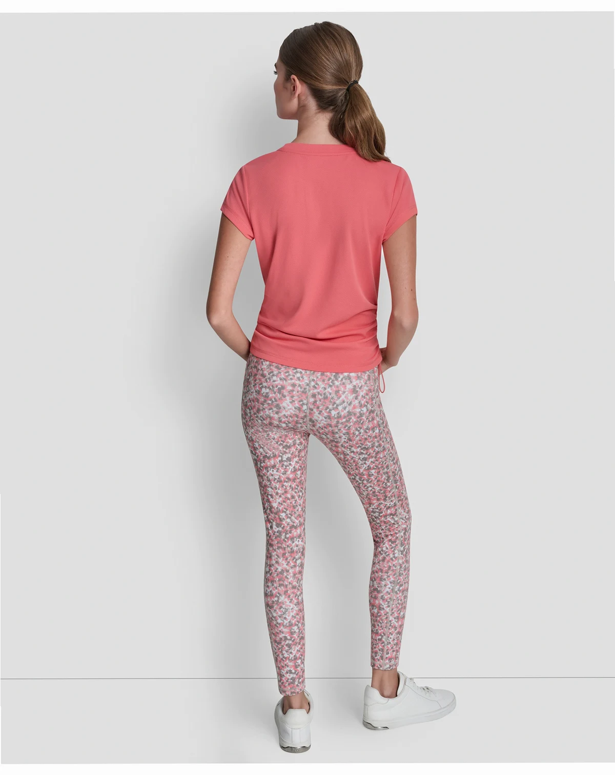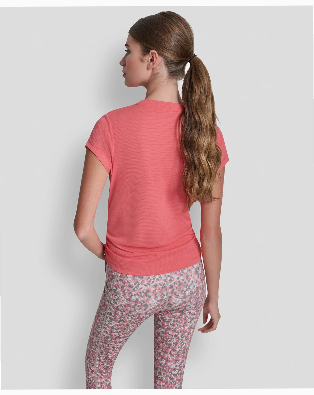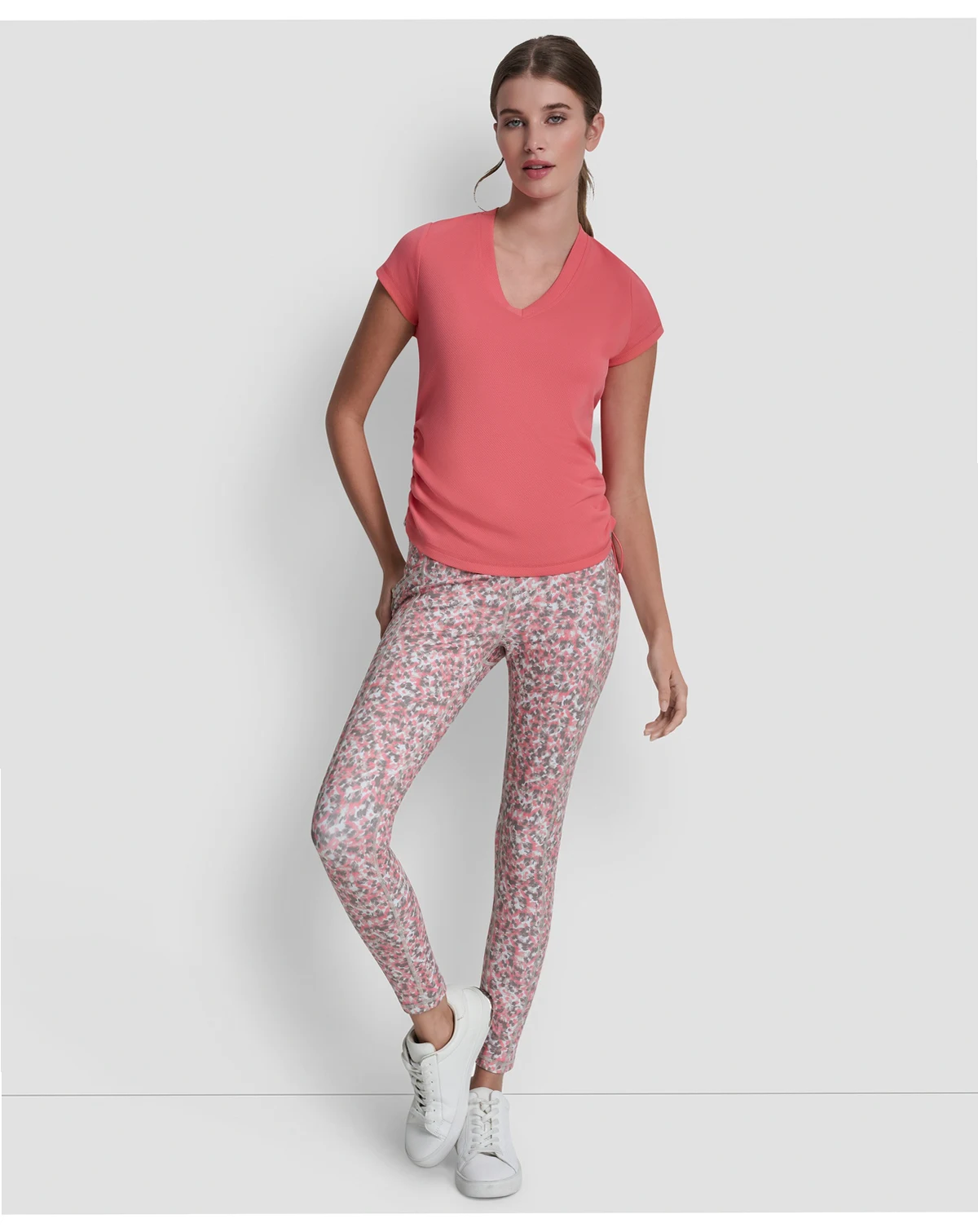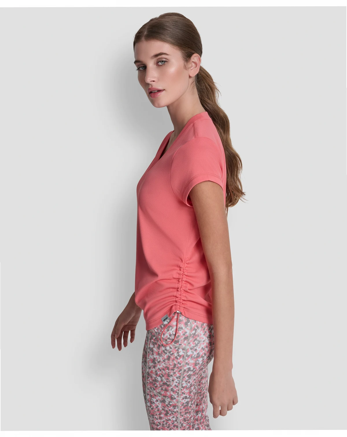 Engineered for everyday wear, this tech tee from DKNY Sport features rushed side seams for a dynamic look. The relaxed fitness and V-neckline provide comfortable, modern style.