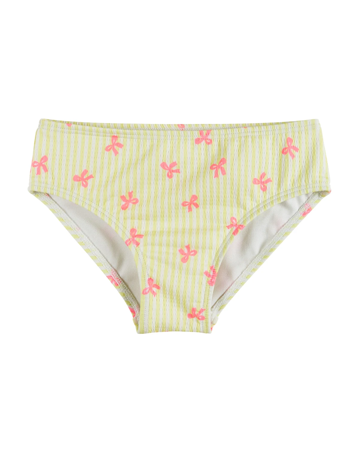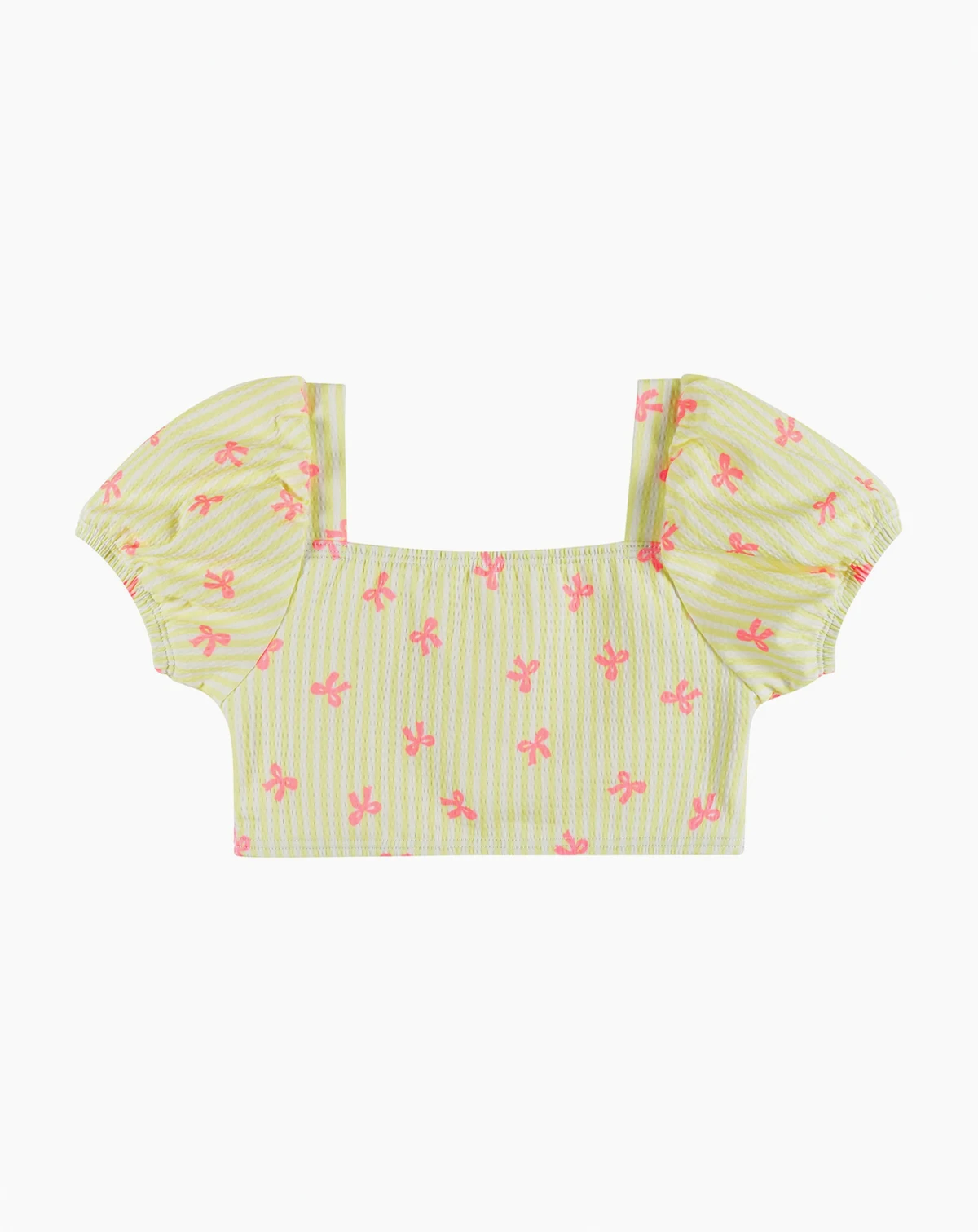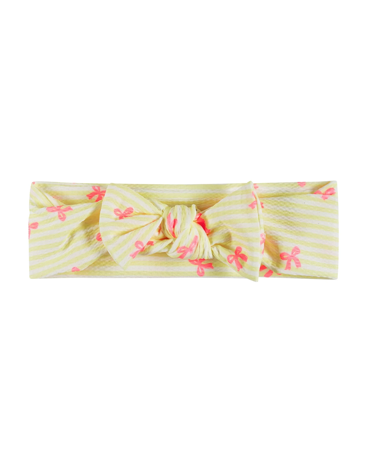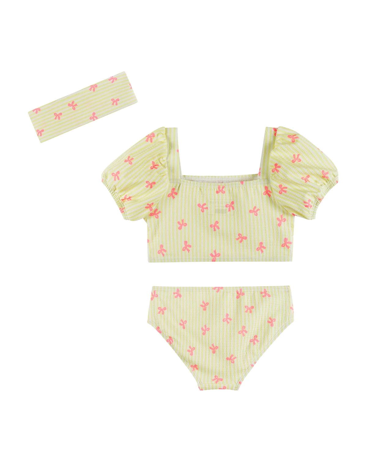 Make waves in this Andy & Evan set, featuring a puff-sleeve top with a square neckline, coordinating bikini bottoms, and matching headband. Bright yellow stripe and bow print add playful charm, creating a fun, stylish look for pool or beach days.