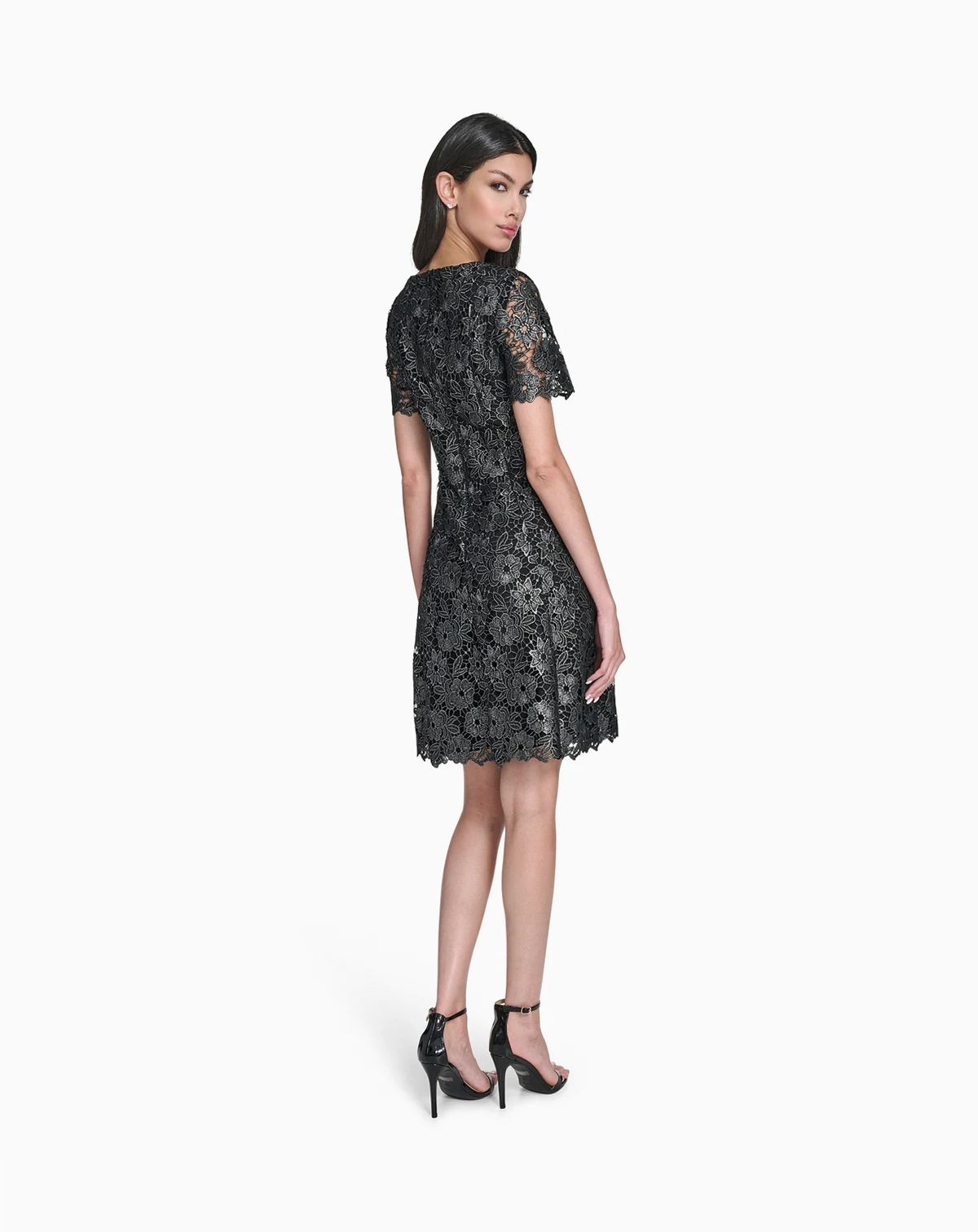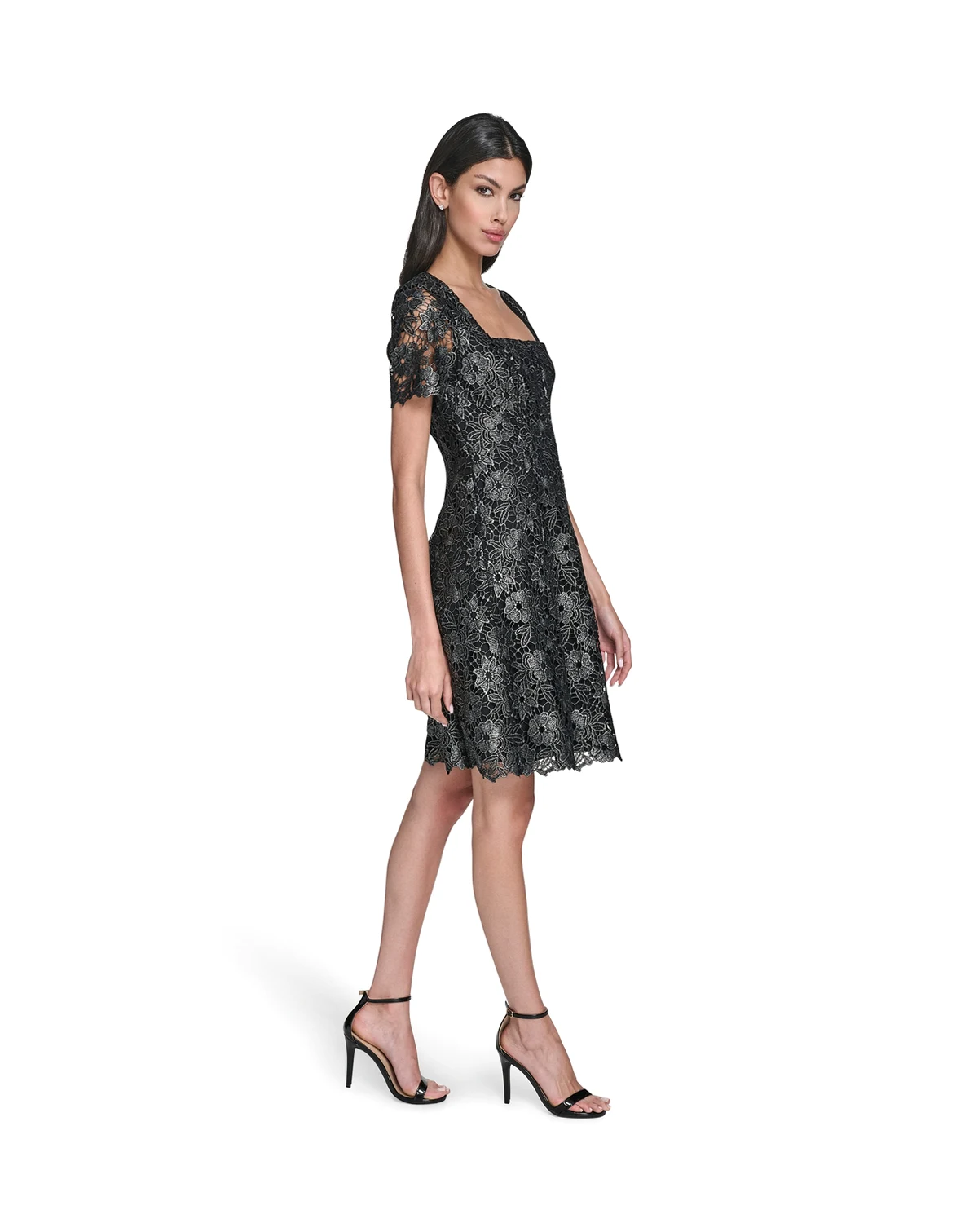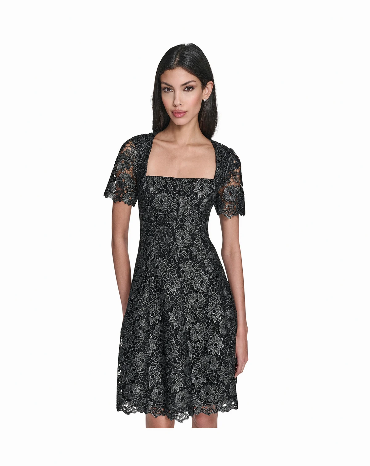 Crafted with intricate foil chemical lace, this Eliza J dress showcases a stylish square neck and short sleeves. The fit and flare silhouette and short length offer a charming look for cocktail parties.