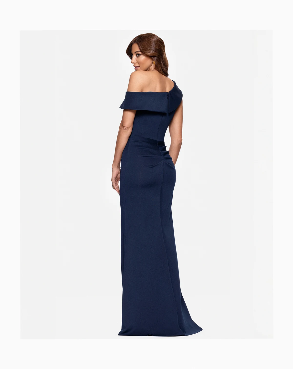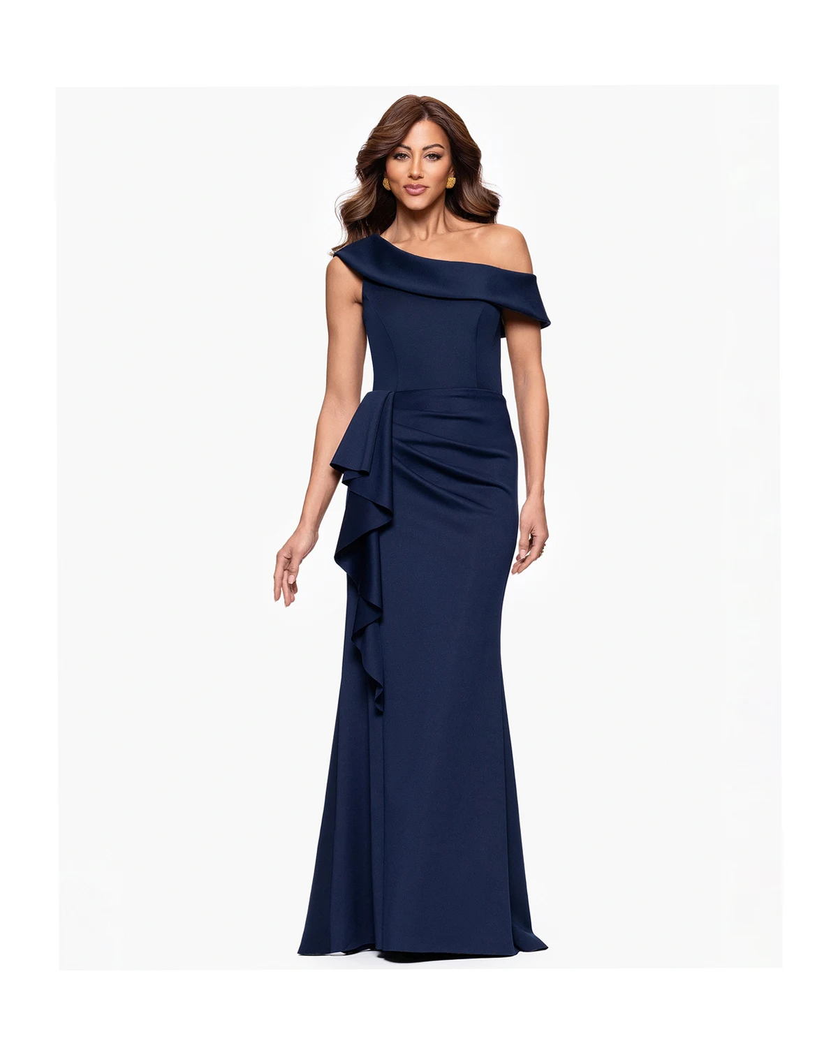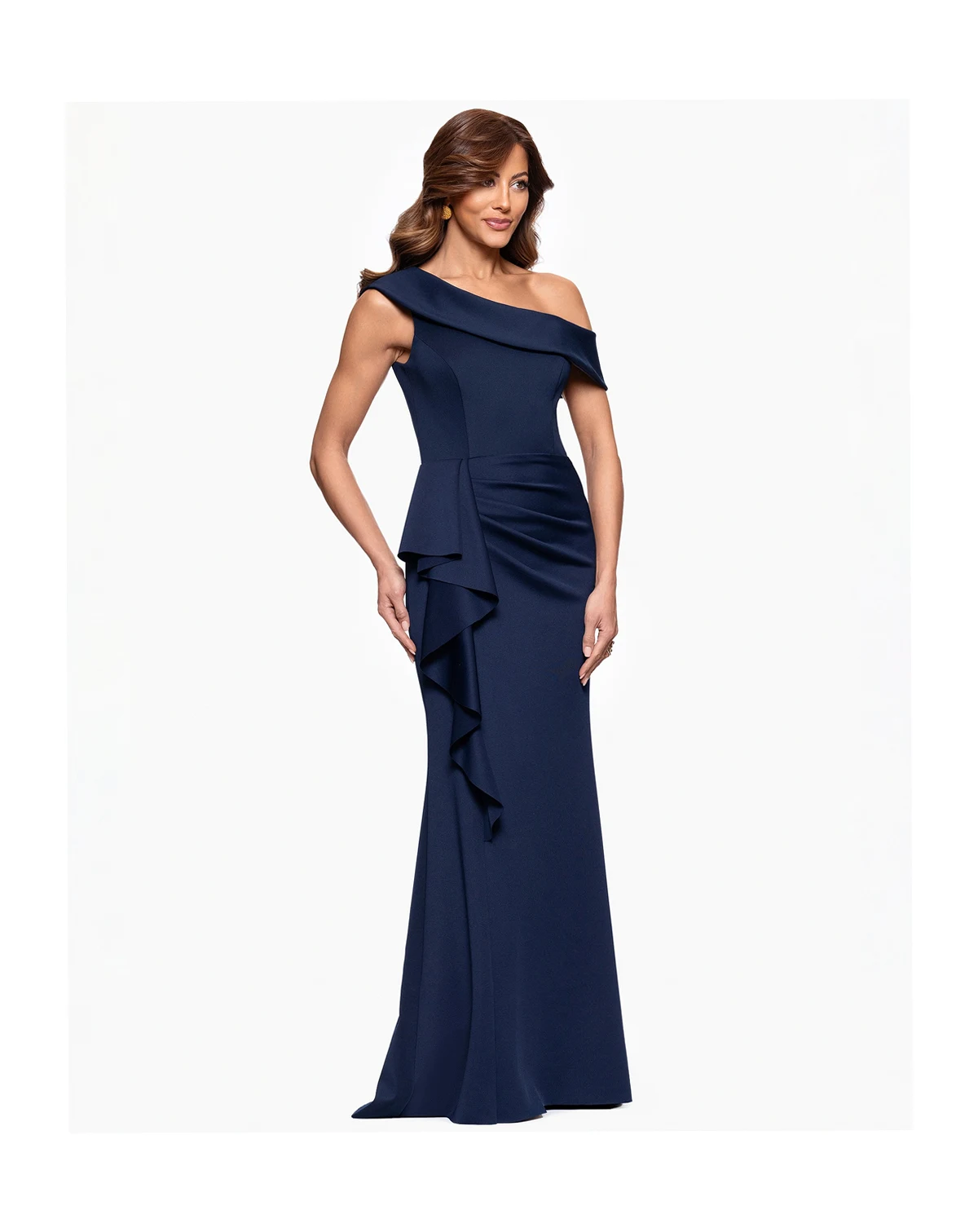 Dramatic and elegant, this XSCAPE ball gown features a one-shoulder, off-the-shoulder neckline for a striking, asymmetrical silhouette. A center back zipper ensures a seamless fit, making it a refined choice for weddings and formal events.