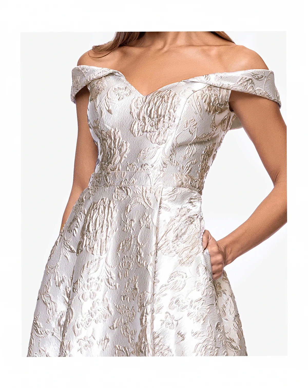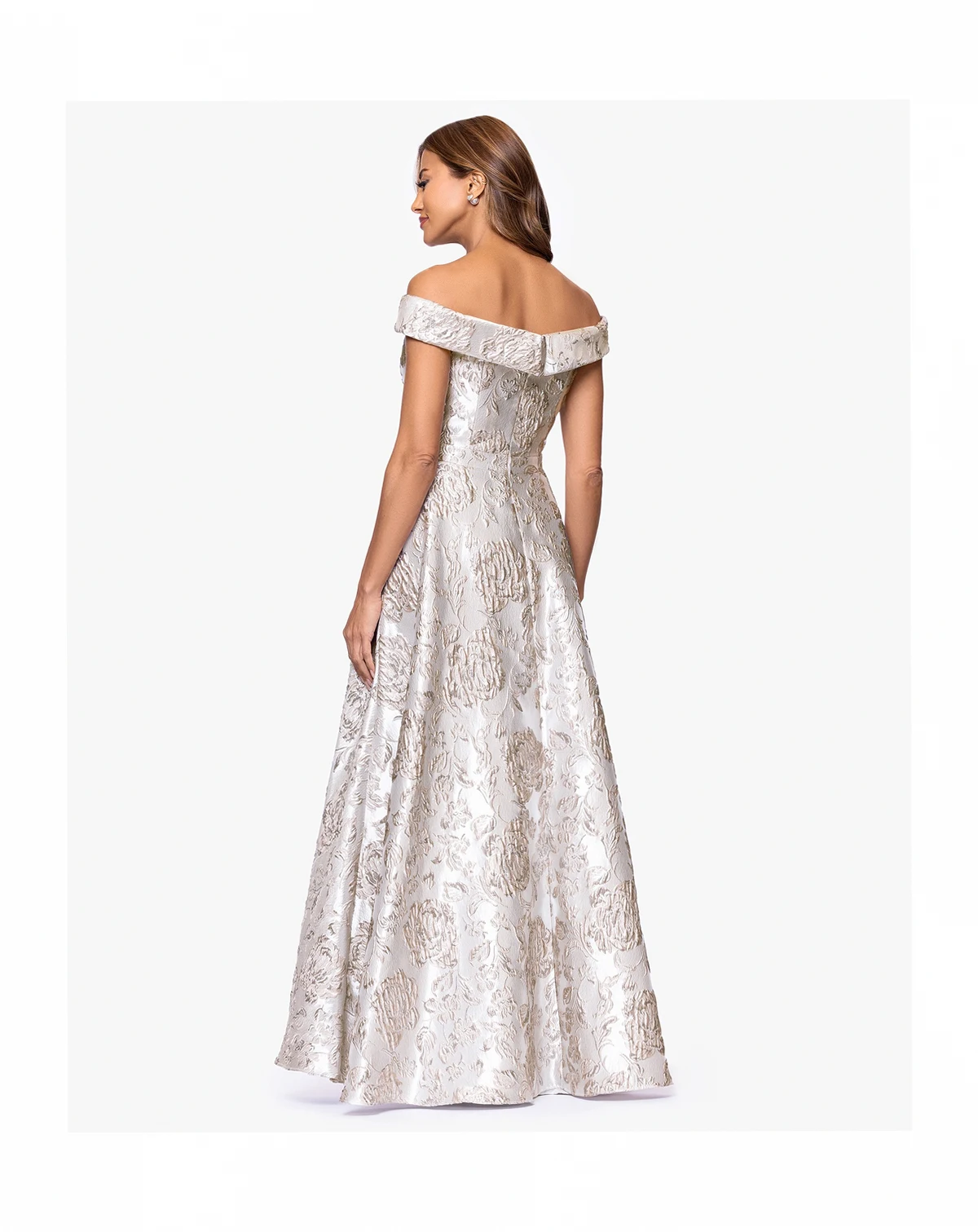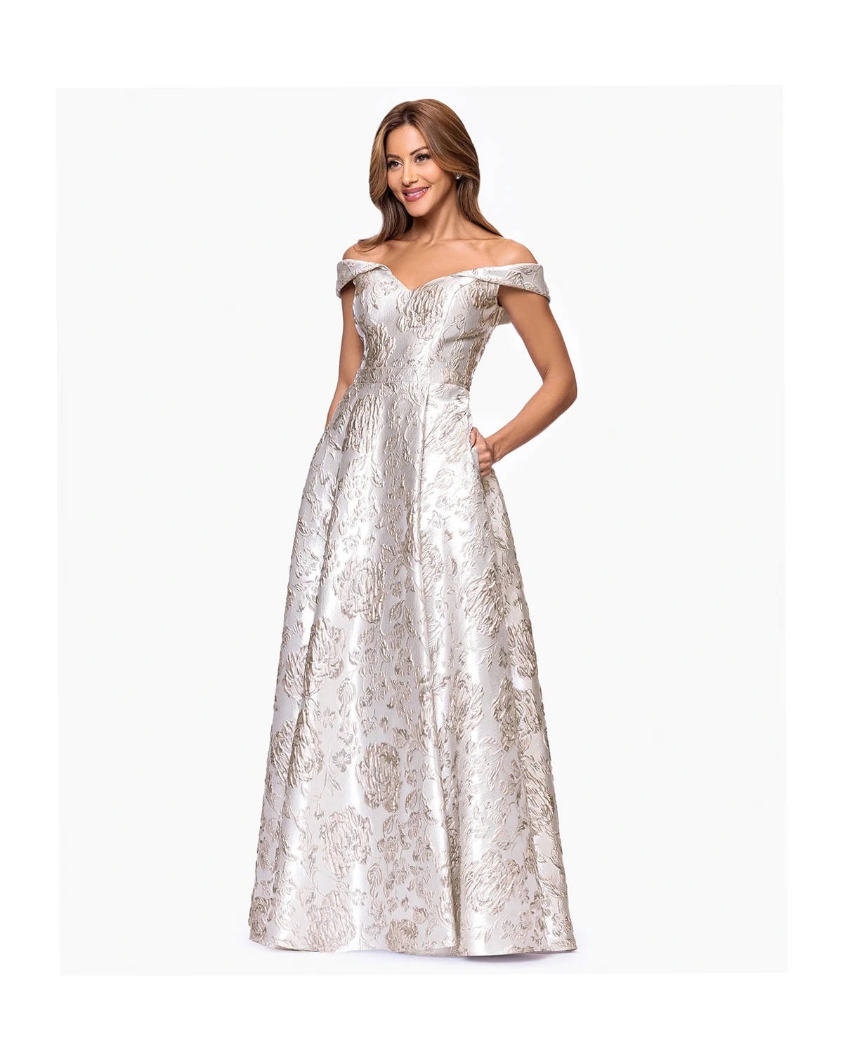 Command attention in this XSCAPE long off-the-shoulder ballgown. The brocade fabric and zipper closure ensure a regal appearance for formal affairs.