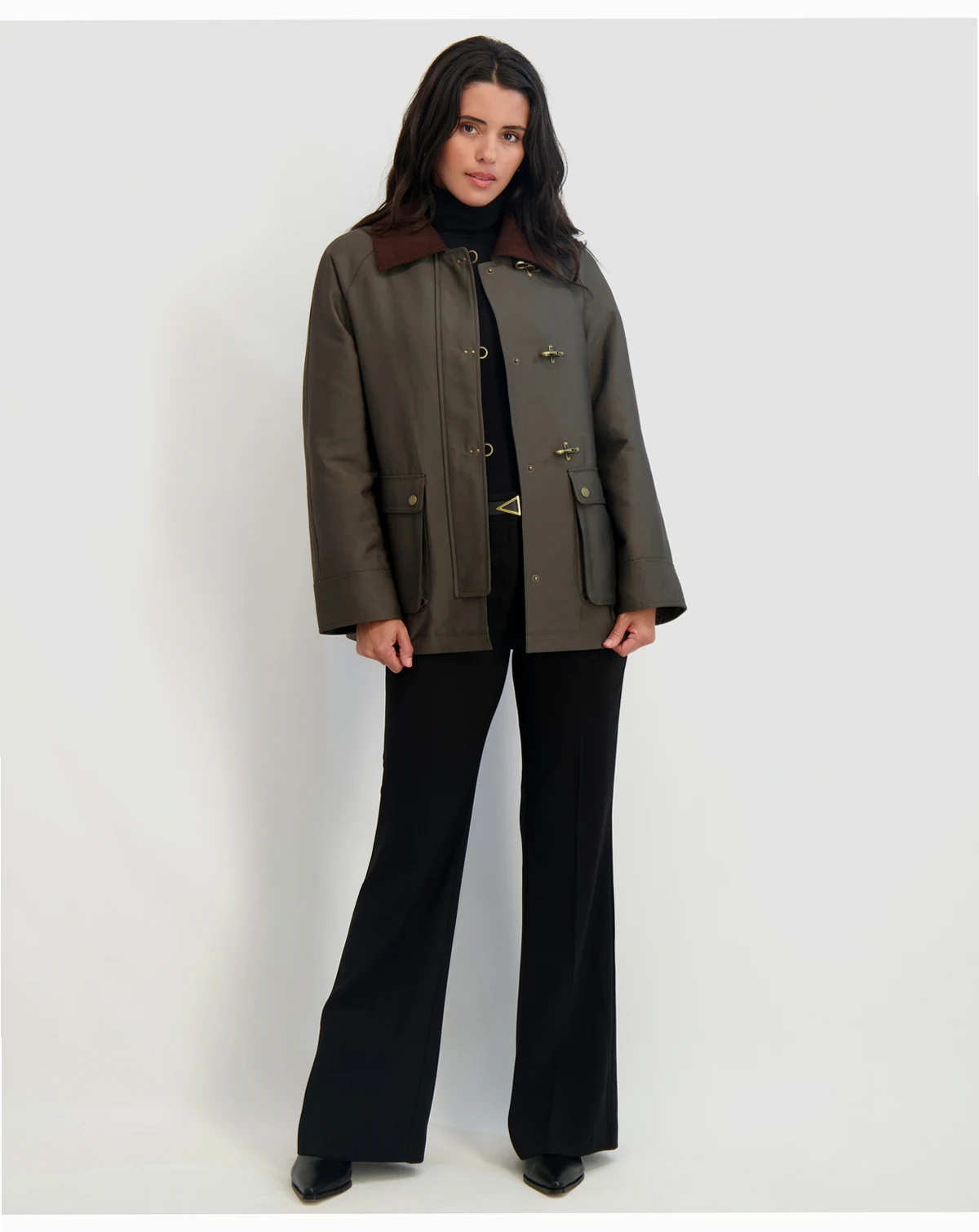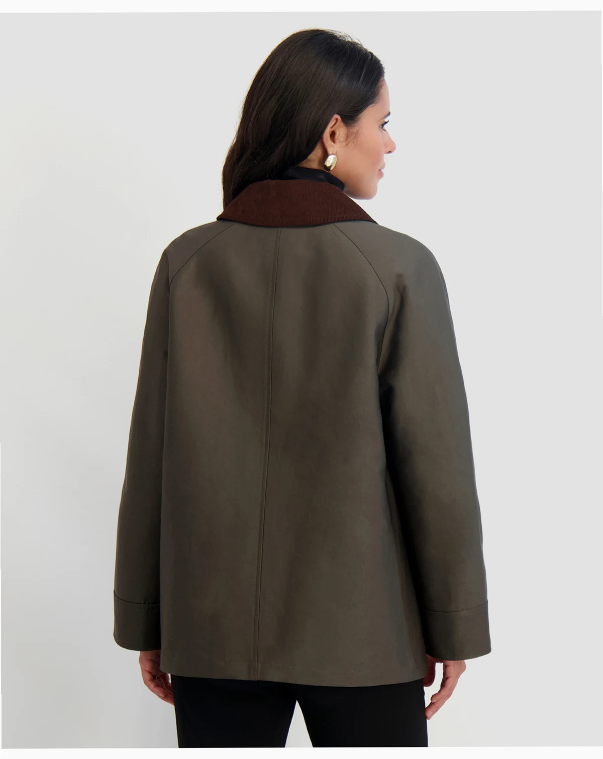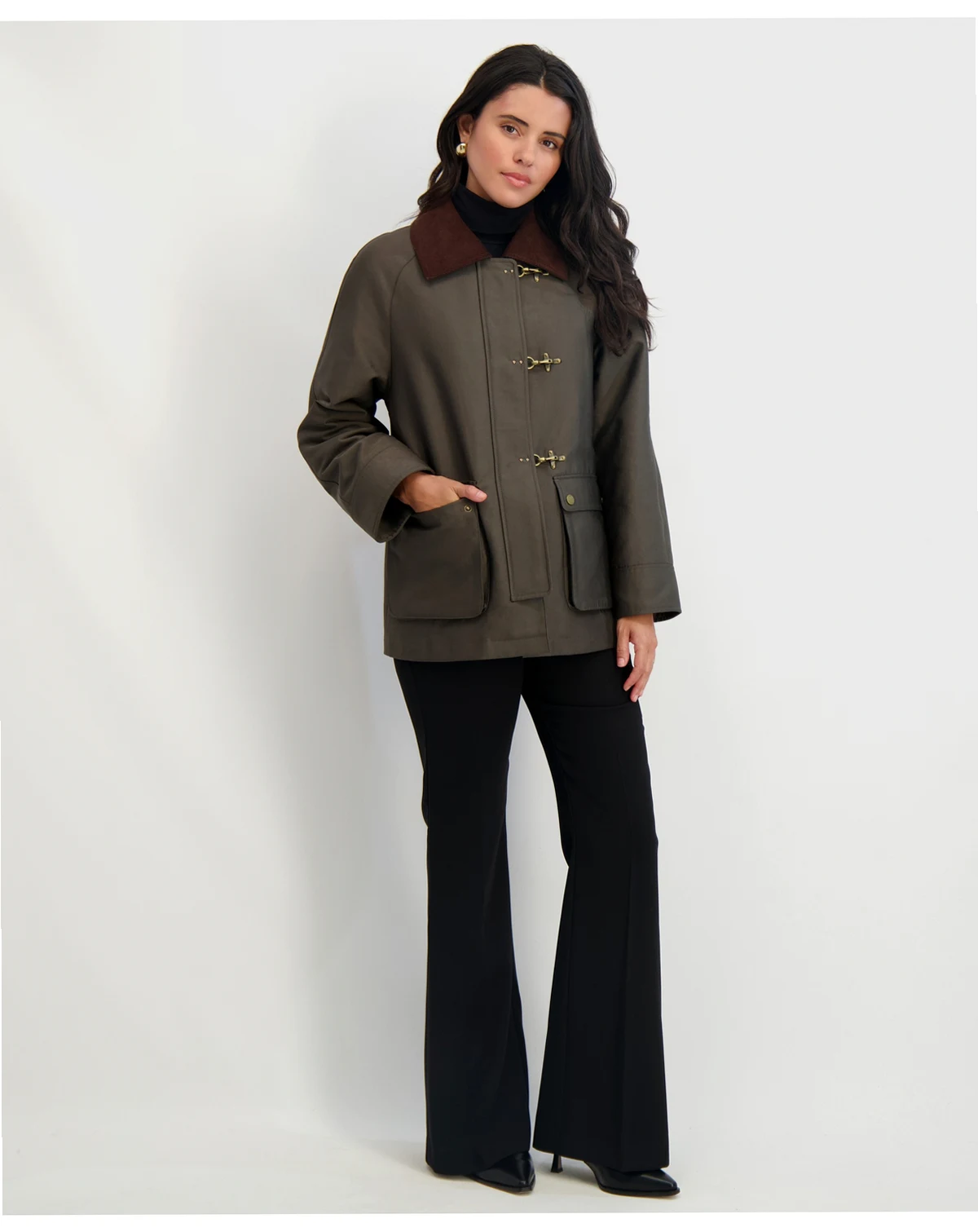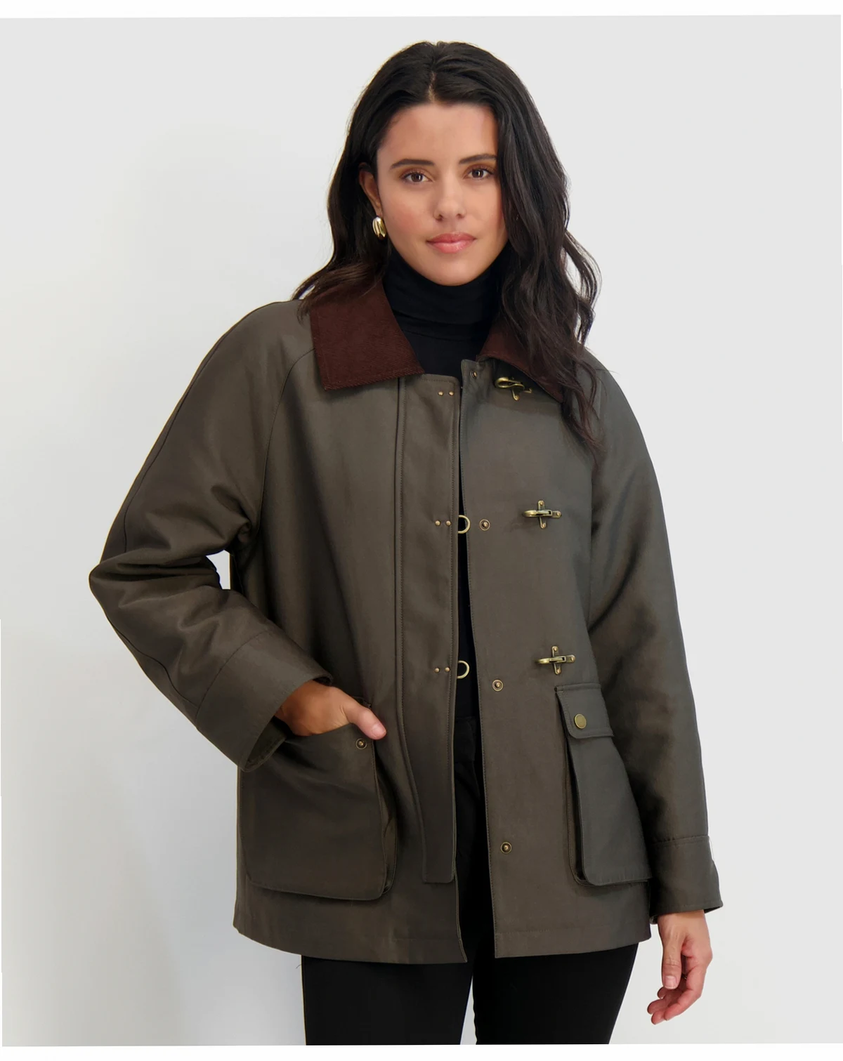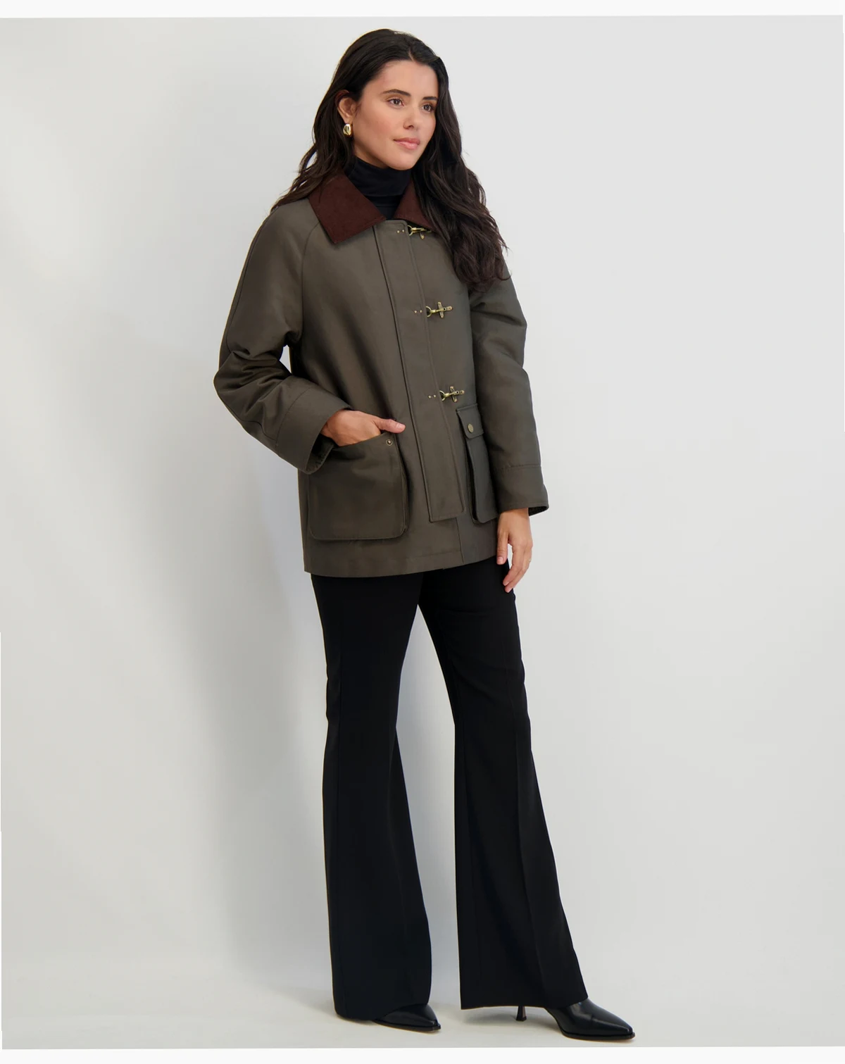 Stylish clasps take center stage at the front of this canvas barn jacket from Tahari. A contrasting point collar tops it off.