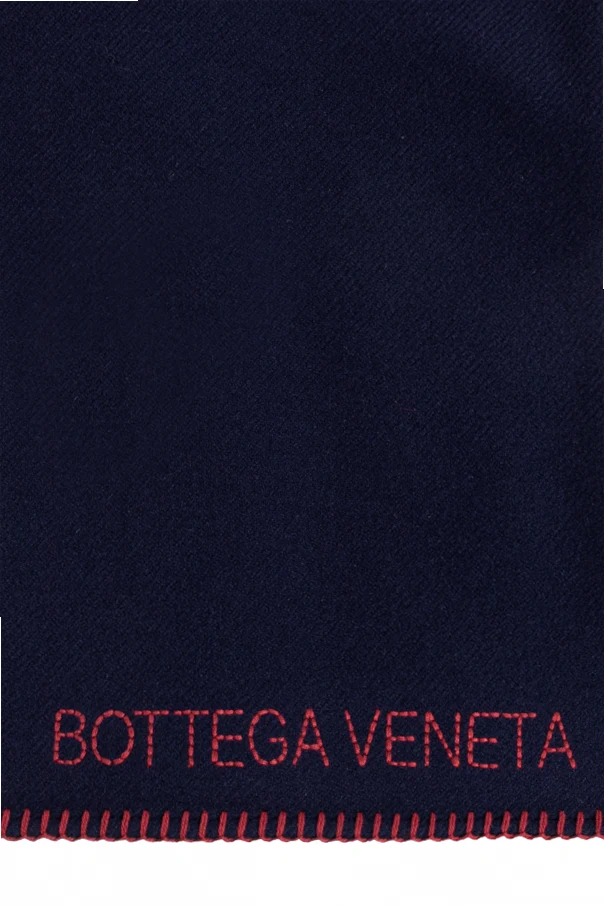 The understated elegance is accentuated by dense, decorative red stitching along the sides and edges, complemented by an expertly embroidered "BOTTEGA VENETA" logo in bold red thread at one corner—a hallmark of authenticity and distinction. Every element of this piece reflects meticulous attention to detail and the enduring sophistication for which Bottega Veneta is renowned.