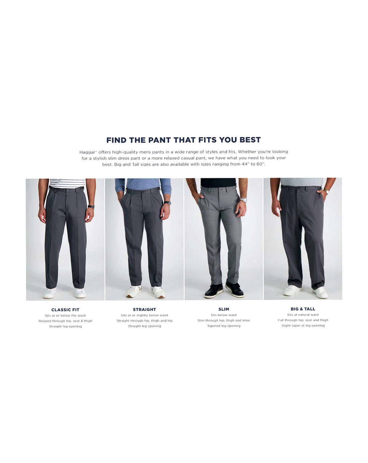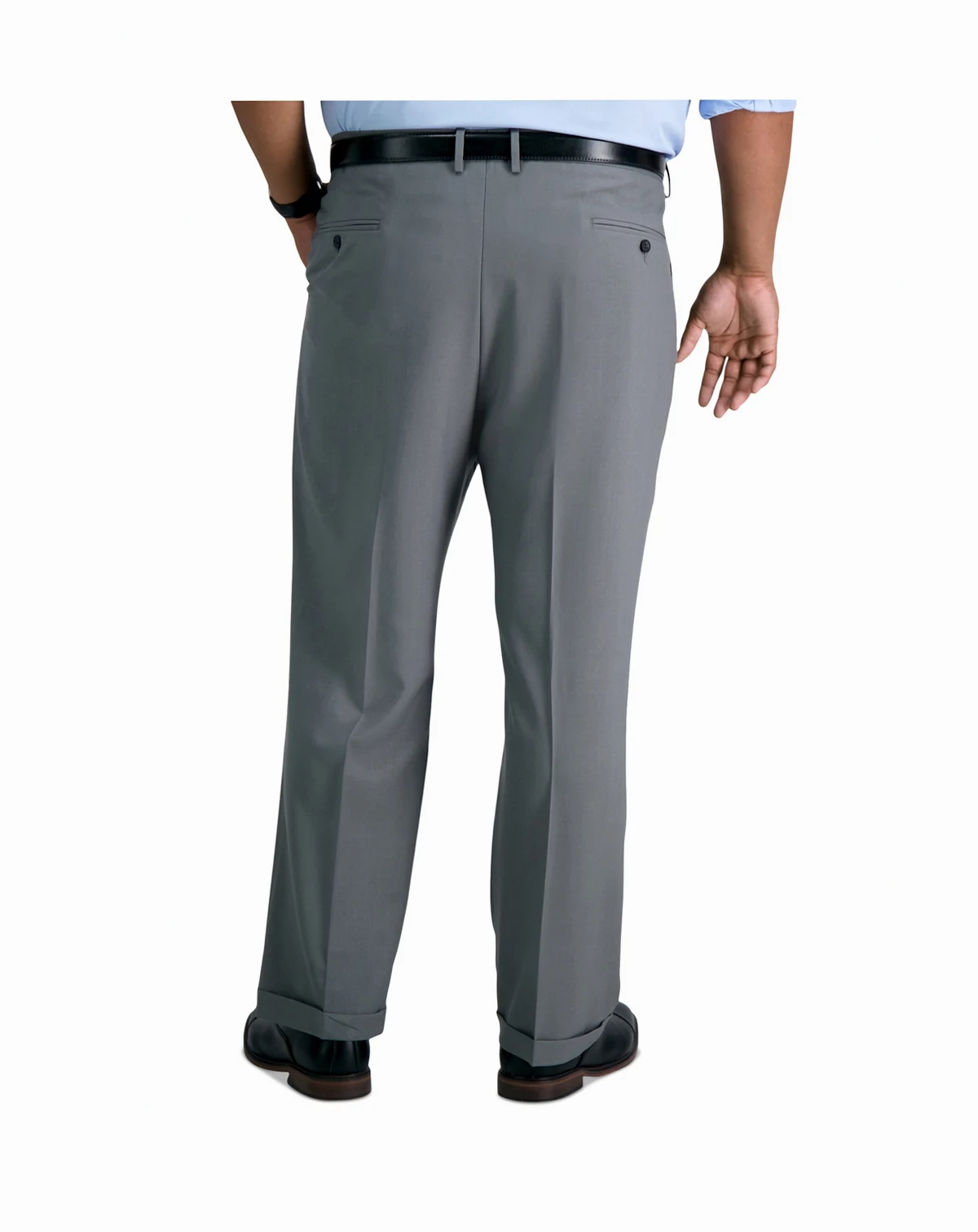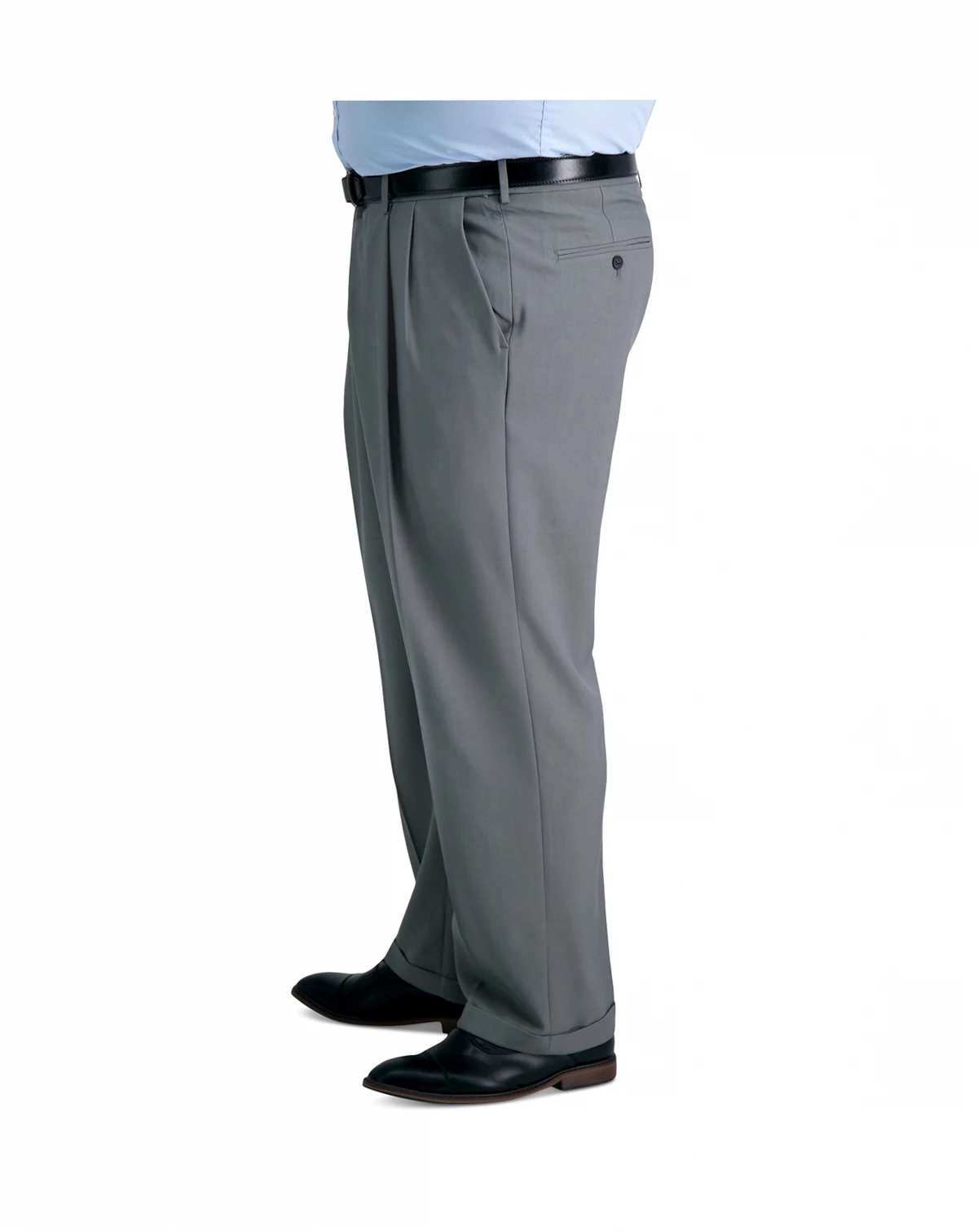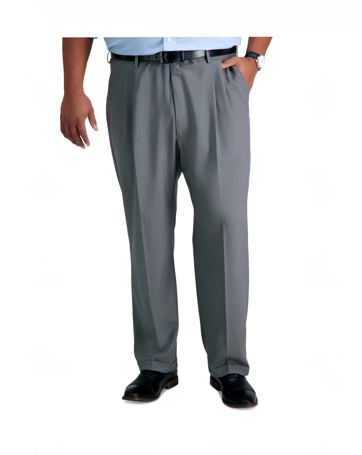Distinguish your office or weekend look with the classic style exuded by a pleated front and cuffs on these big & tall Haggar dress pants. Four-way stretch fabric and an expandable waistband provide exceptional comfort that matches their great look.