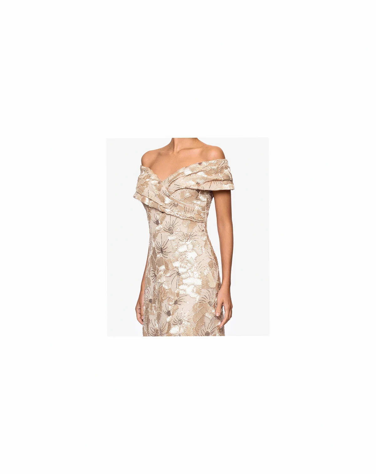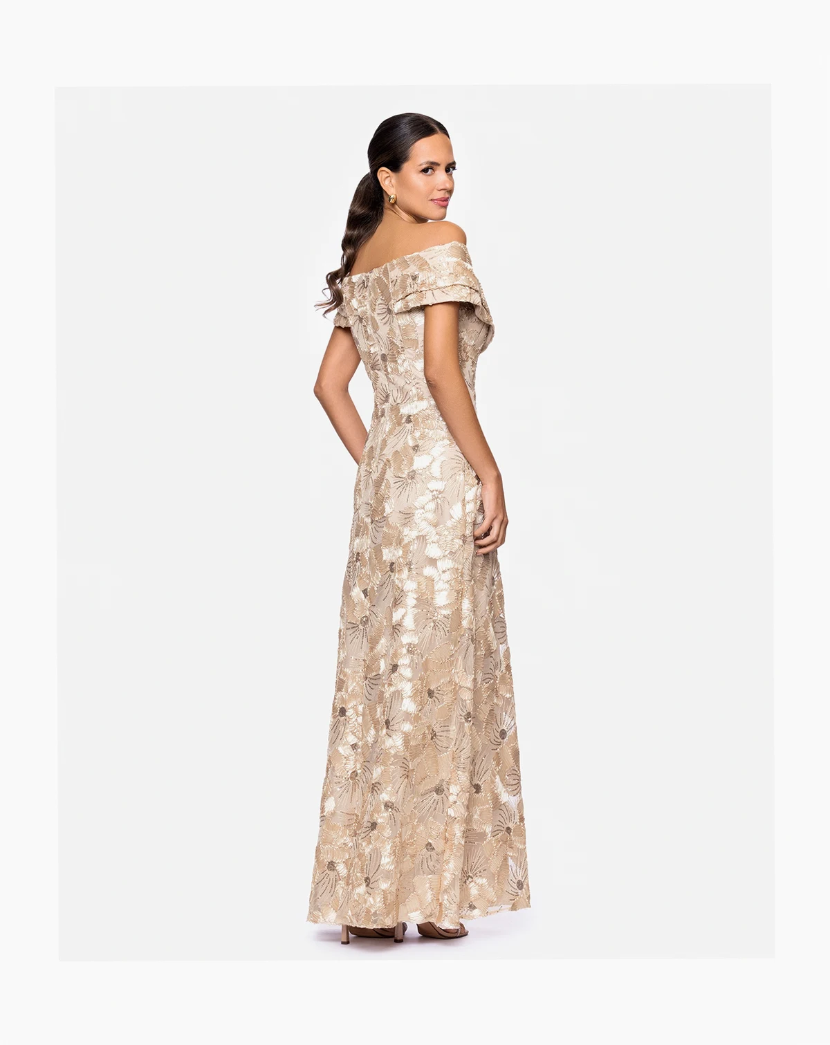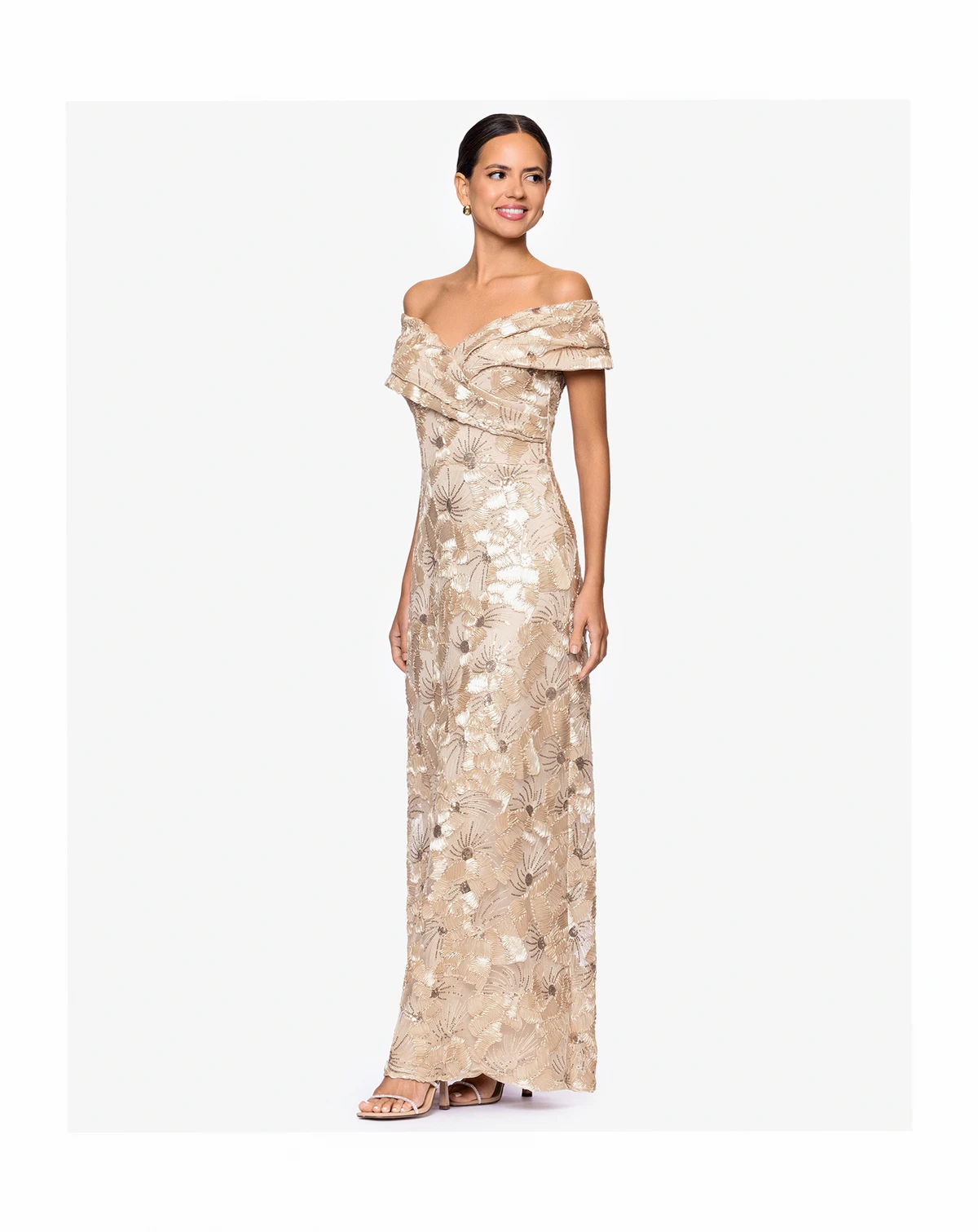 Radiate elegance in this gown by Betsy & Adam, an off-the-shoulder design with a soutache detail. The A-line silhouette and center back zipper offer a sophisticated, formal ensemble.