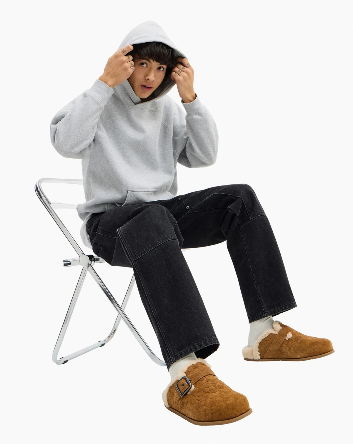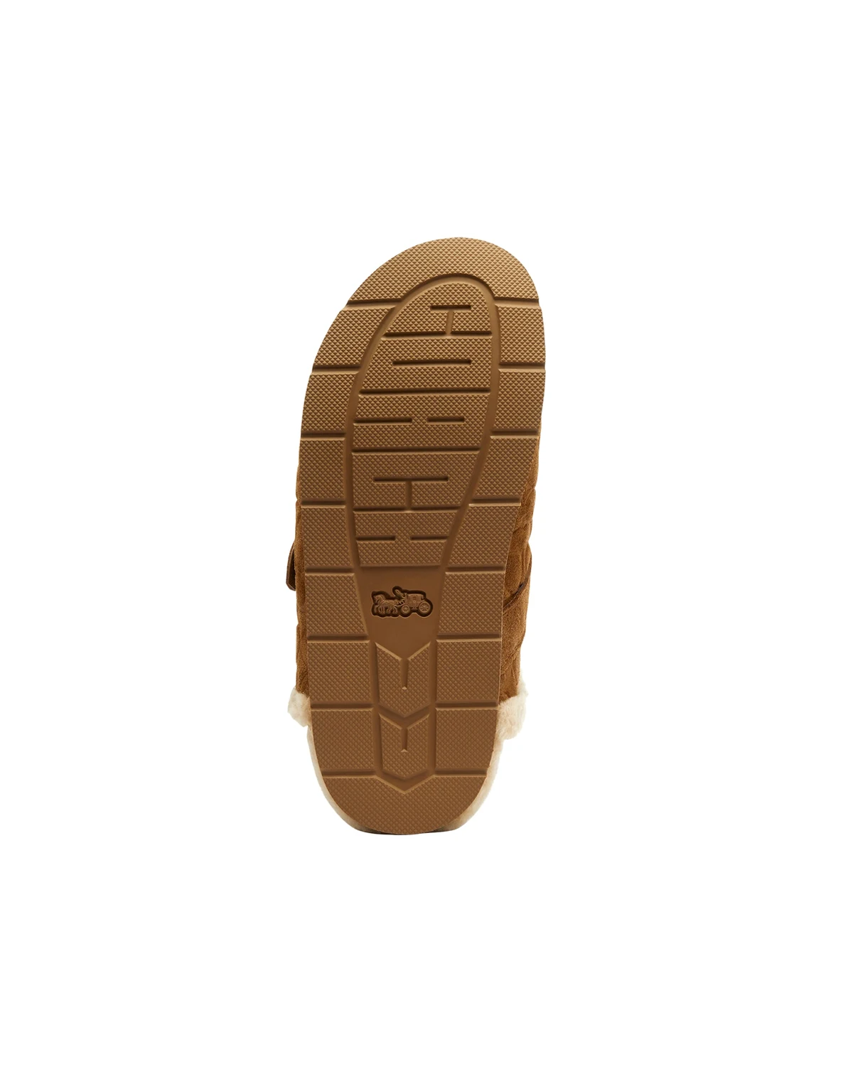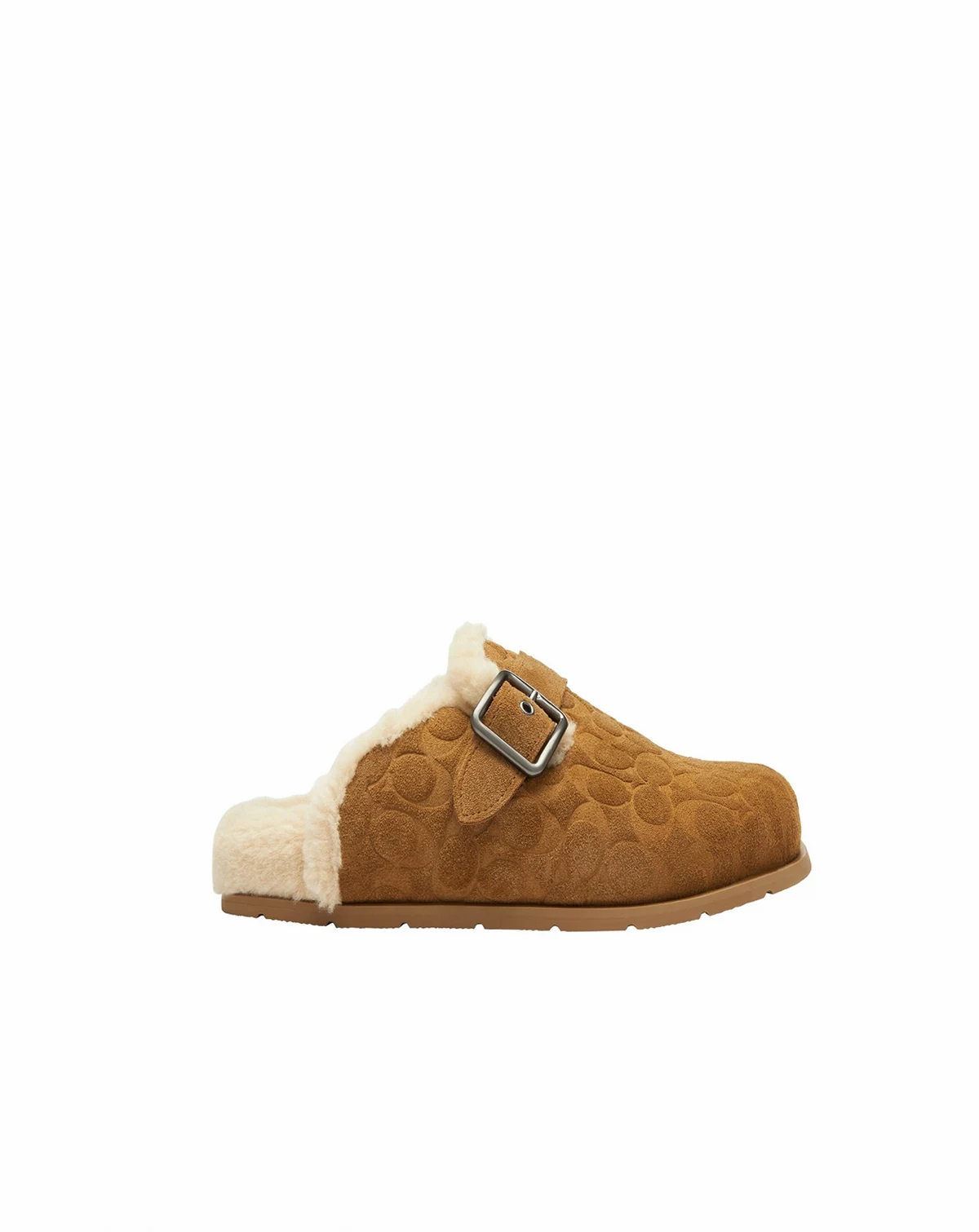 Designed with a comfortable shearling lining and footbed, these buckle clog slippers from COACH provide cozy warmth and cushioning. The suede upper and slip-on construction offer both style and easy wear for casual moments.