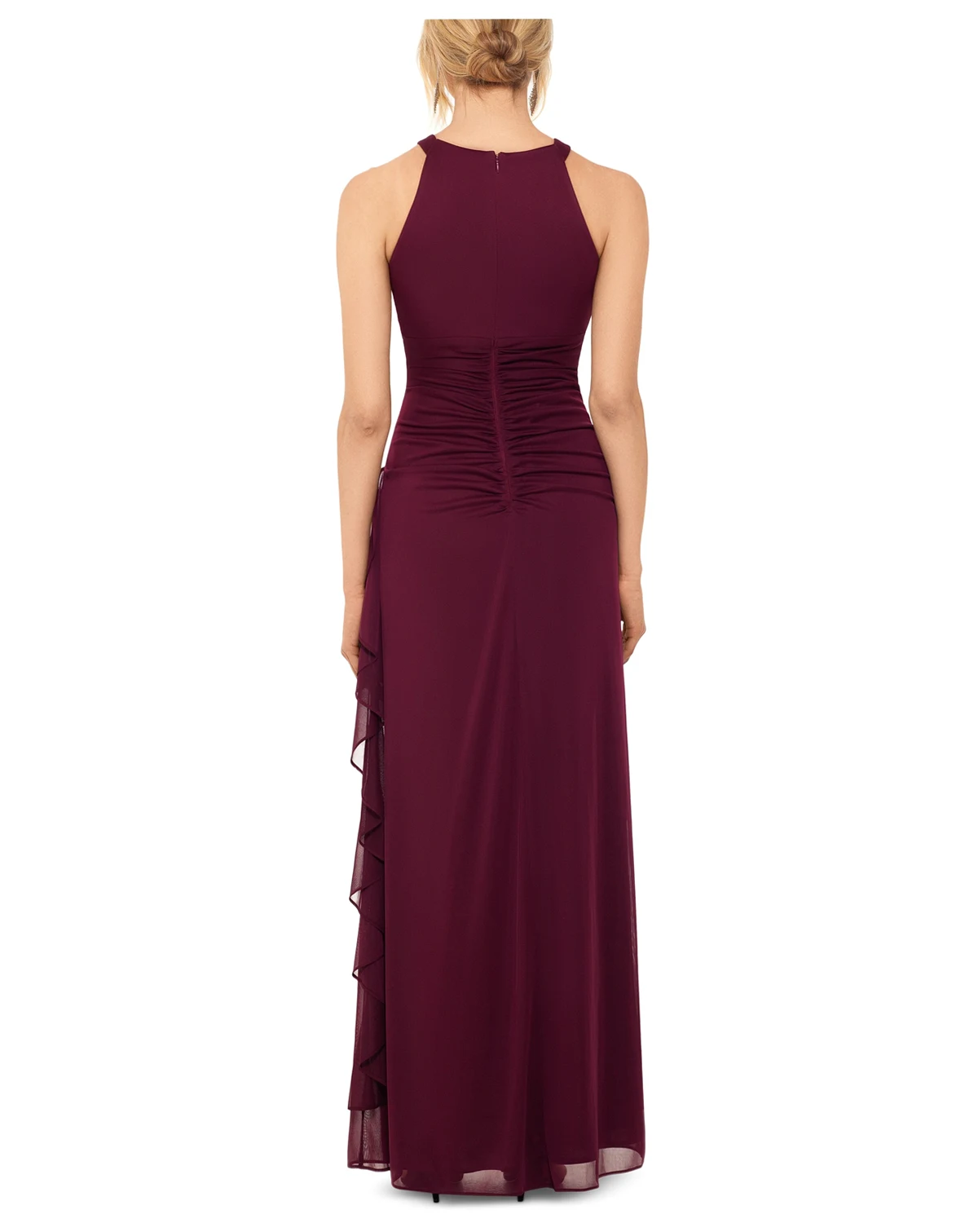 A halter neckline and a ruched silhouette makes this B&A by Betsy and Adam gown a standout choice for your next event.