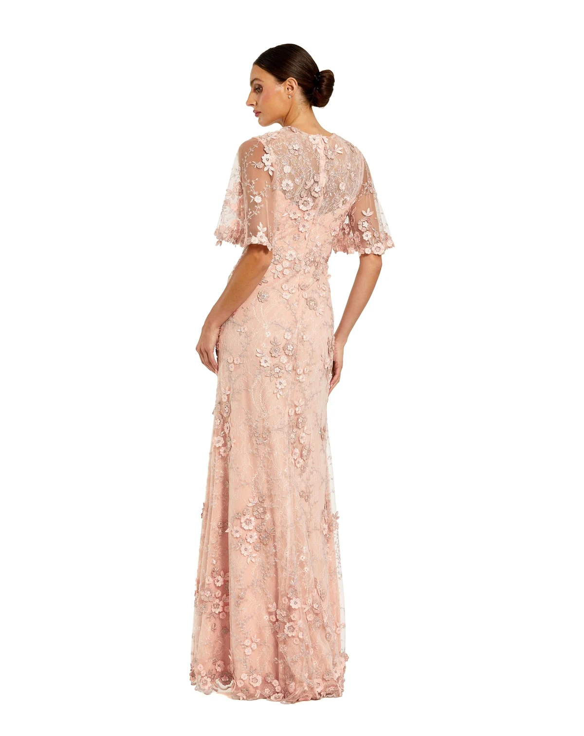 Grace meets sophistication in this embroidered evening gown featuring a high neckline, sheer short sleeves, and delicate floral lace. A fitted bodice flows into a floor-length skirt with allover embroidery, making it ideal for weddings, galas, and black-tie events.