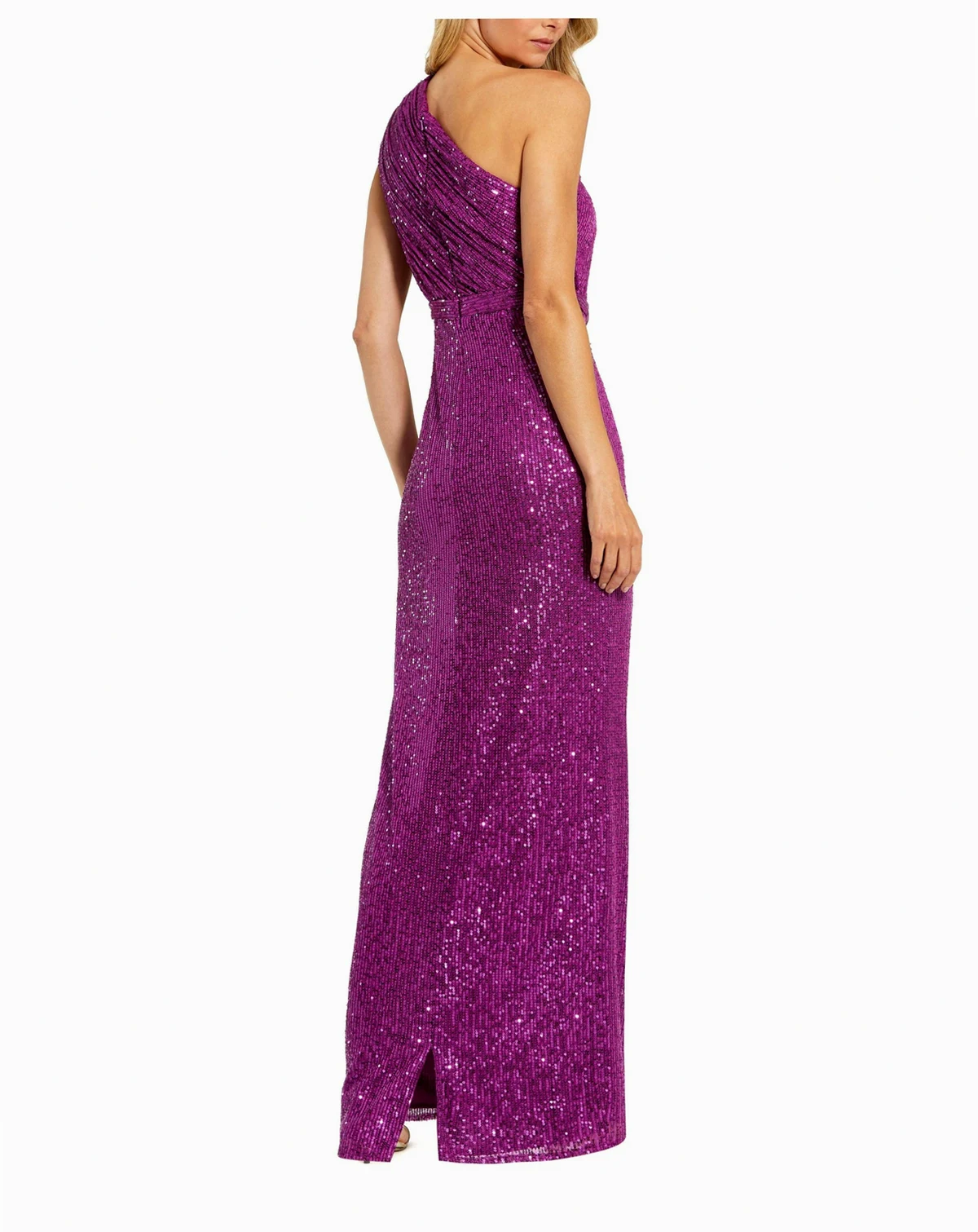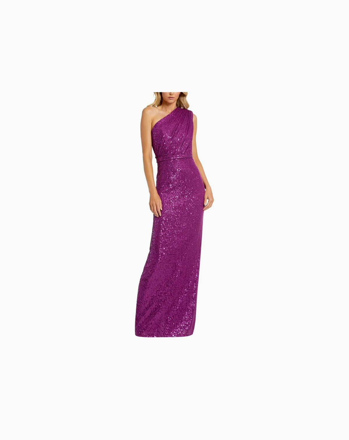Shine bright in this sequined ruched one-shoulder gown. Designed with a sleek sleeveless silhouette, shimmering sequin fabric, and a back vent for ease of movement, this show-stopping style is perfect for galas, weddings, and formal events.
