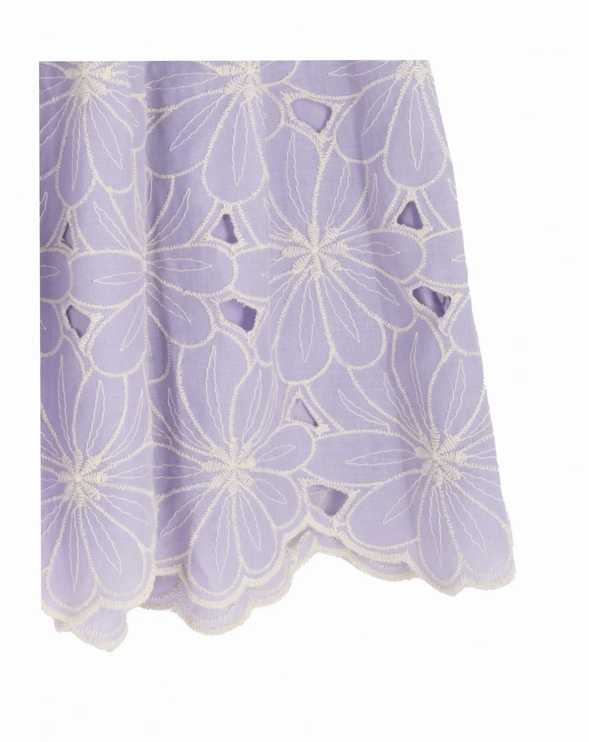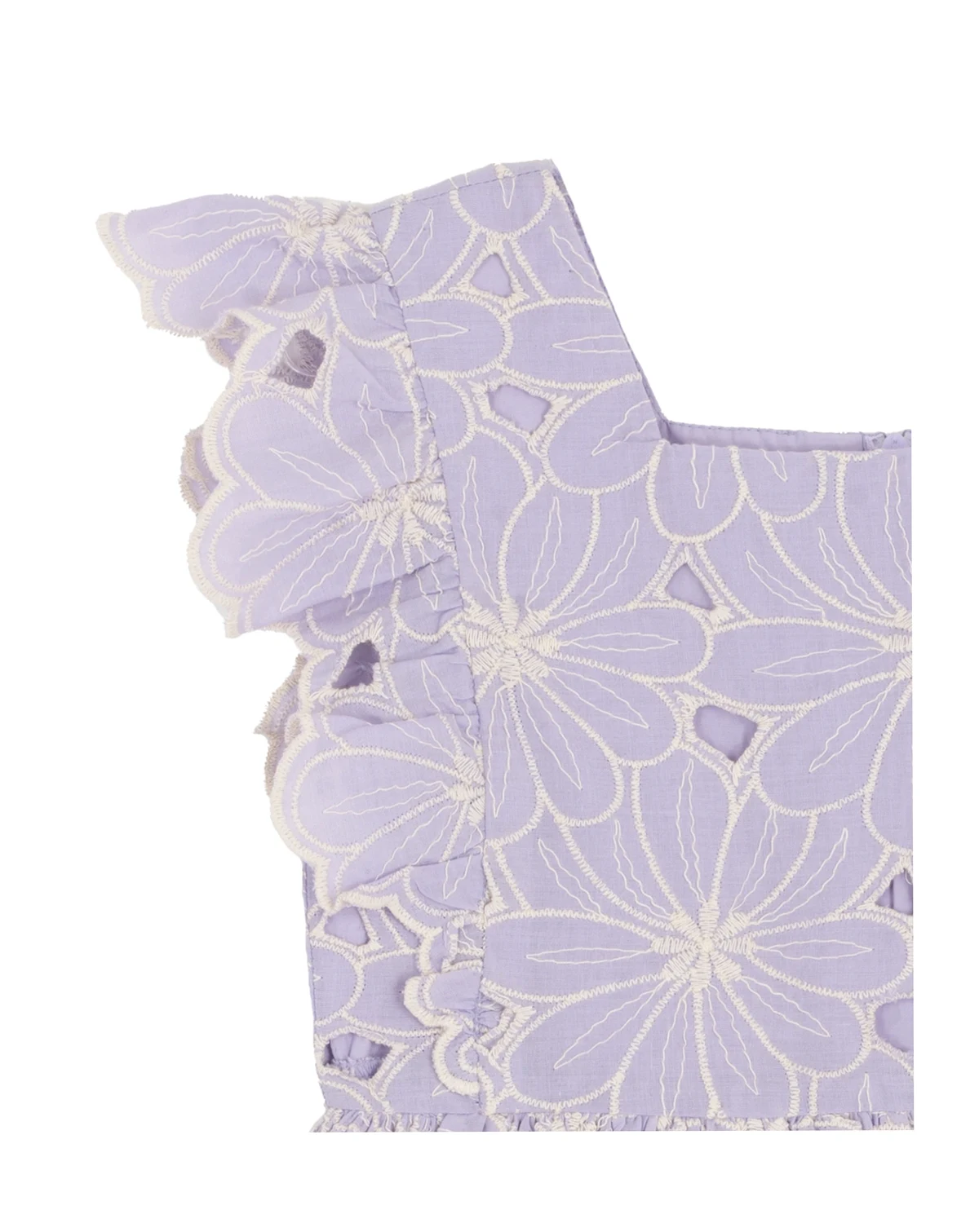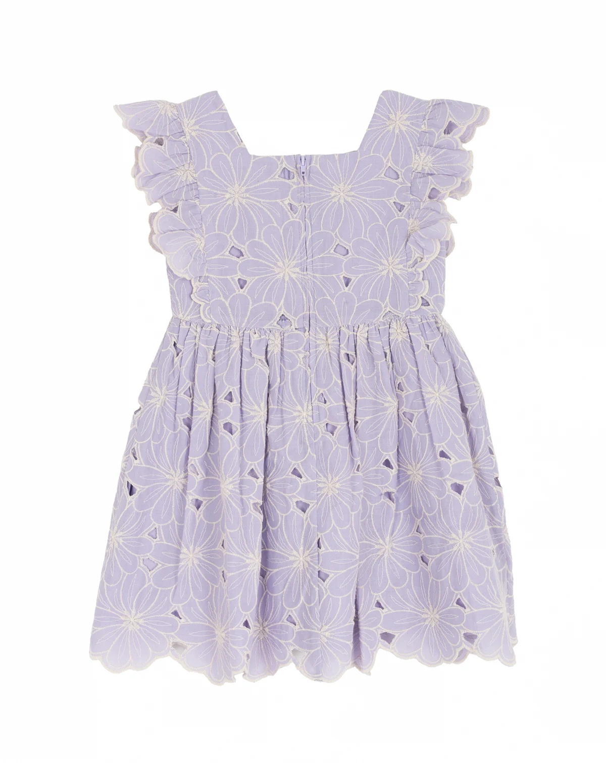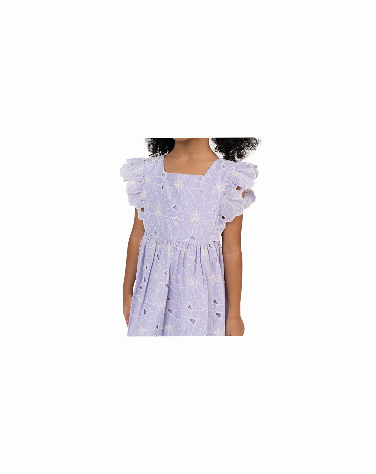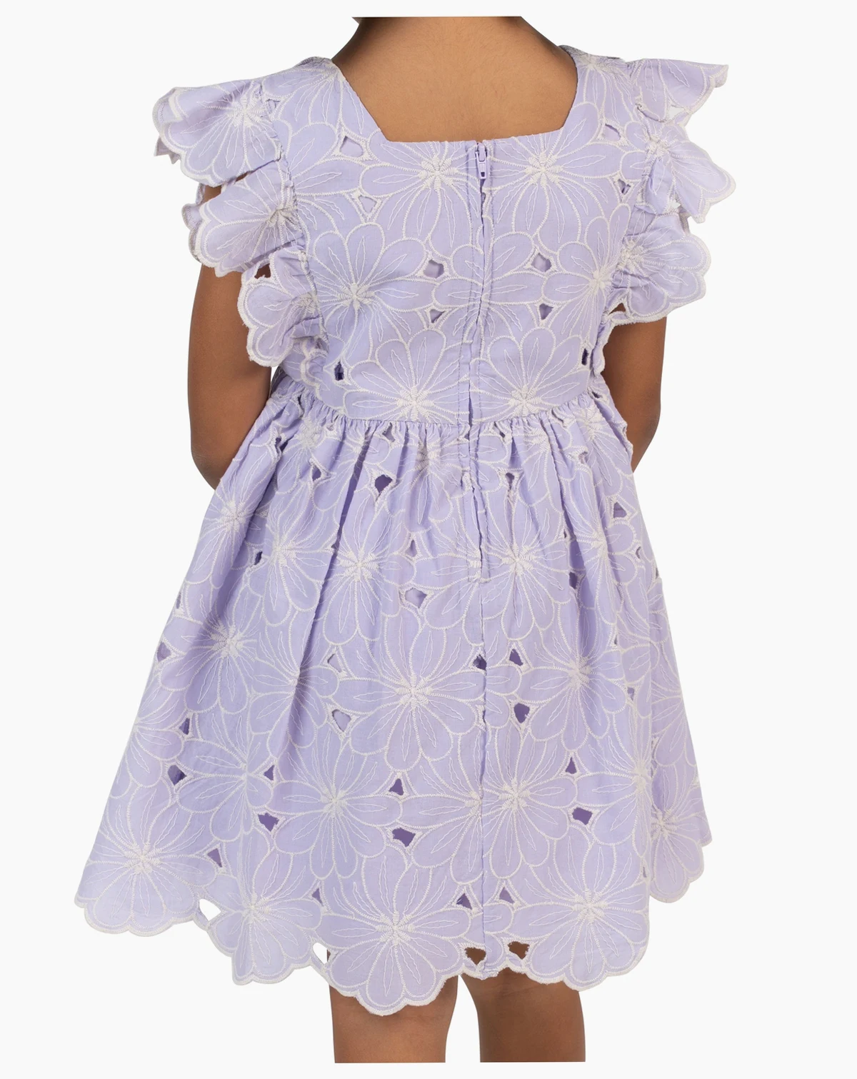 Enchant in floral beauty with this Rare Editions dress, featuring a dainty eyelet embroidery and a square neckline framed by flutter sleeves. A shirred border skirt creates delightful twirl with every step.