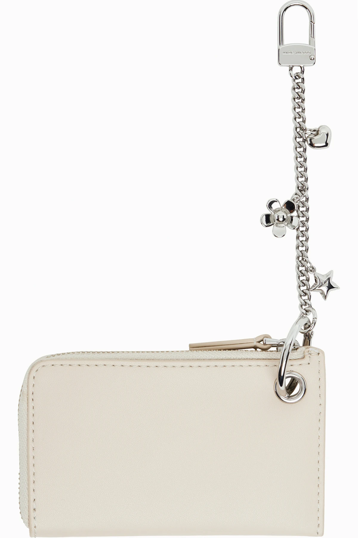 Buffed leather coin pouch. Detachable curb chain with charms and clasp at side.