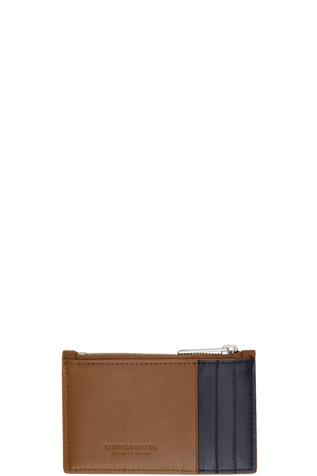 Intrecciato-woven grained lambskin card holder in brown and navy.