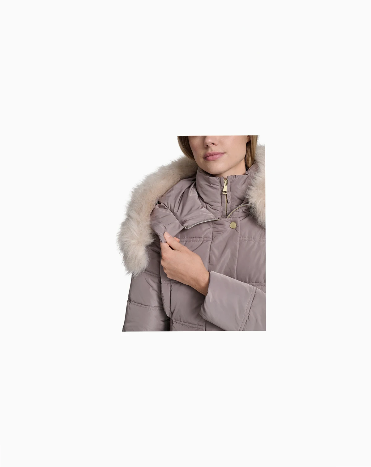 Shell: 100% polyester; trim: 76% acrylic, 15% modacrylic, 9% polyester; lining: 100% polyester; fill: 30% down cluster, 30% waterfowl feather, 40% polyester