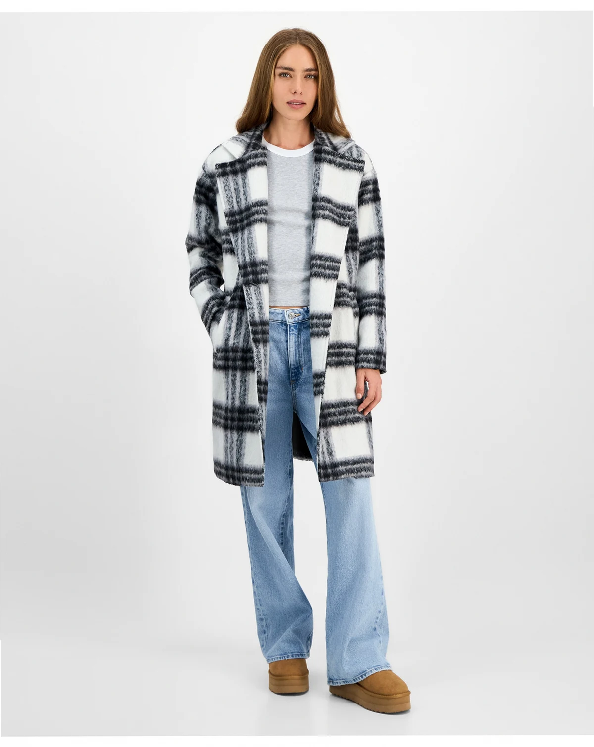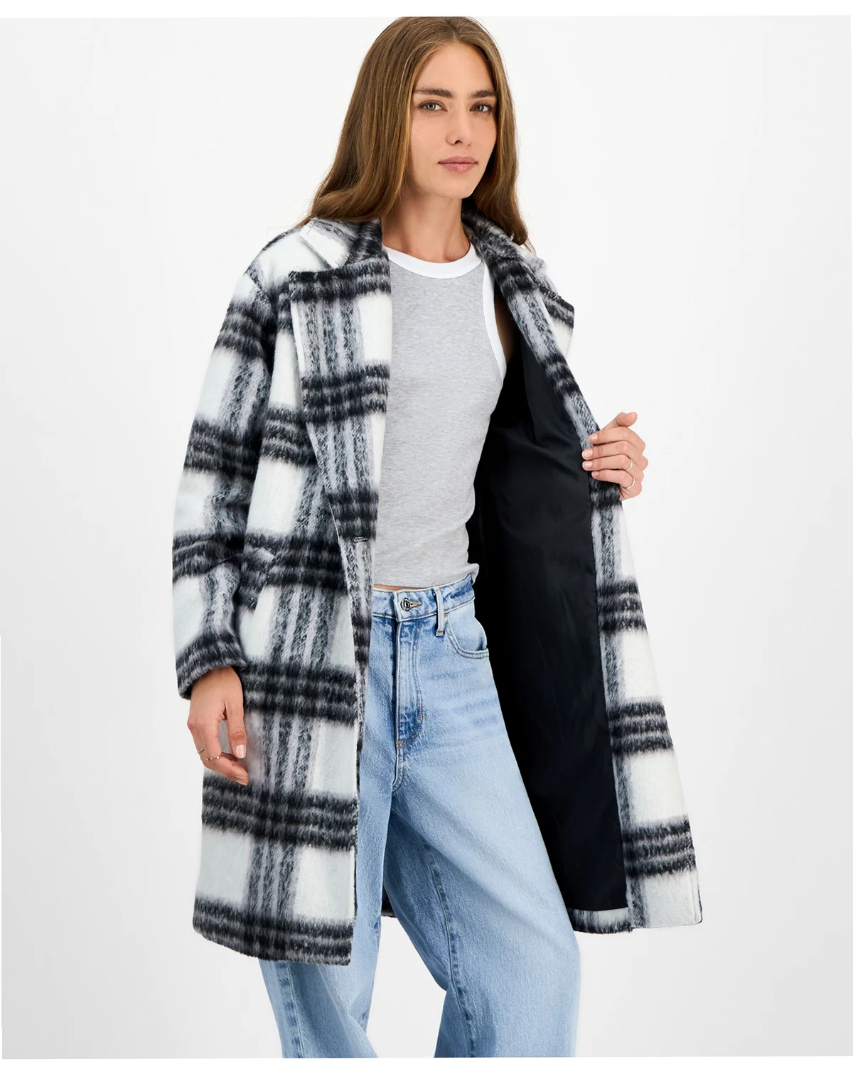 You'll be total style goals in this cozy plaid coat from Jou Jou designed with a single button to cinch the waistline.