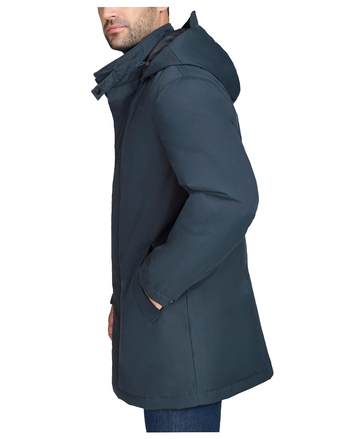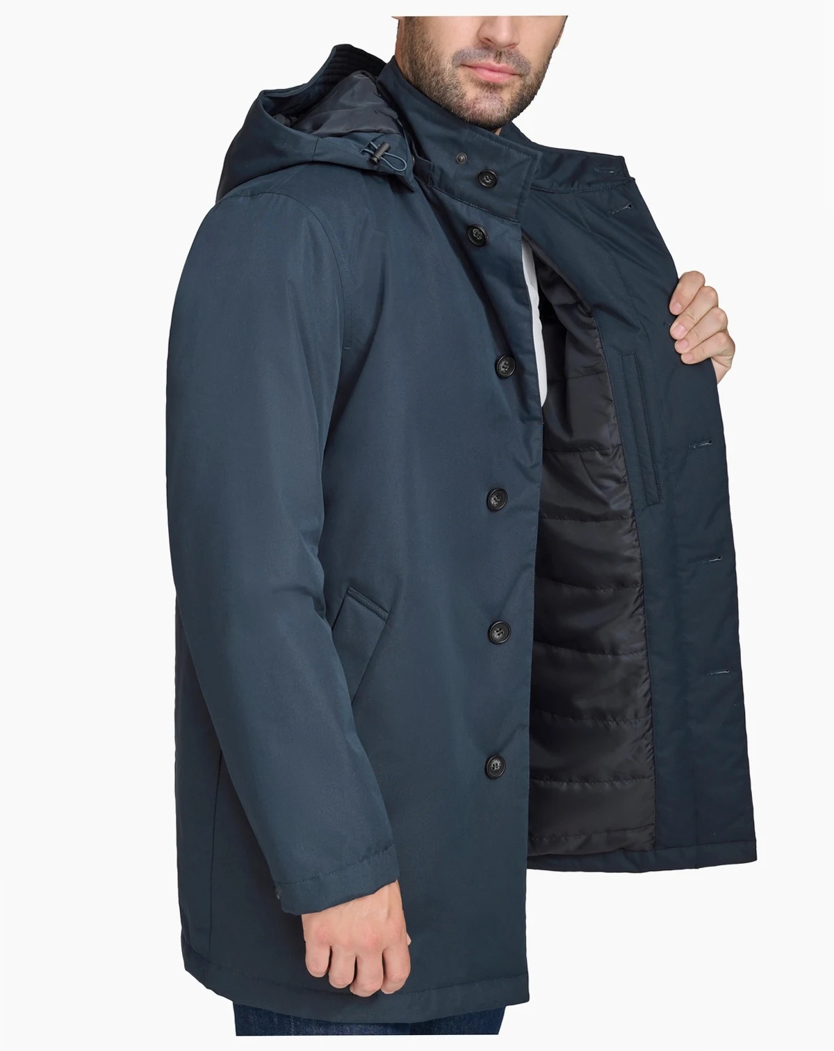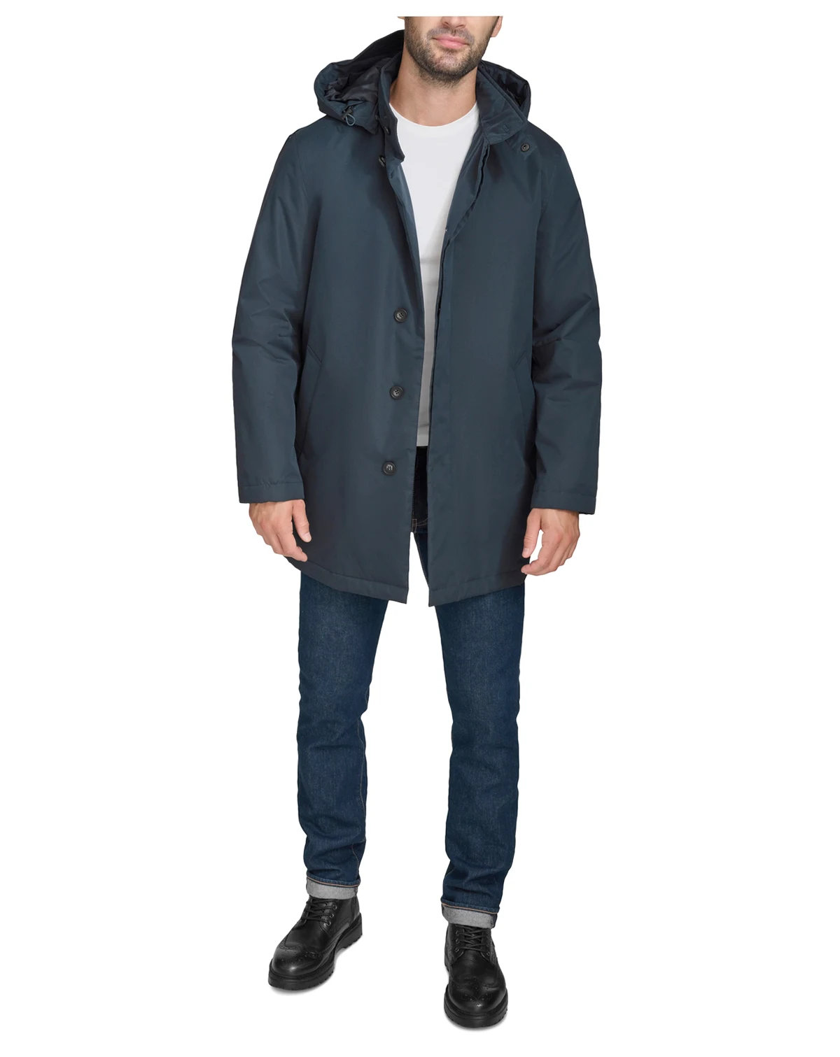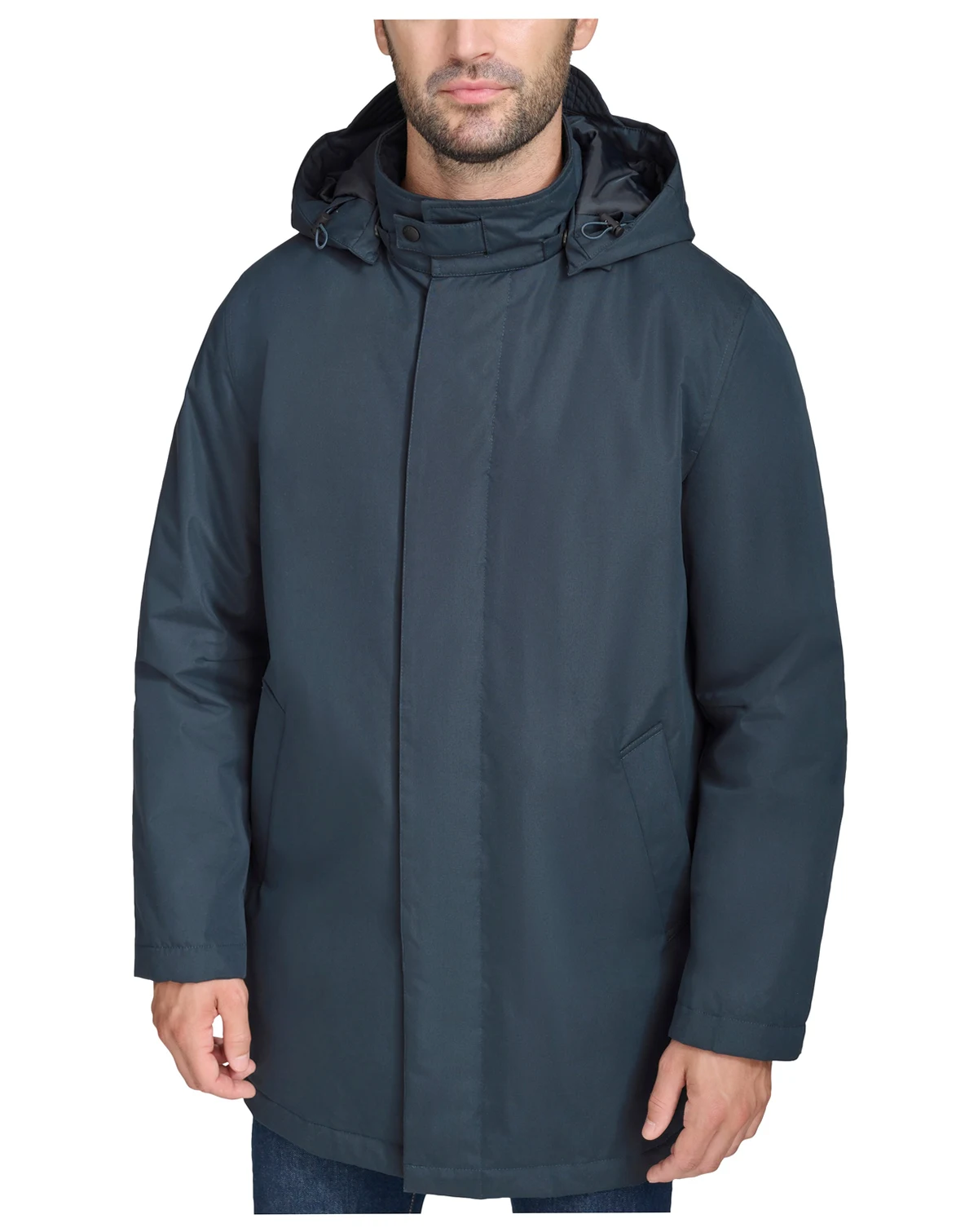 Stay stylish and dry through the storm with this rain coat from Cole Haan, featuring a detachable hood with an extended brim and a covered placket to help keep the elements at bay.
