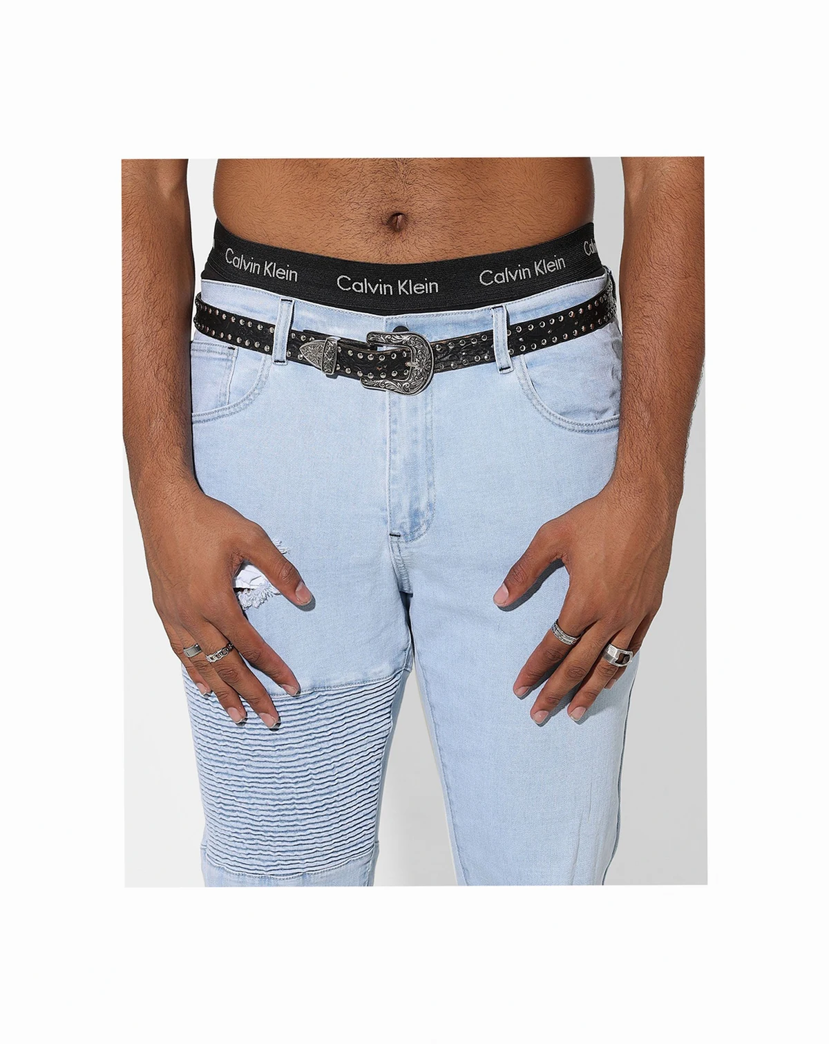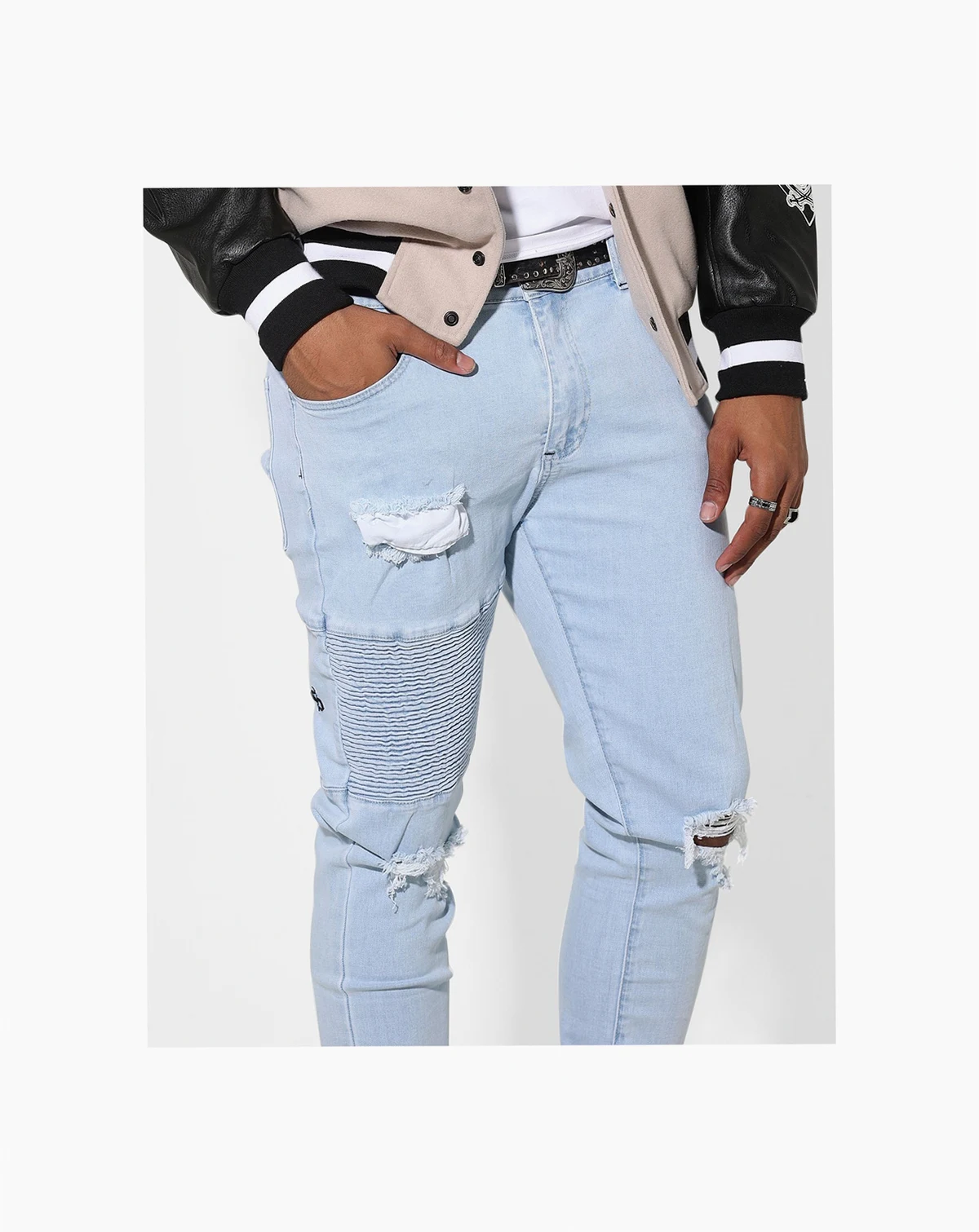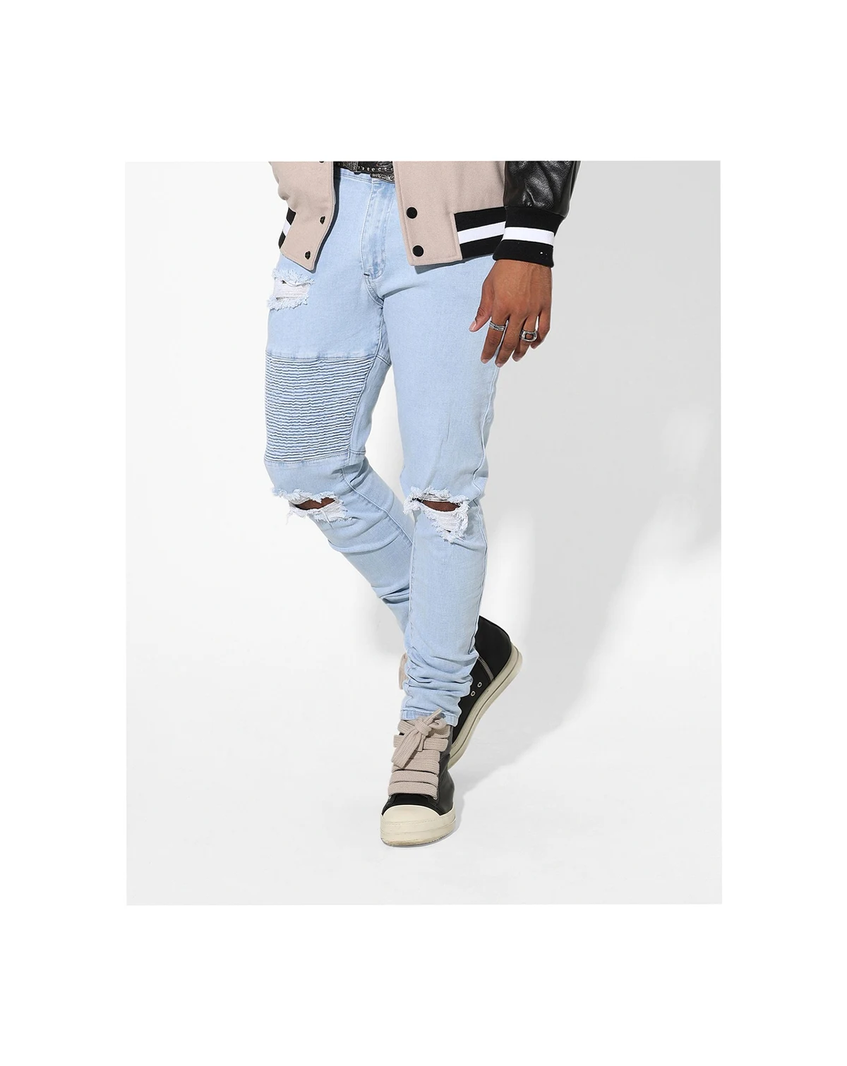 A new jean for a new season! Featuring, heavy distressing on the front of the legs and minimal stretch, these skinny fit jeans are at the top of their class. Other features include ribbed biker panels and a 5 pocket design.