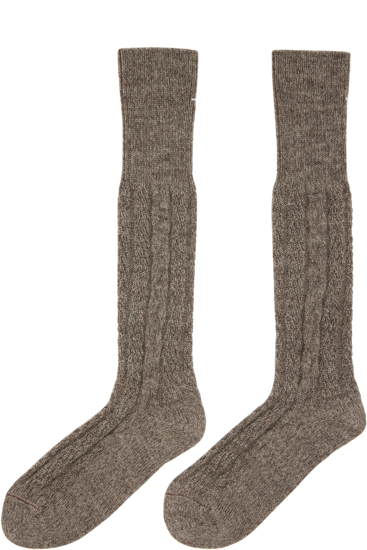 Pair of knee-high cable-knit virgin wool socks. Signature white stitching at rib knit cuff.