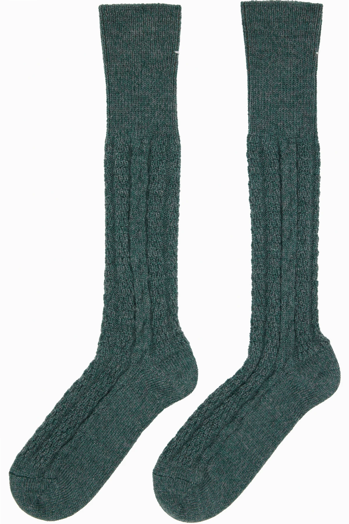 Pair of knee-high cable-knit virgin wool socks. Signature white stitching at rib knit cuff.