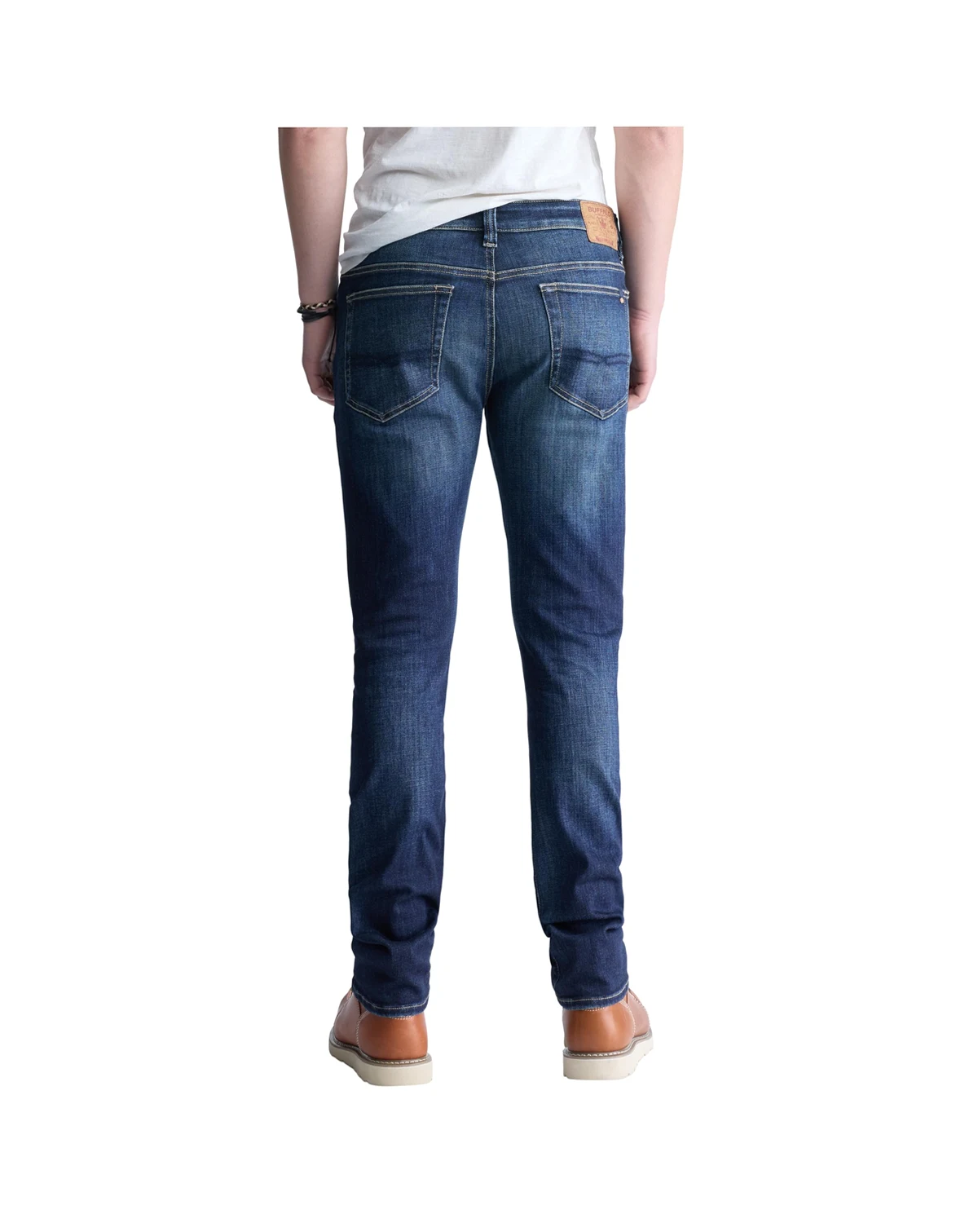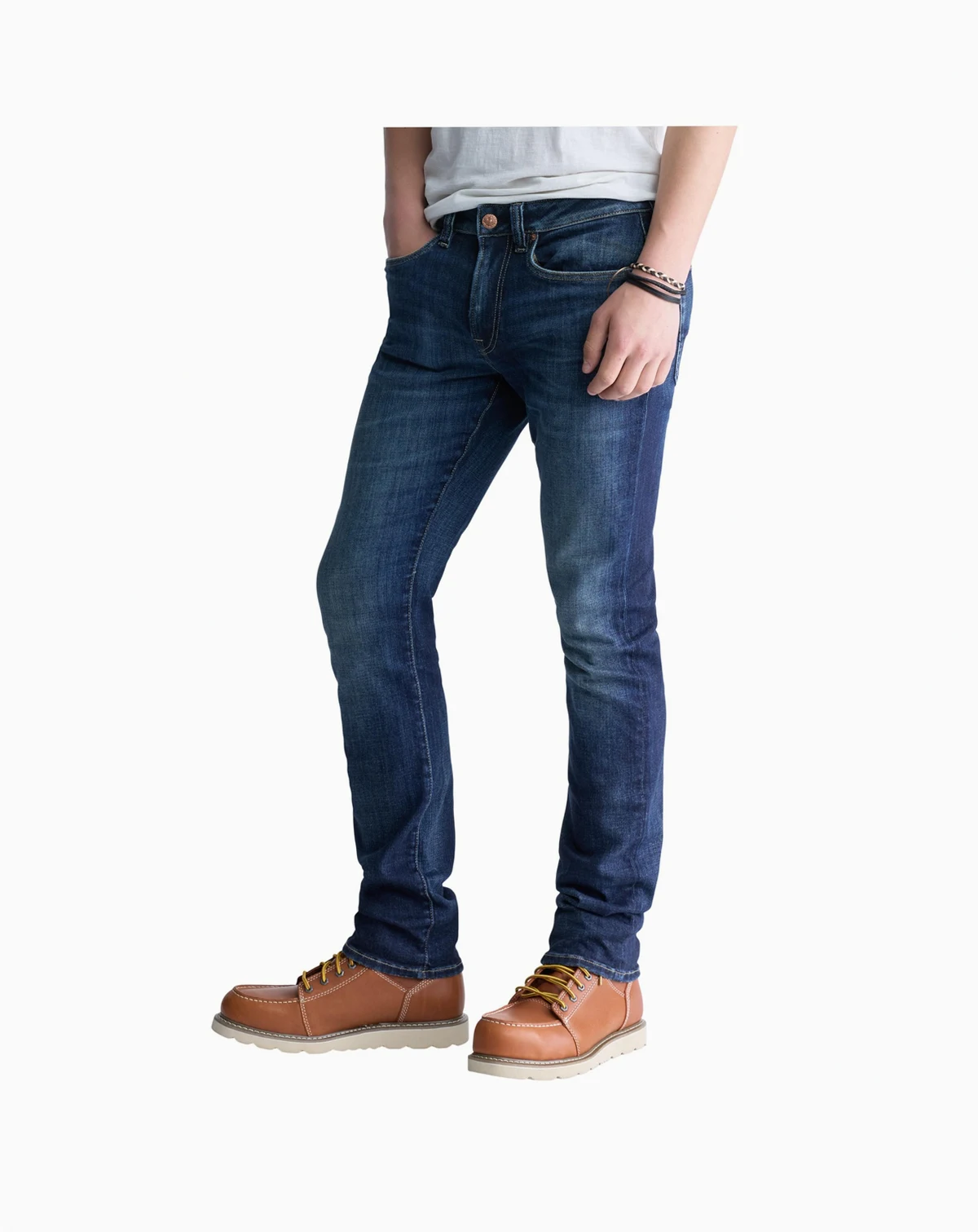 Slim-fit stretchy jeans with a slightly faded blue wash on the front and back pockets.; Machine washable