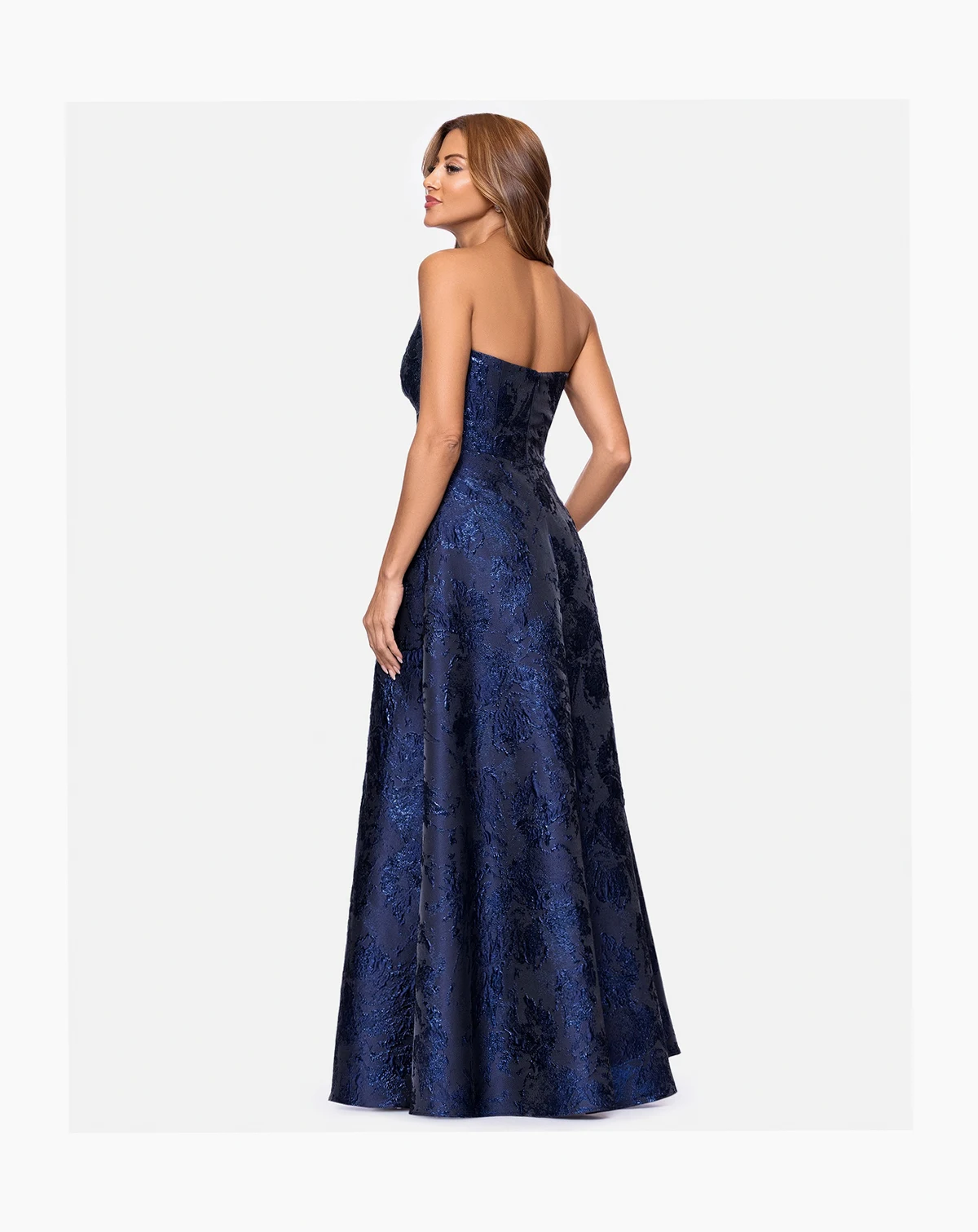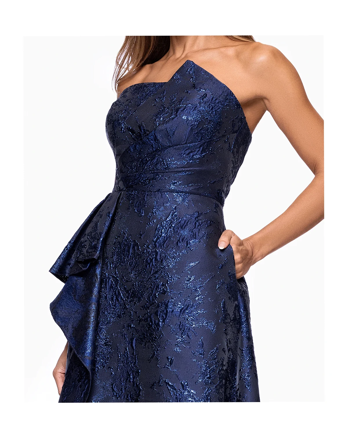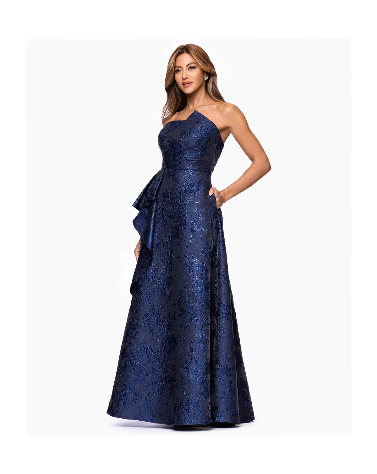 Enjoy asymmetric elegance in this XSCAPE long brocade gown. The ruffle neck and zipper closure provide a unique, stylish option for special events.