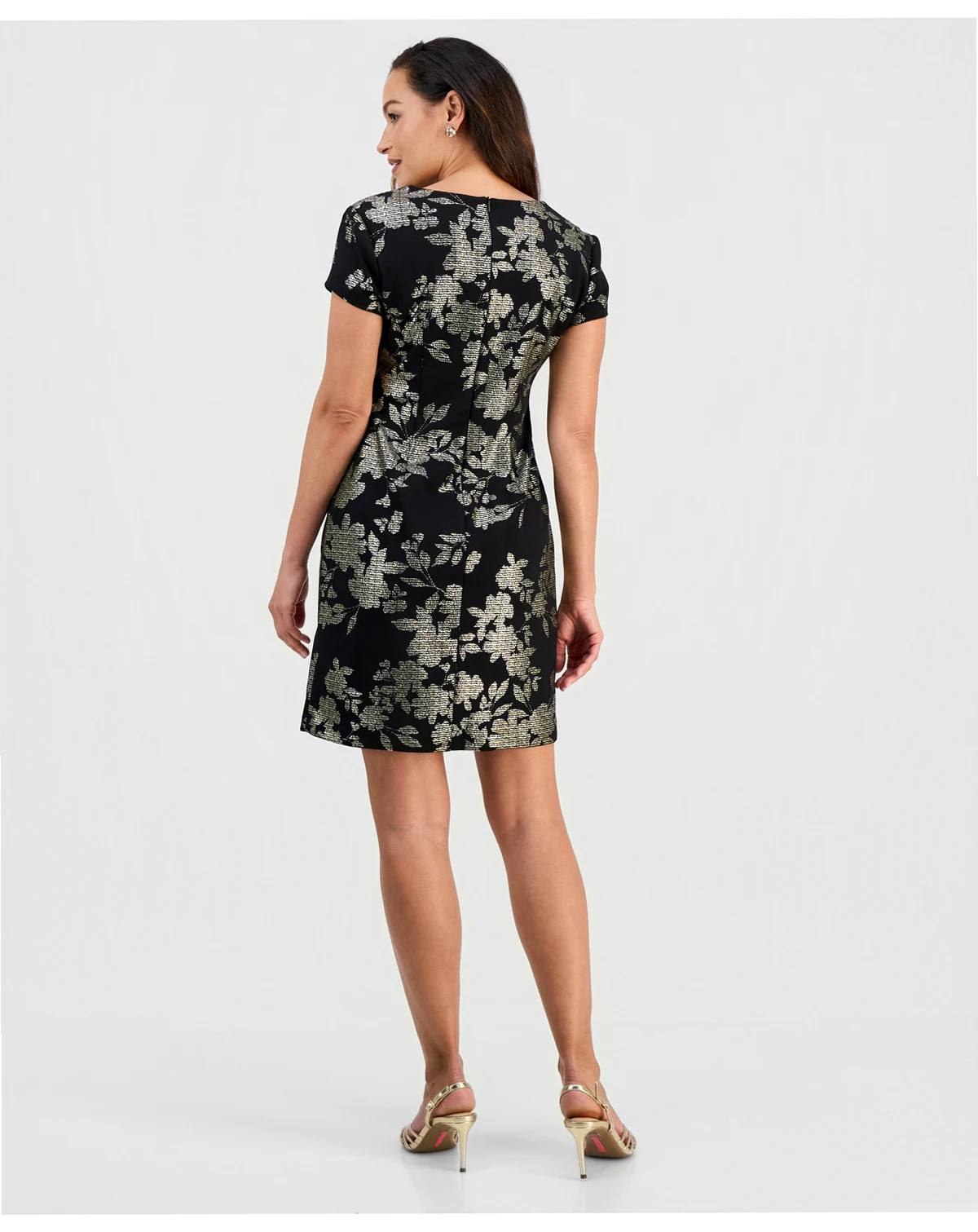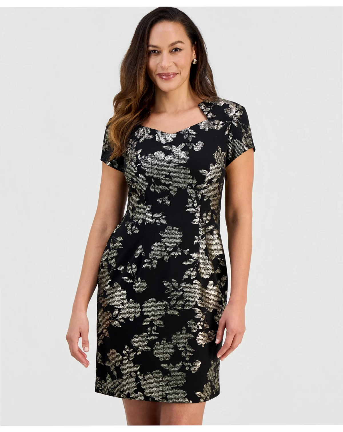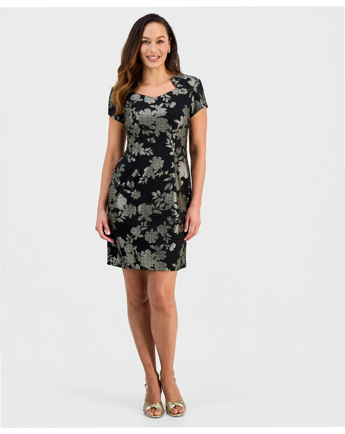 A metallic floral print brings glamourous contrast to this petite dress from Connected, making this short-sleeve sheath design a perfect choice for your next special event.