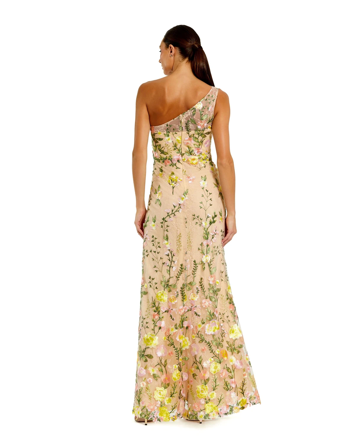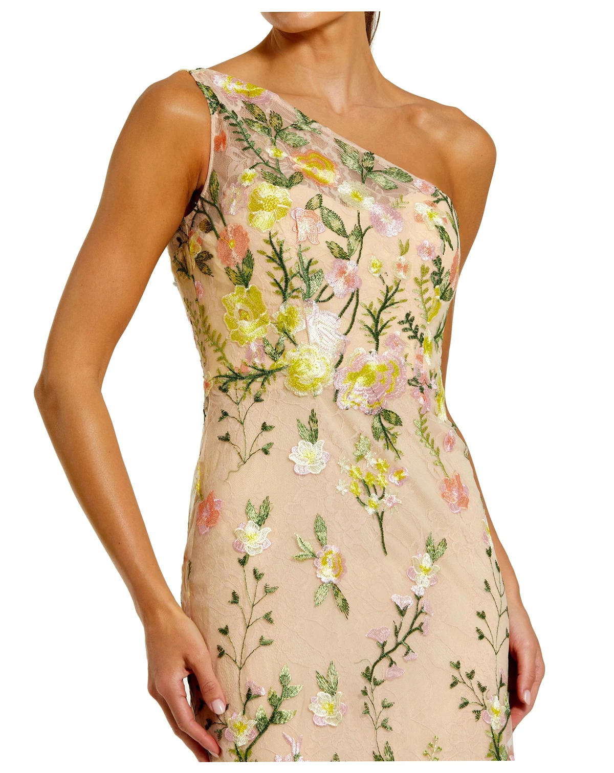 Embrace elegance in this one-shoulder lace gown, featuring intricate floral embroidery and a flowing silhouette. Perfect for weddings, galas, and special occasions.