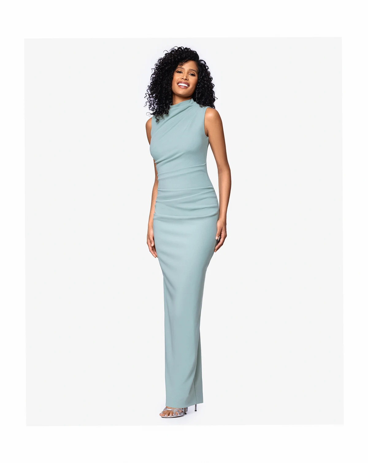 Embrace modern elegance with mock neck styling and ruched detailing on this Betsy & Adam gown. A sleeveless sheath silhouette provides a sleek look for special events.