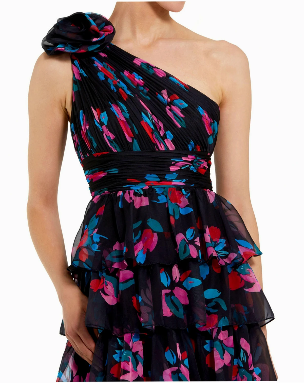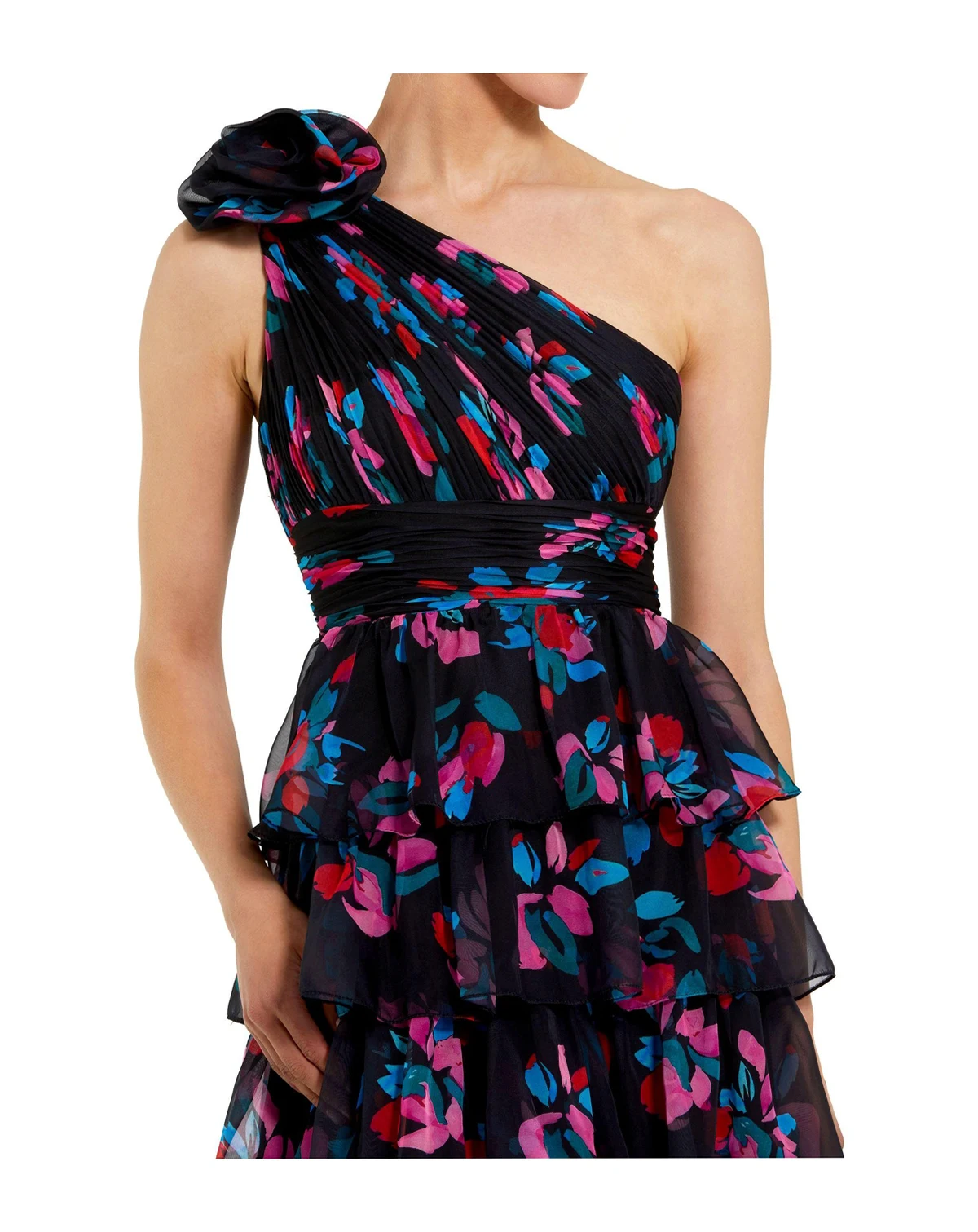 This stunning gown is crafted from airy chiffon fabric, featuring a tiered ruffle skirt and a ruched bodice for a chic touch. The one-shoulder neckline creates a beautifully unique silhouette, perfect for making a statement at any special occasion.