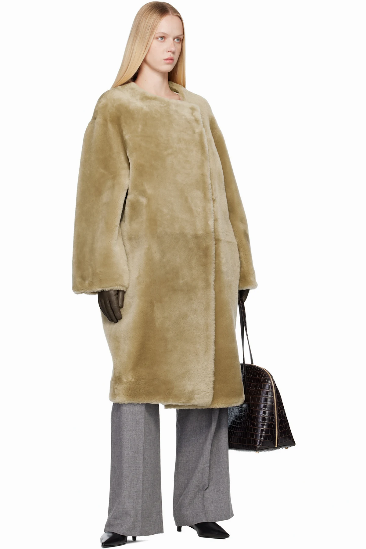Body: 100% lambskin. Lining: 50% cashmere, 50% wool.
