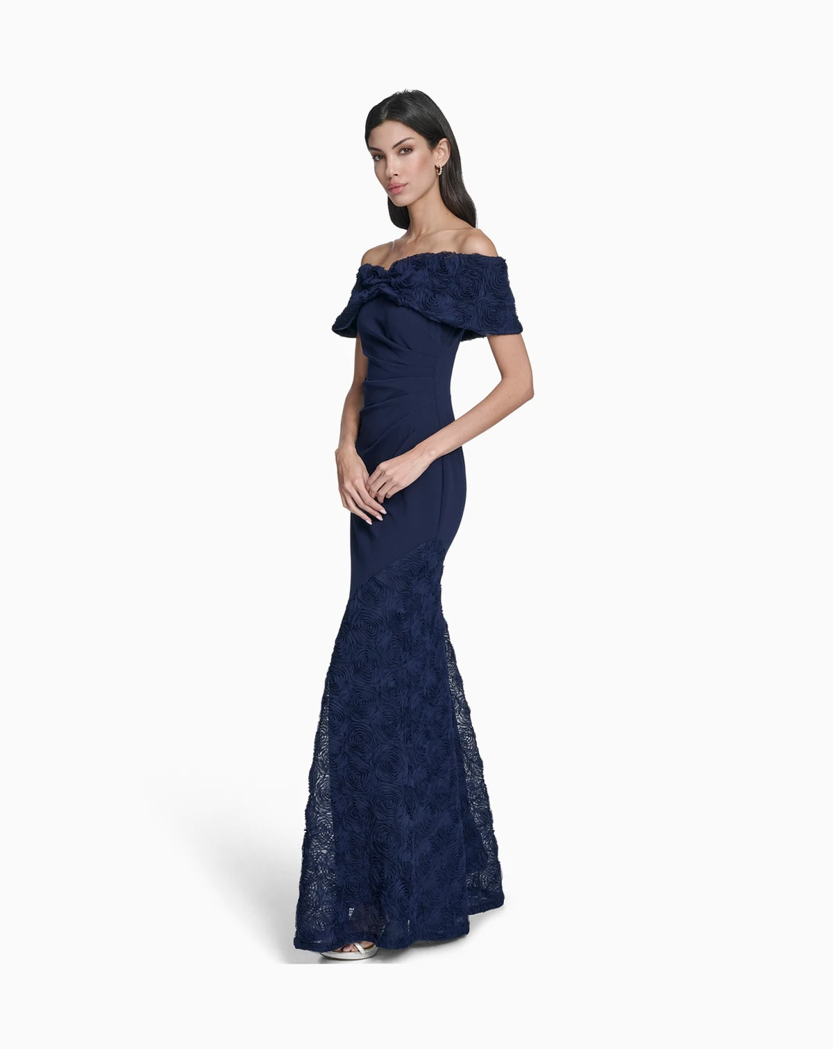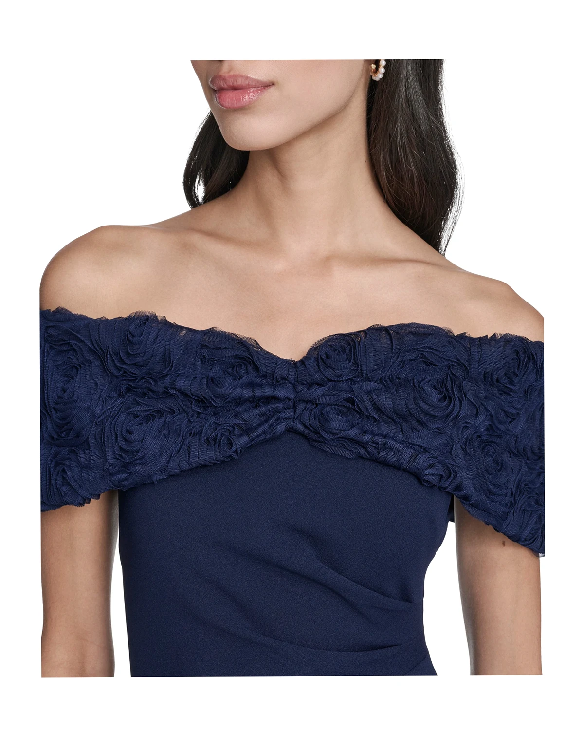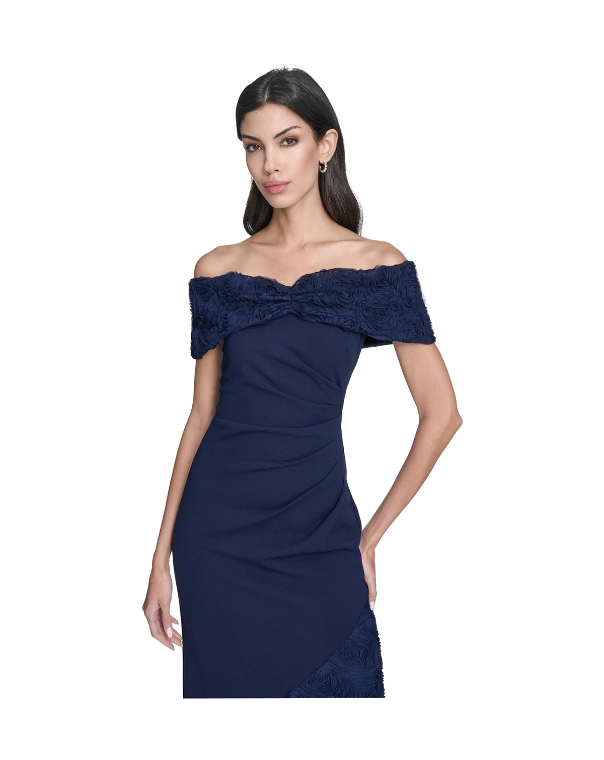 A stunning off-the-shoulder neckline and side tuck detail create a romantic silhouette in this Eliza J gown. The sleeveless design and long length contribute to its elegant, flowing appeal.