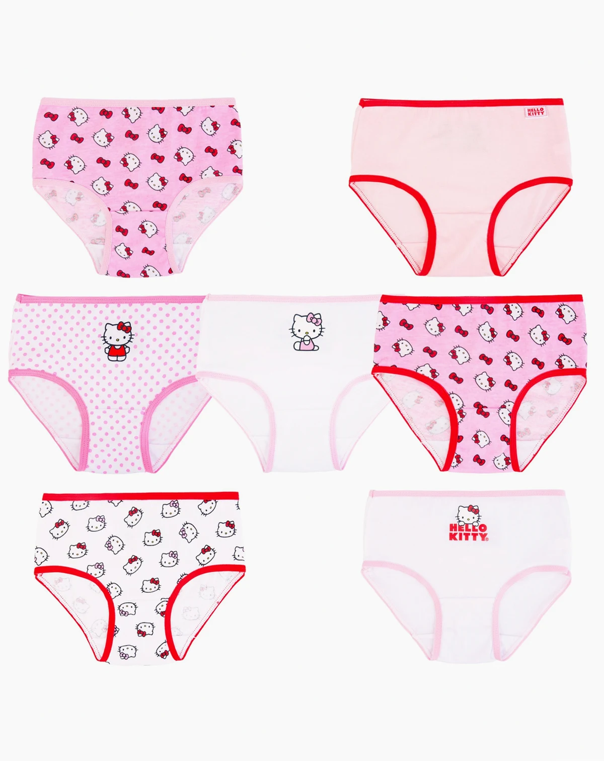 Hello Kitty themed prints bring a fun look to underwear collection 100% cotton fabric ensures soft and breathable comfort tagless 100% cotton fabric ensures soft and breathable comfort Includes 7 Briefs